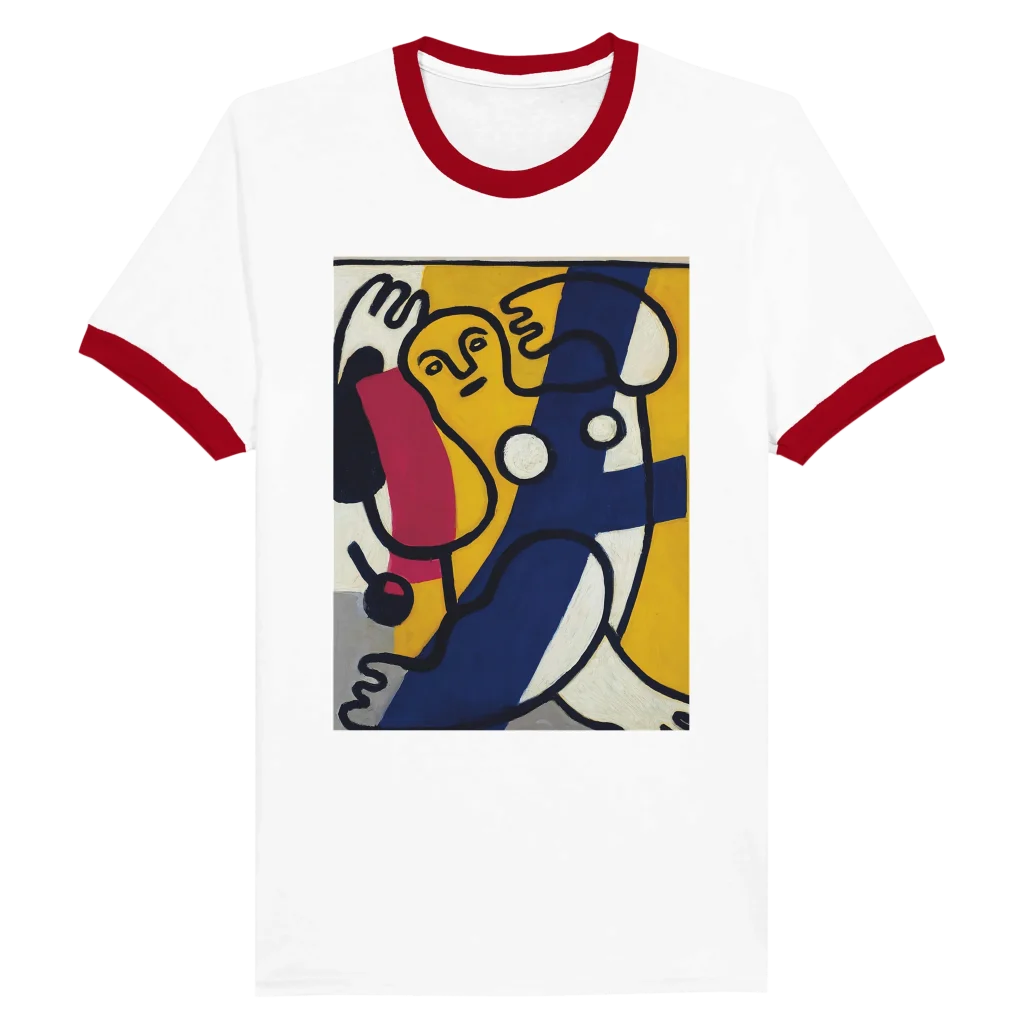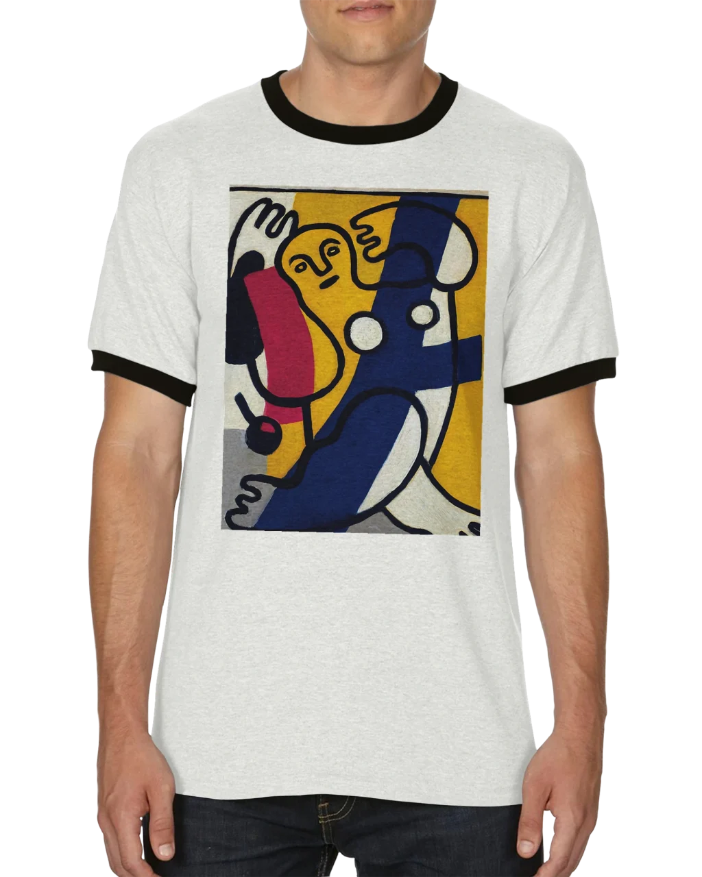 Unleash your inner art connoisseur with our exclusive Abstract ’43 Elegance Ringer T-shirt. Inspired by the vibrant and dynamic interplay of shapes and colors from a timeless masterpiece, this tee is more than just clothing—it’s wearable art. The striking balance of bold yellow, deep blue, and rich magenta, outlined with expressive black lines, brings a sophisticated yet playful energy to your everyday wardrobe.