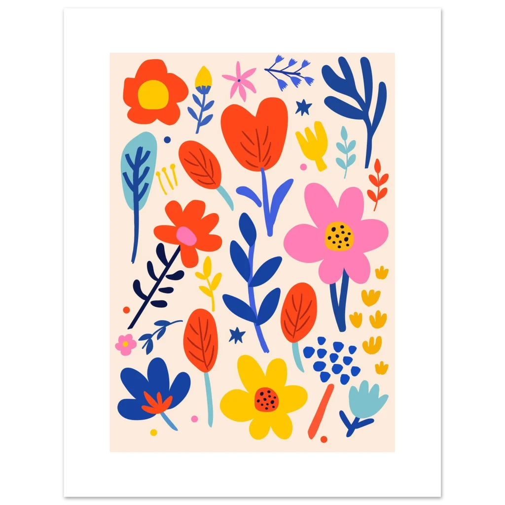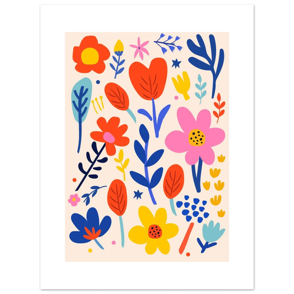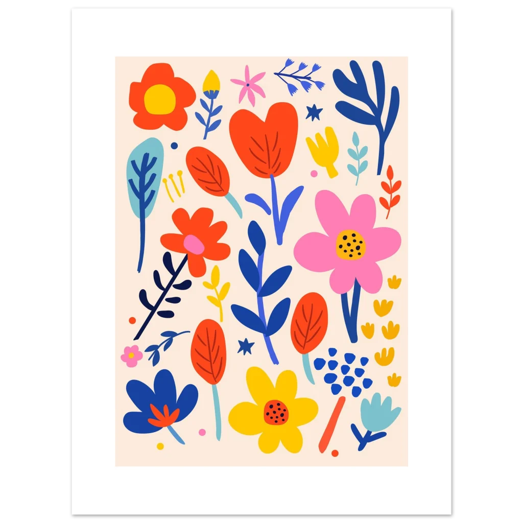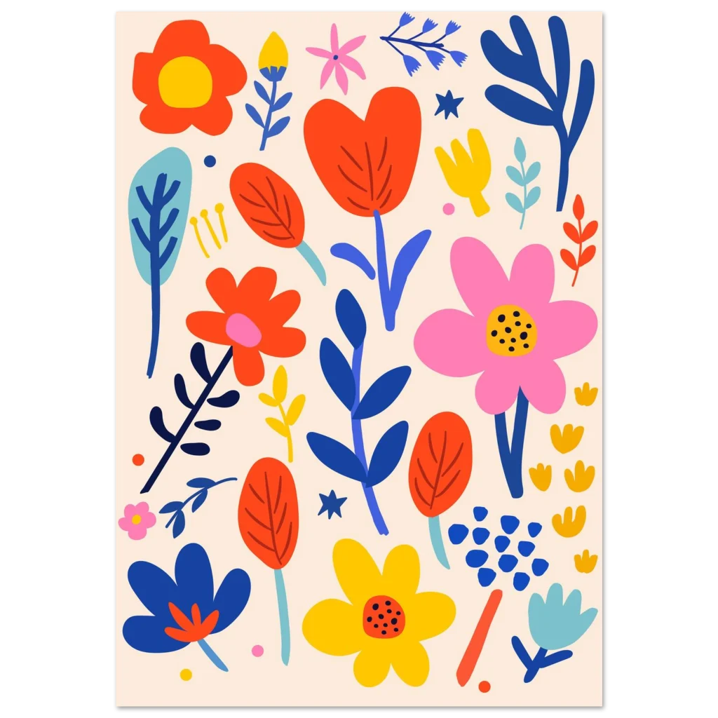 Infuse your space with the playful charm and vibrant energy of mid-century modern design. This poster, bursting with abstract floral shapes in a striking palette of coral, sunny yellow, and deep blue, adds a touch of artistic sophistication and cheerful warmth to any room. Its semi-glossy finish ensures these lively colors pop with subtle elegance, making it a perfect statement piece for contemporary or eclectic decor lovers.