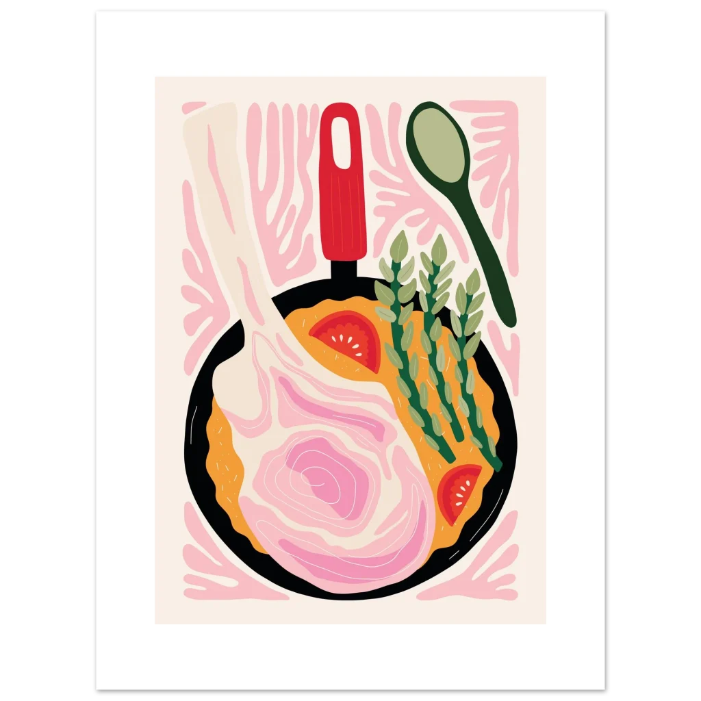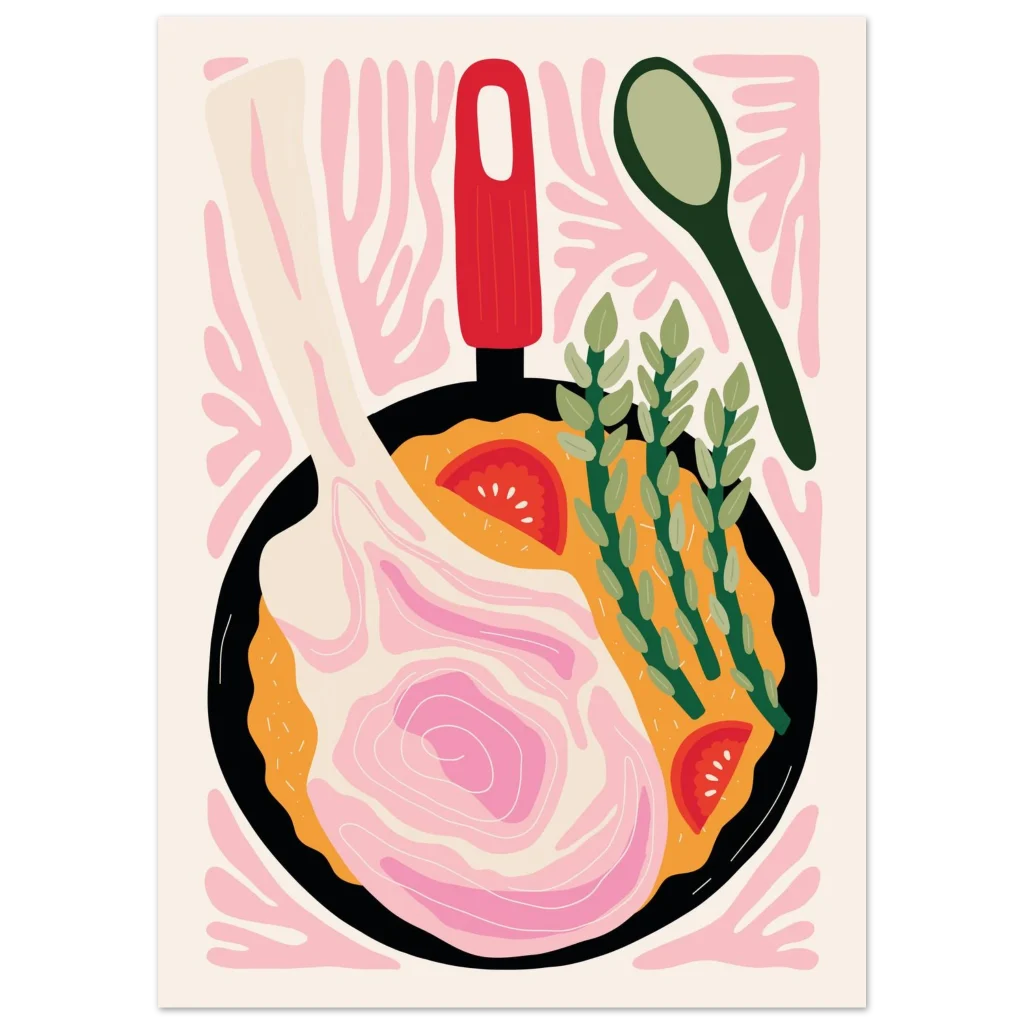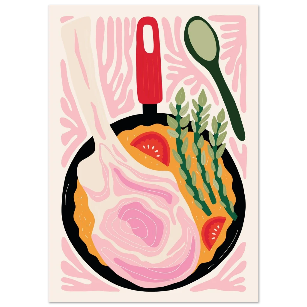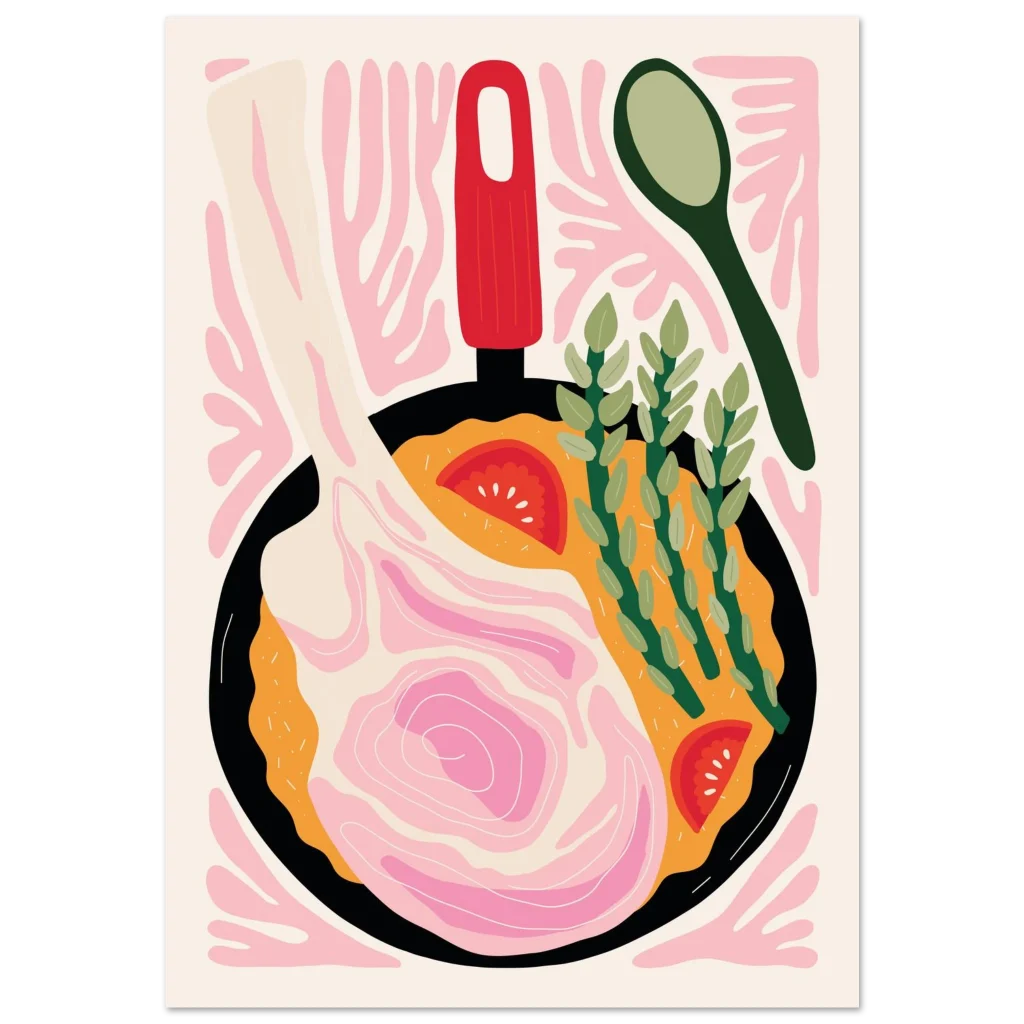 Infuse your space with the vibrant charm of a modern kitchen masterpiece. This abstract culinary print, featuring a beautifully rendered steak with asparagus and tomato in a pan, brings a dash of sophistication and artistic flair to any room. Its warm, inviting colors and playful shapes are perfect for foodies and art lovers alike, transforming your walls into a gallery of delightful design.