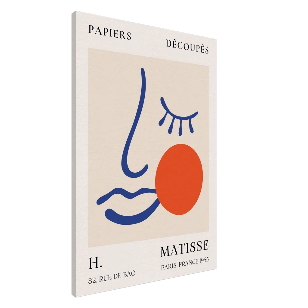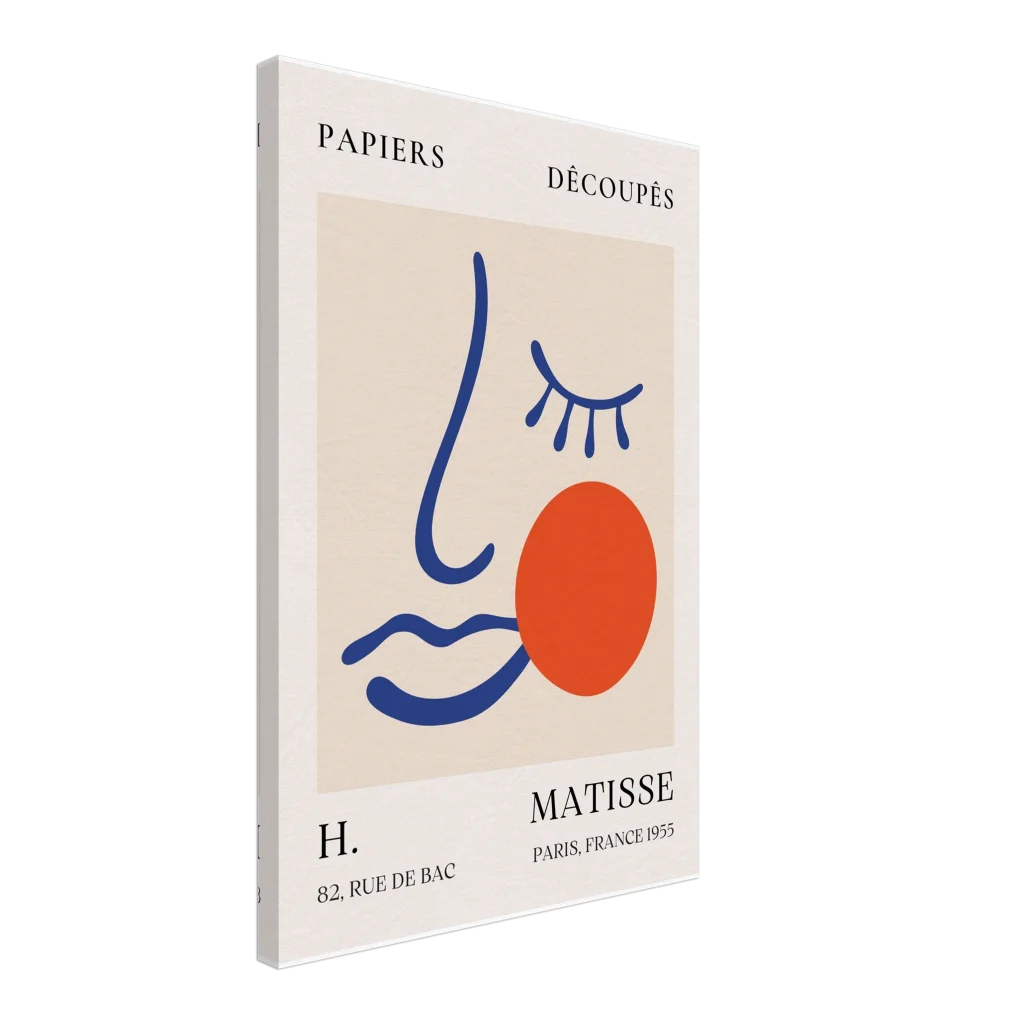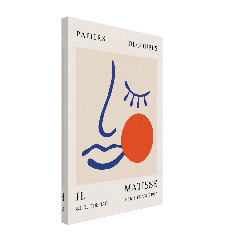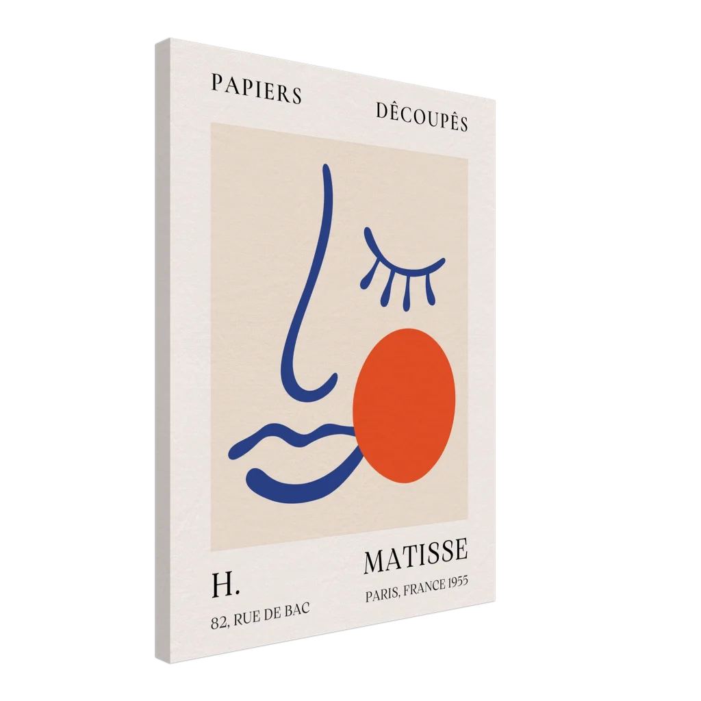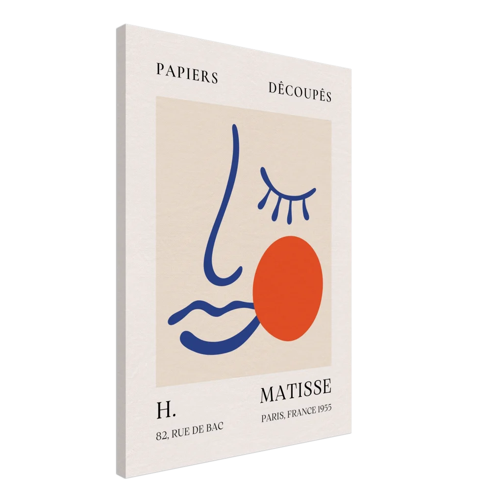 Bring a touch of modern elegance and artistic flair to your space with our Abstract Face Canvas Print, inspired by the iconic cut-out style of Matisse. This piece features a striking minimalist face design with bold blue lines and a vibrant orange circle, set against a soothing off-white background. The organic shapes and warm color palette create a harmonious and captivating visual, perfect for enhancing any contemporary decor.