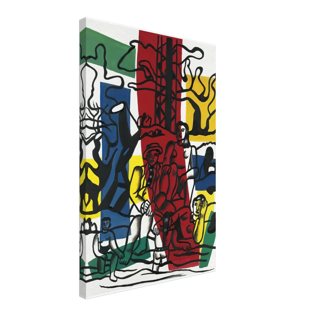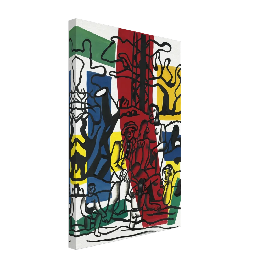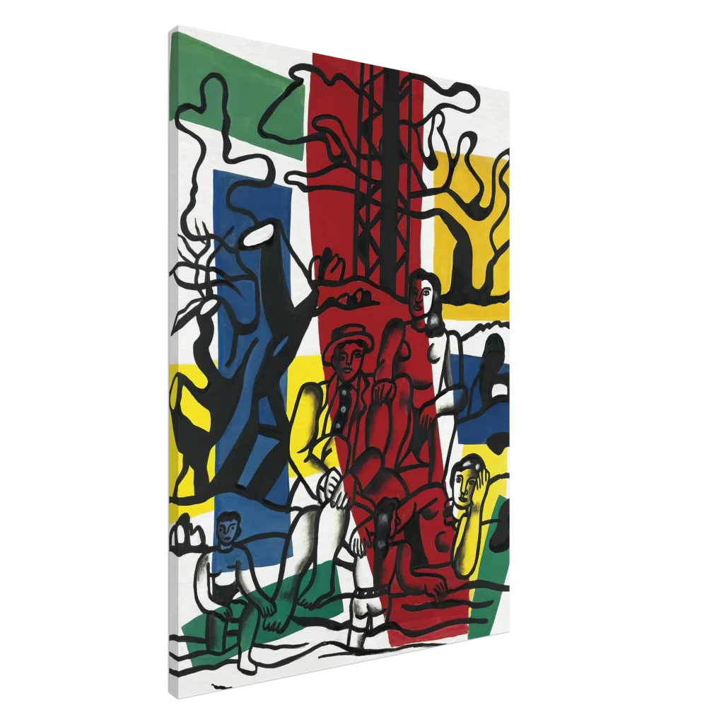 Immerse your space in the vibrant energy of our Abstract Figurative Ensemble canvas print. This captivating artwork, reminiscent of Léger’s bold style, features a dynamic composition of stylized figures in a striking palette of red, blue, green, and yellow, outlined with powerful black lines. It’s designed to bring a modern, artistic focal point to any room, sparking conversation and inspiration.