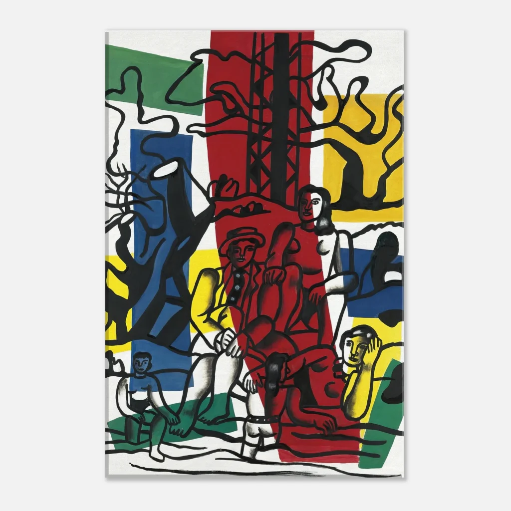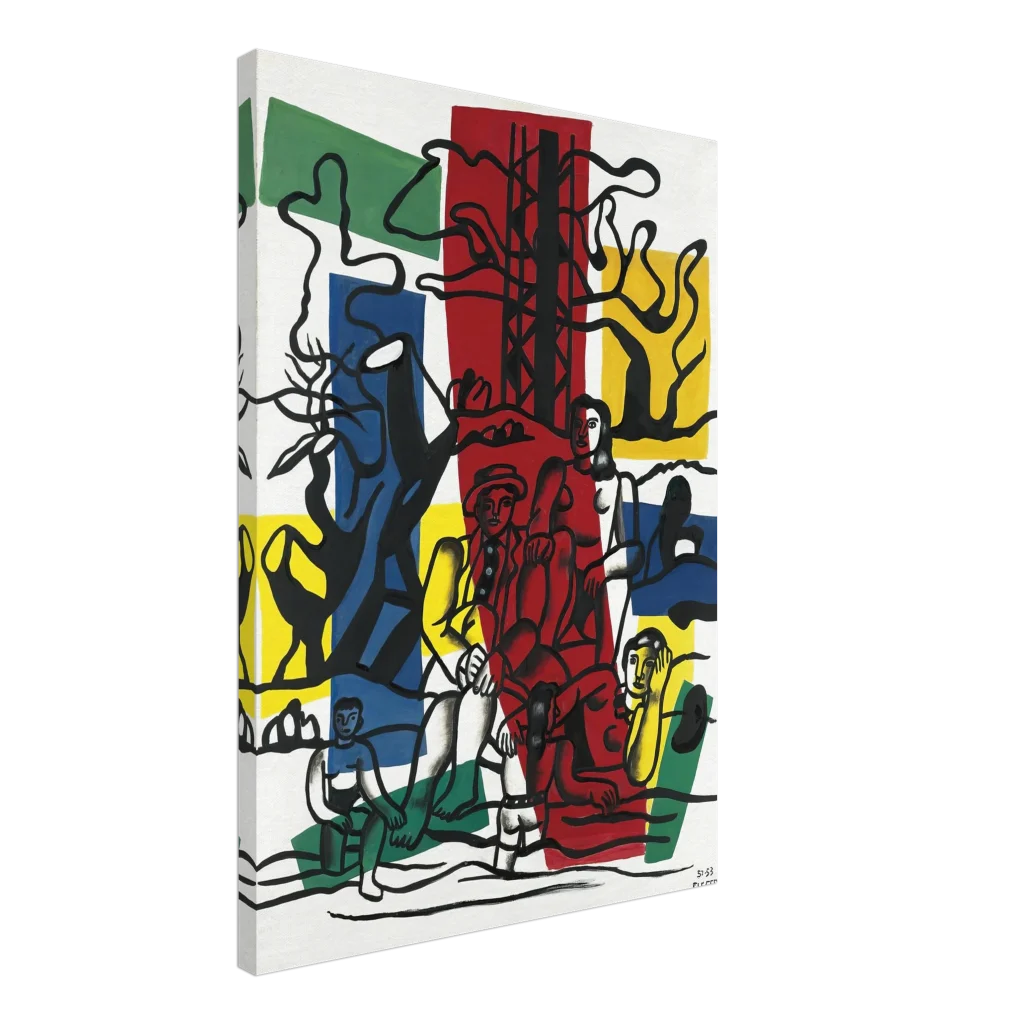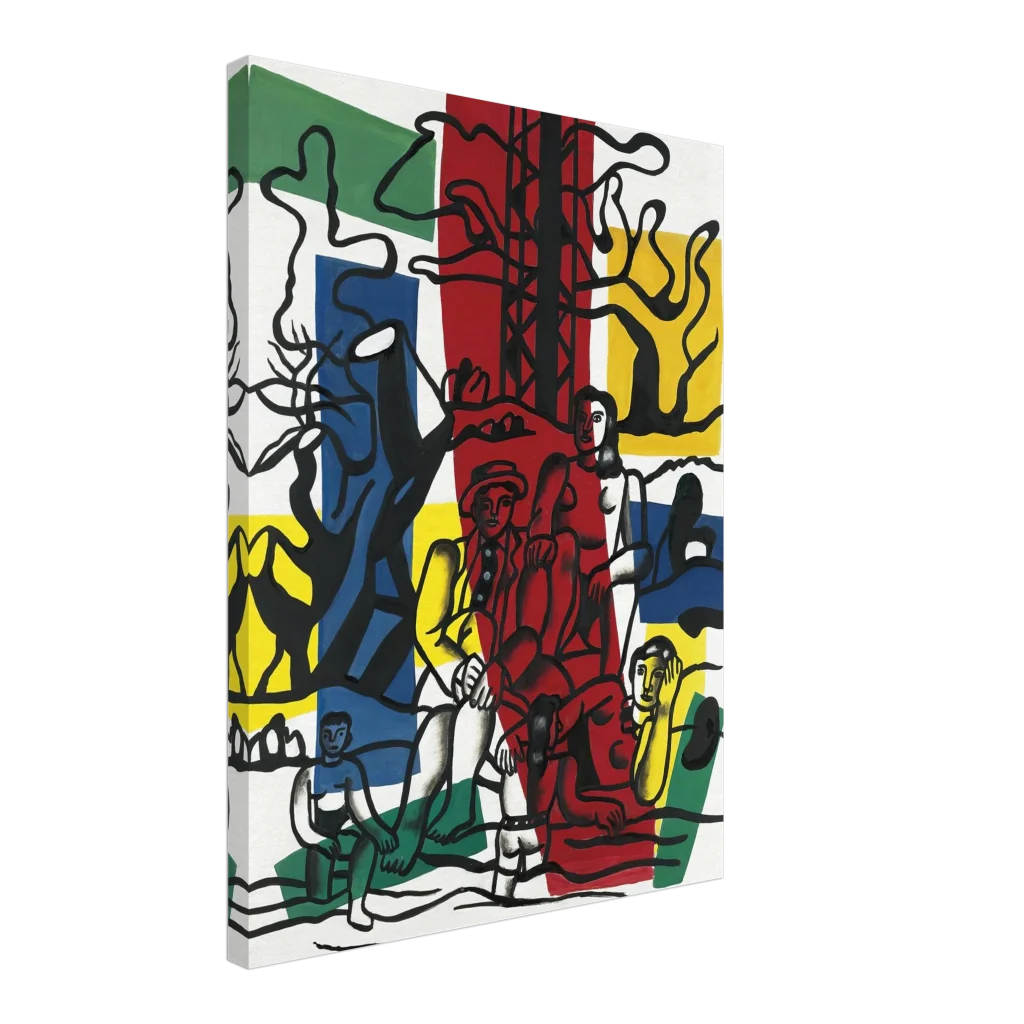 Immerse your space in the vibrant energy of our Abstract Figurative Ensemble canvas print. This captivating artwork, reminiscent of Léger’s bold style, features a dynamic composition of stylized figures in a striking palette of red, blue, green, and yellow, outlined with powerful black lines. It’s designed to bring a modern, artistic focal point to any room, sparking conversation and inspiration.