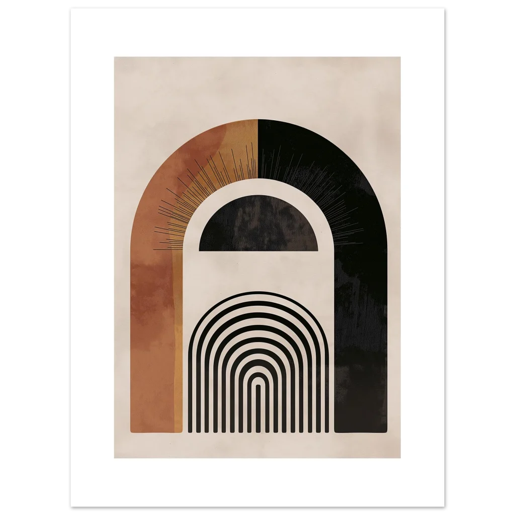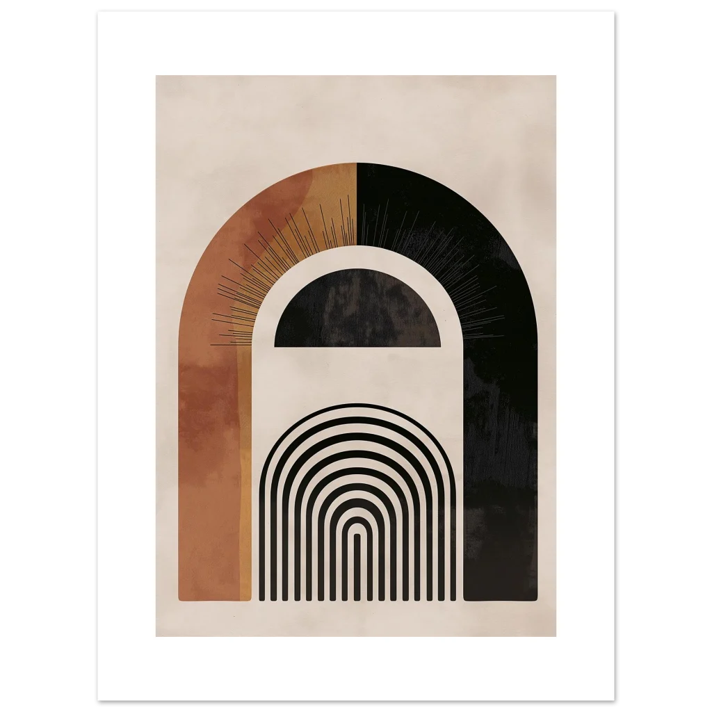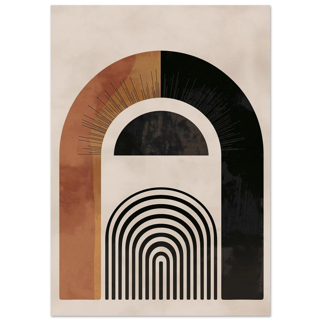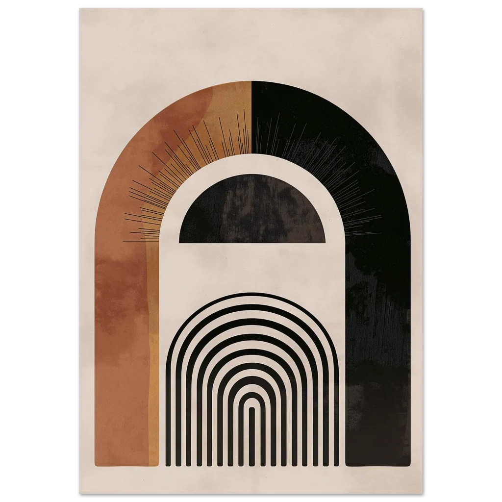 Infuse your living space with the serene elegance of our Abstract Geometric Arch poster. Featuring a captivating design with earthy tones, deep blacks, and clean lines, this artwork effortlessly blends modern aesthetics with a touch of organic warmth. The striking sunburst details emanating from the arches add a dynamic yet harmonious element, perfect for creating a focal point in any room.