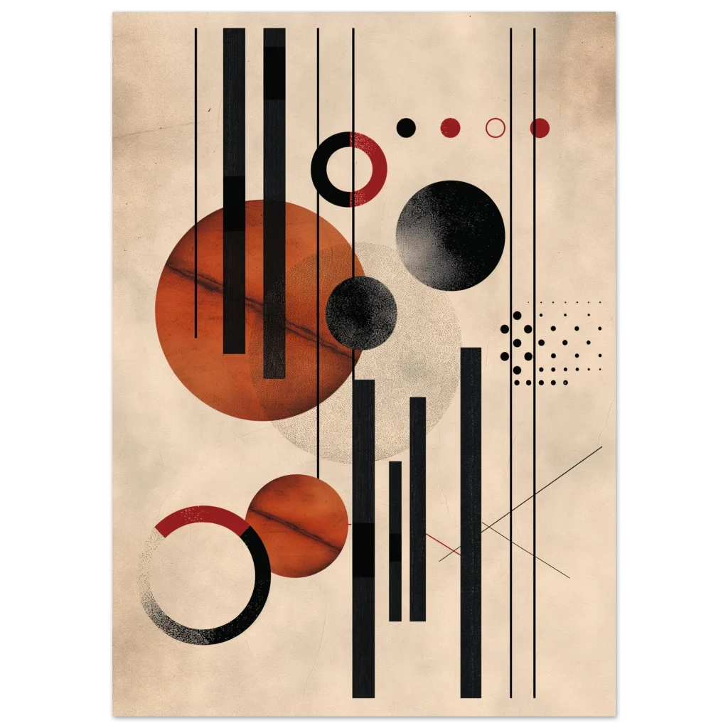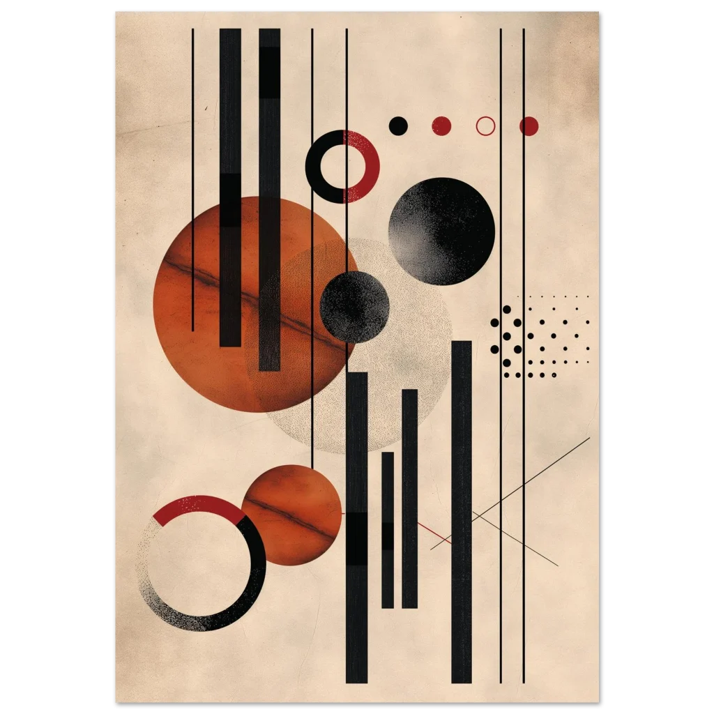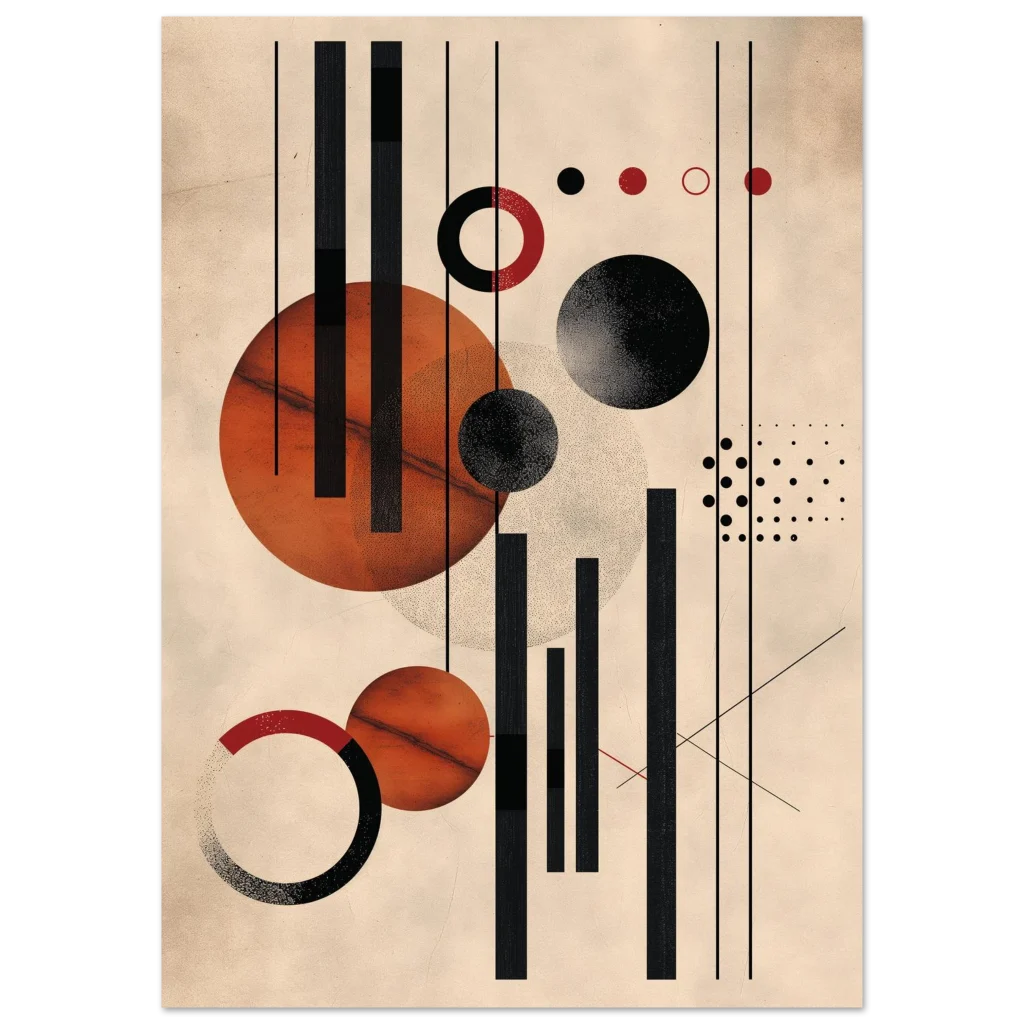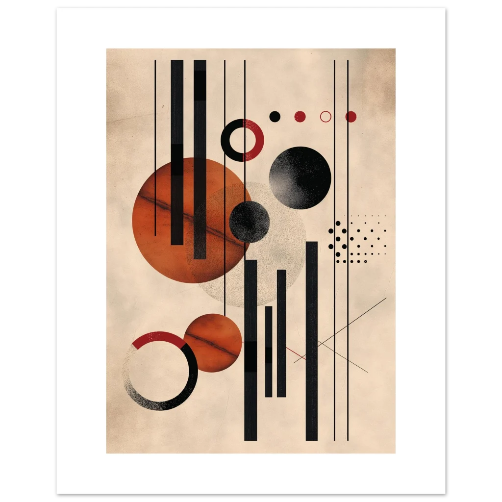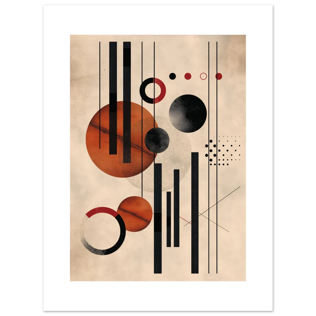 Unleash a touch of modern sophistication with our Abstract Geometric Earth Tones Art Print. This piece, with its striking interplay of warm rust, deep black, and creamy beige, brings a contemporary yet timeless elegance to any space. The unique blend of bold lines, defined circles, and subtle textures creates a dynamic visual story, perfect for art lovers seeking a minimalist statement with rich character.
