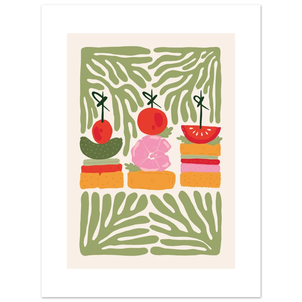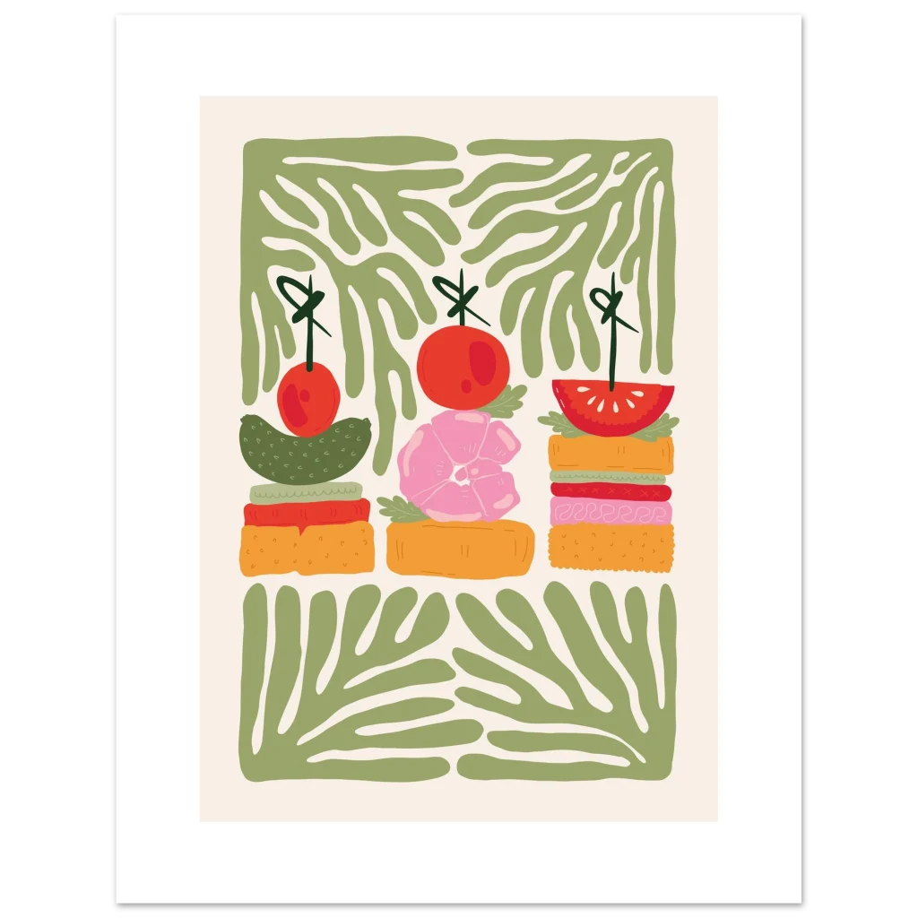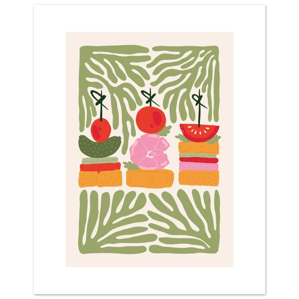 Infuse your space with playful charm and a touch of abstract sophistication with our ‘Gourmet Bites’ art print. This delightful piece features a vibrant, stylized depiction of delicious canapés, set against a calming sage green and cream backdrop. The warm, inviting colors and contemporary aesthetic make it a perfect addition to any kitchen, dining area, or a thoughtful gift for the modern food enthusiast.