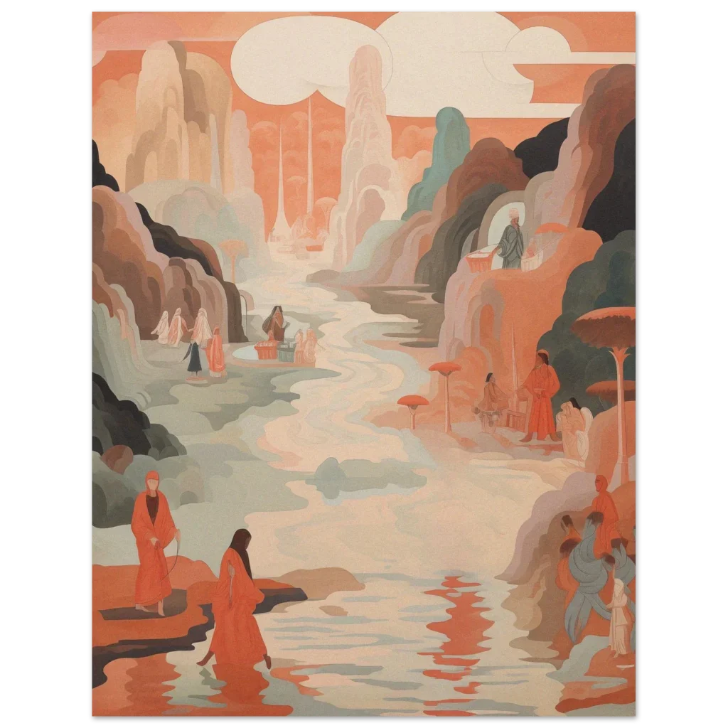 Immerse yourself in the serene, abstract beauty of a desert river landscape. This captivating poster, with its warm, muted oranges, soft greens, and earthy browns, evokes a sense of calm and ancient wonder, perfect for bringing a touch of tranquil elegance to any room. Printed on our premium matte paper, the subtle, uncoated finish enhances the artwork’s contemplative mood, offering a luxuriously soft feel and a visual depth that invites reflection.