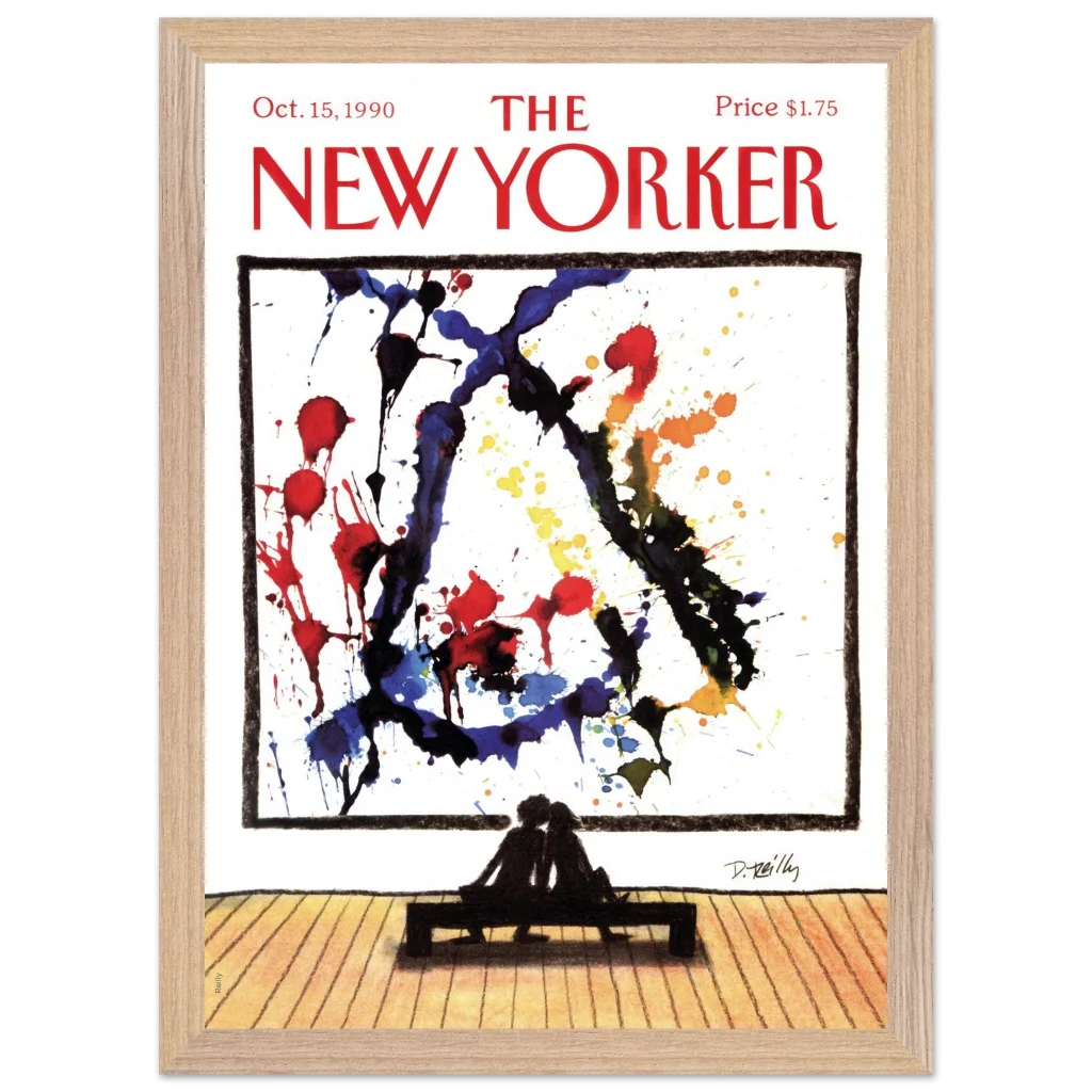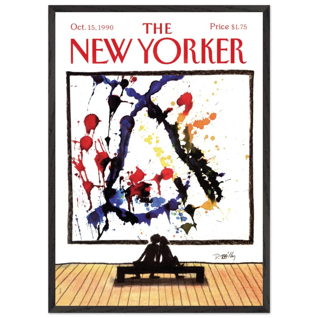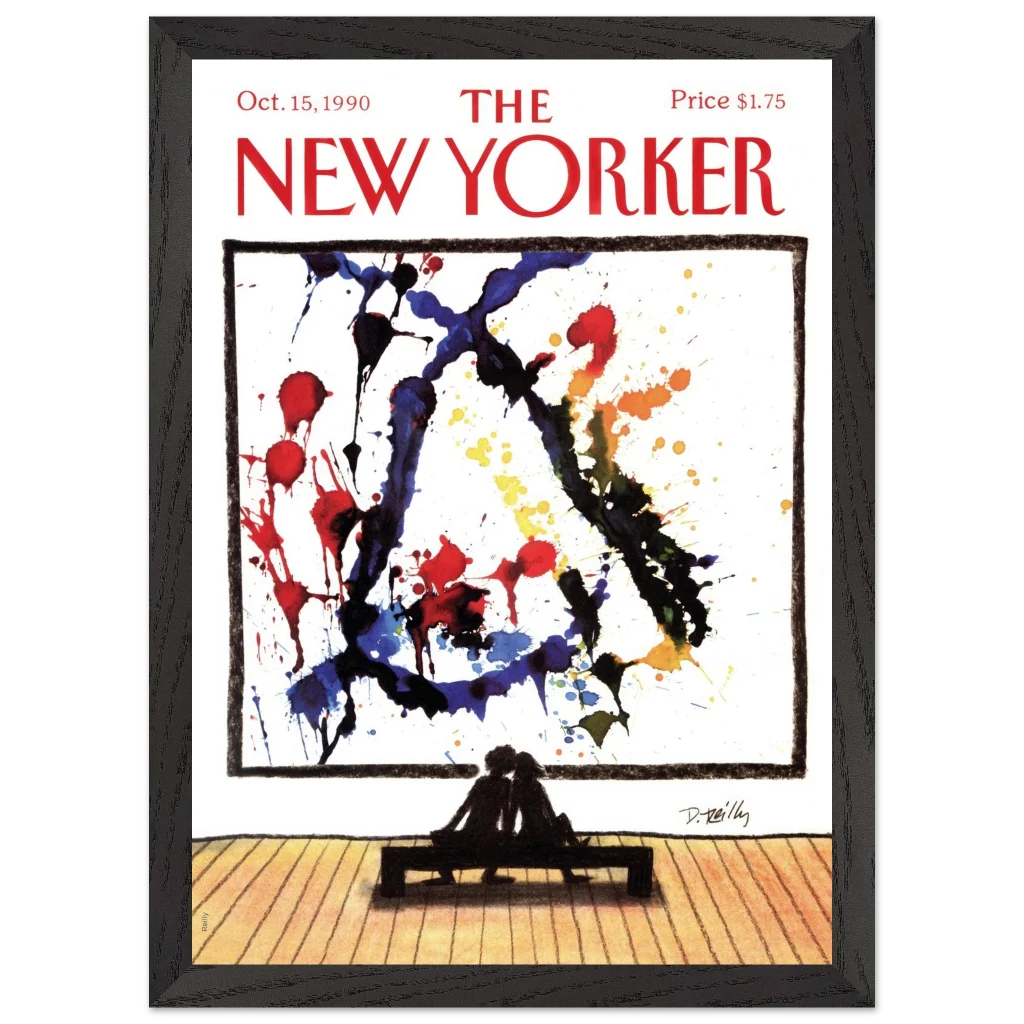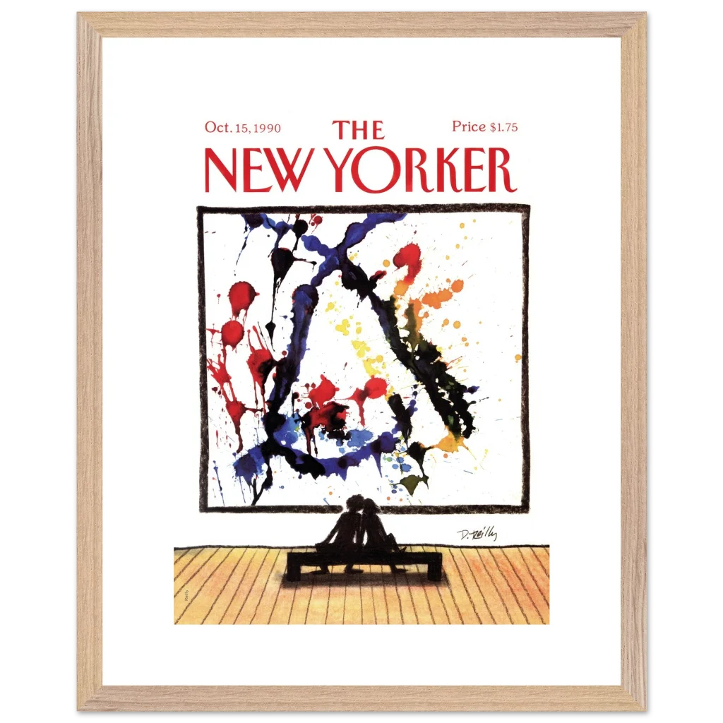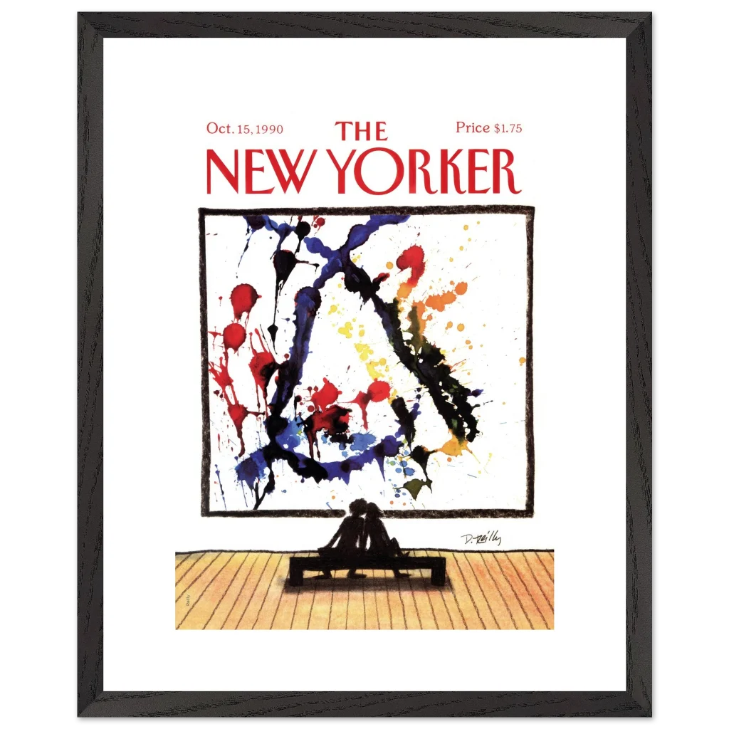 Immerse yourself in a moment of shared appreciation with ‘Abstract Love,’ a captivating print of the iconic New Yorker cover from October 15, 1990. This striking piece beautifully contrasts the bold, expressive splatters of abstract art with the intimate silhouette of a couple lost in contemplation, offering a profound statement on connection and artistic interpretation. It’s perfect for art lovers and romantics alike, bringing a touch of sophisticated charm and conversation to any room.