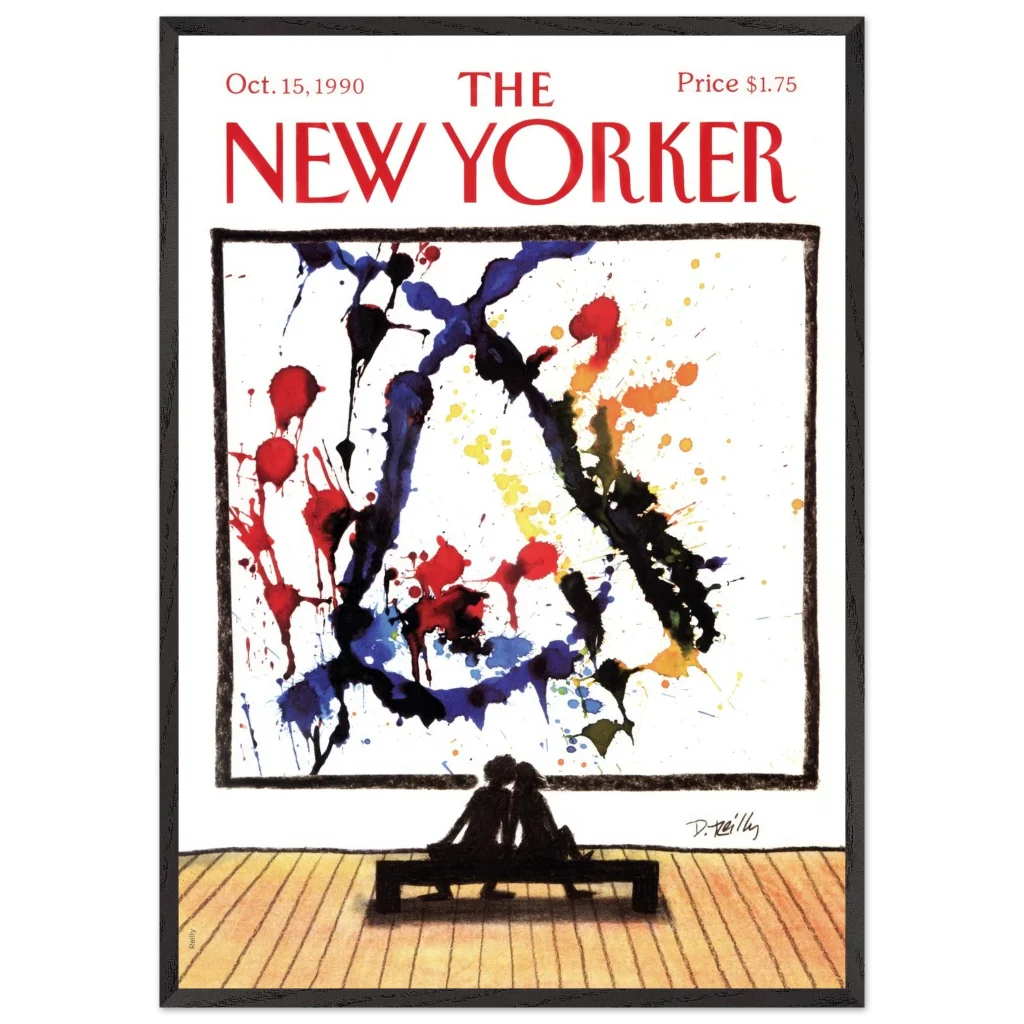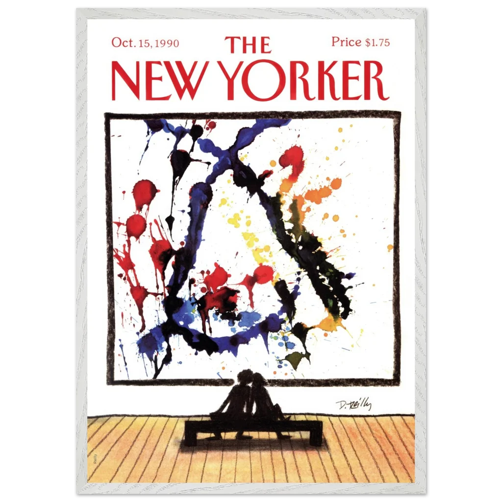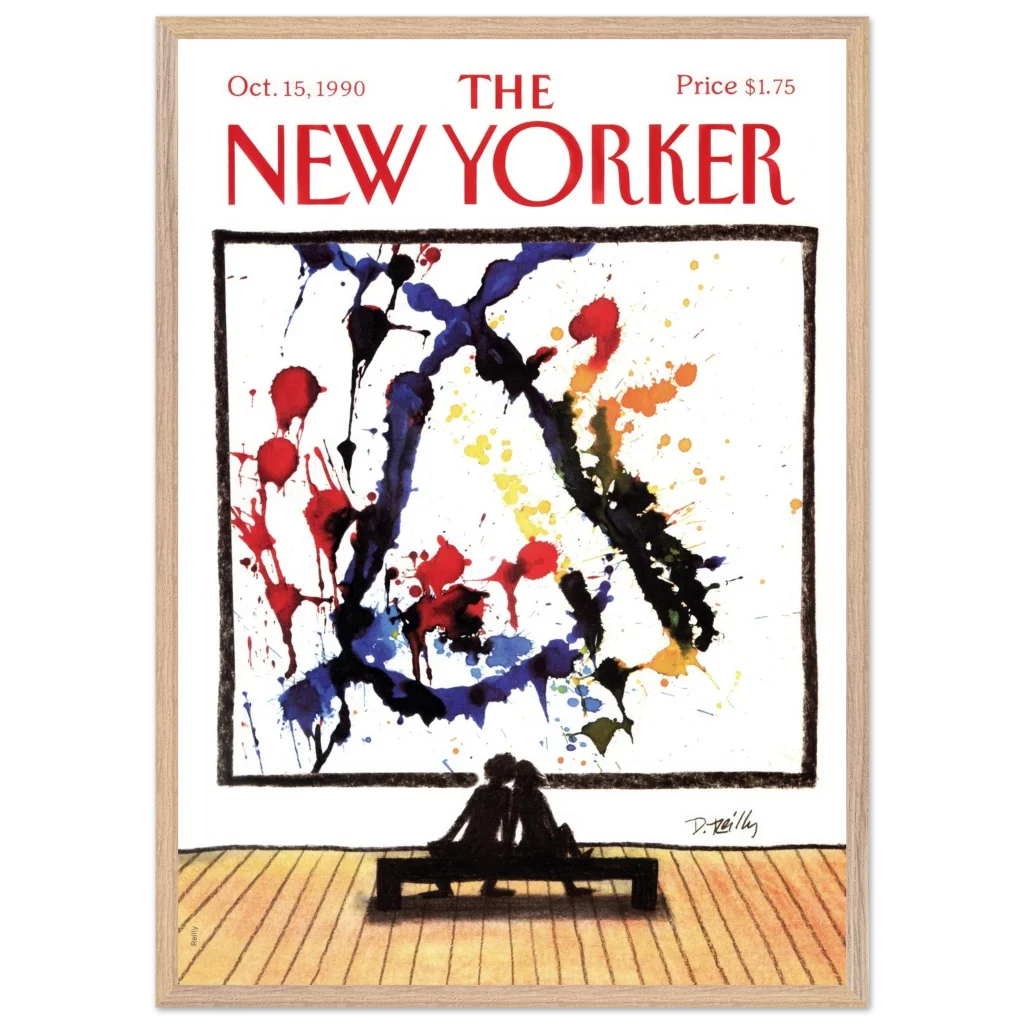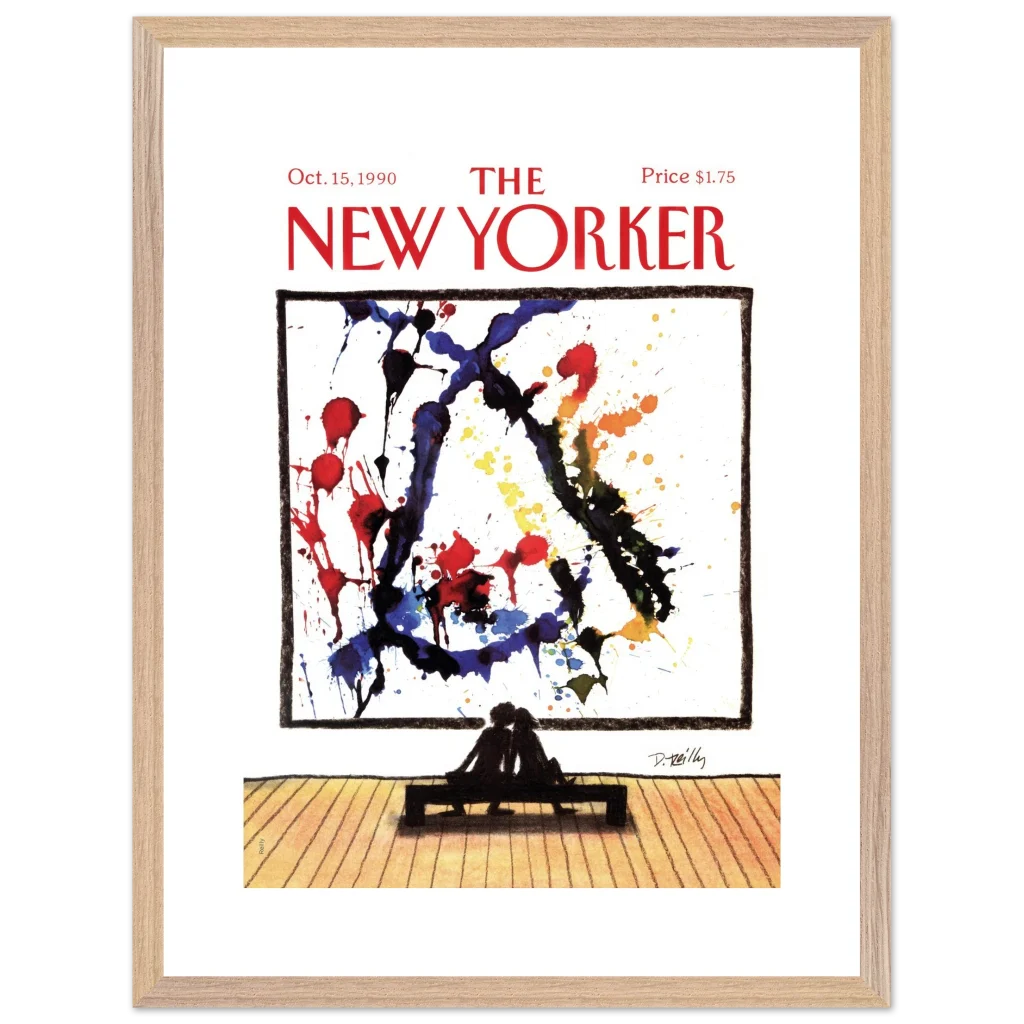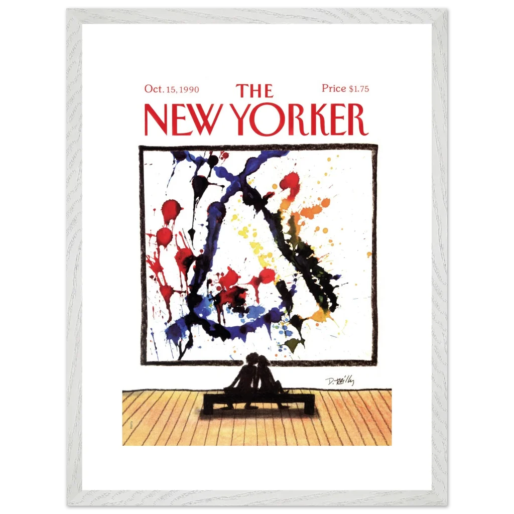 Immerse yourself in a moment of shared appreciation with ‘Abstract Love,’ a captivating print of the iconic New Yorker cover from October 15, 1990. This striking piece beautifully contrasts the bold, expressive splatters of abstract art with the intimate silhouette of a couple lost in contemplation, offering a profound statement on connection and artistic interpretation. It’s perfect for art lovers and romantics alike, bringing a touch of sophisticated charm and conversation to any room.