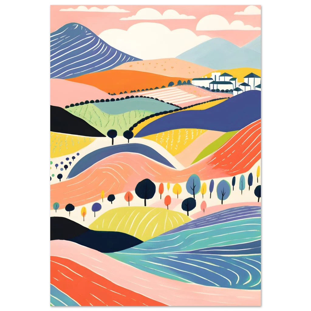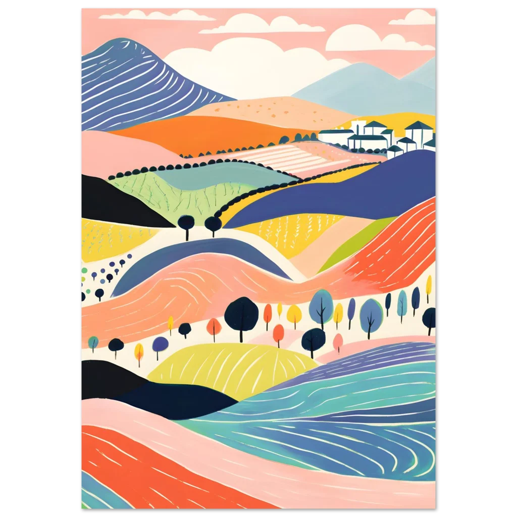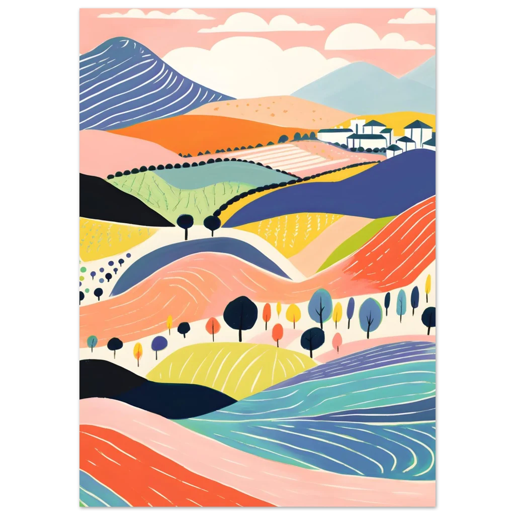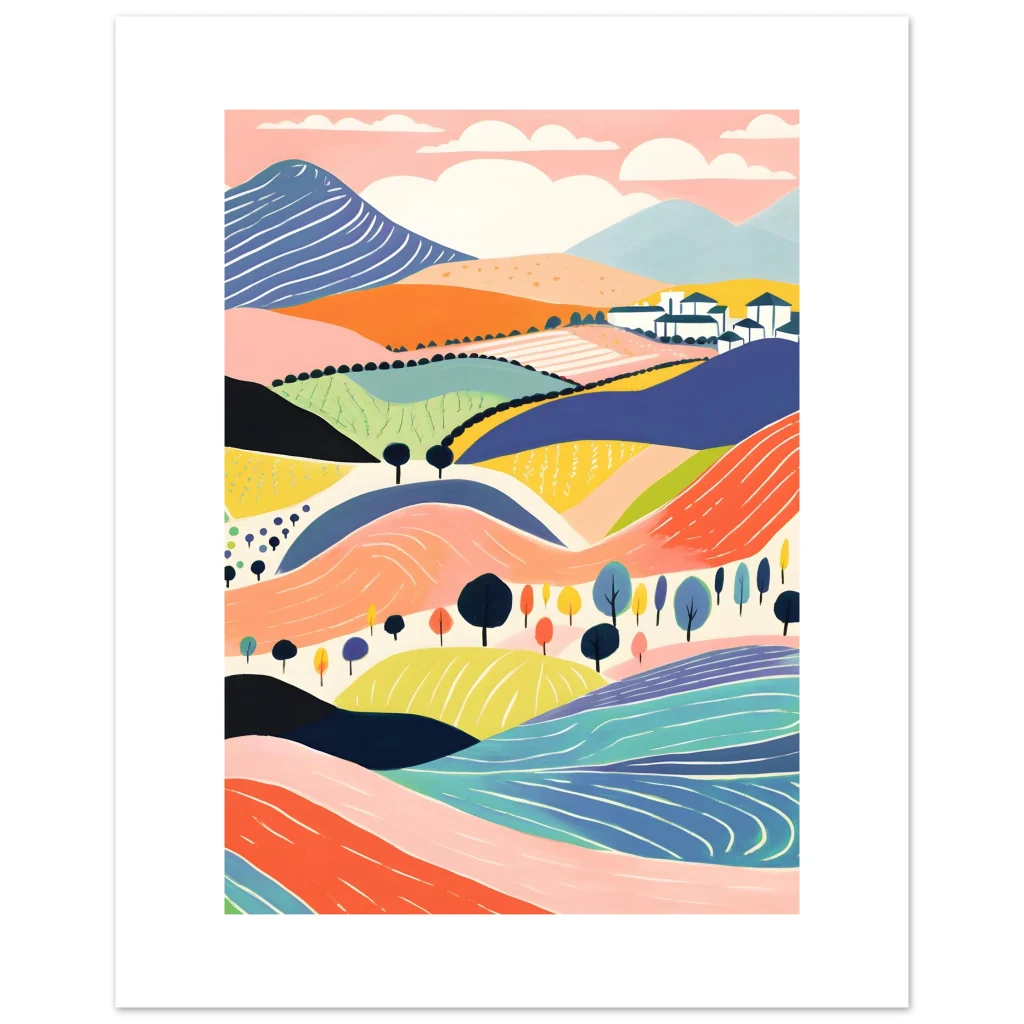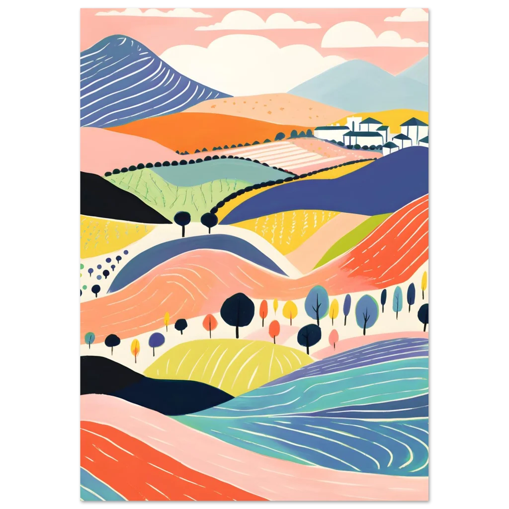 Bring the vibrant, sun-drenched beauty of a Mediterranean landscape into your home with this stunning art print. Featuring rolling hills, olive groves, and charming villages rendered in a dreamy, abstract style with a rich, inviting color palette of corals, blues, and warm yellows, this poster evokes a sense of serene wanderlust. Experience art that feels silky to the touch with our high-quality, lighter-weight, classic semi-glossy paper, designed to make every color pop and every detail shine.
