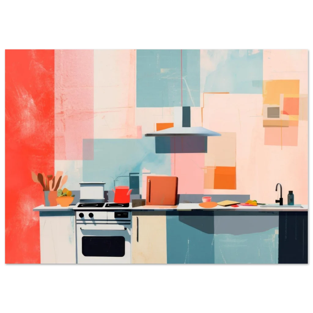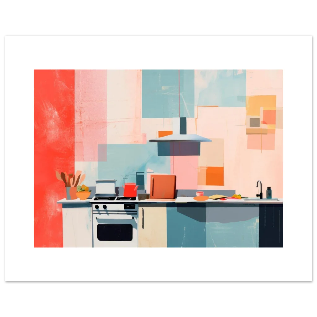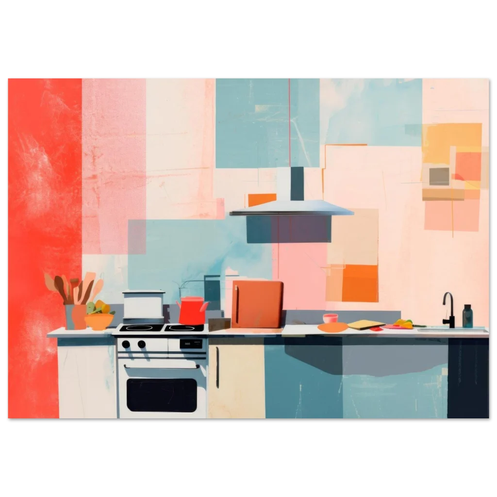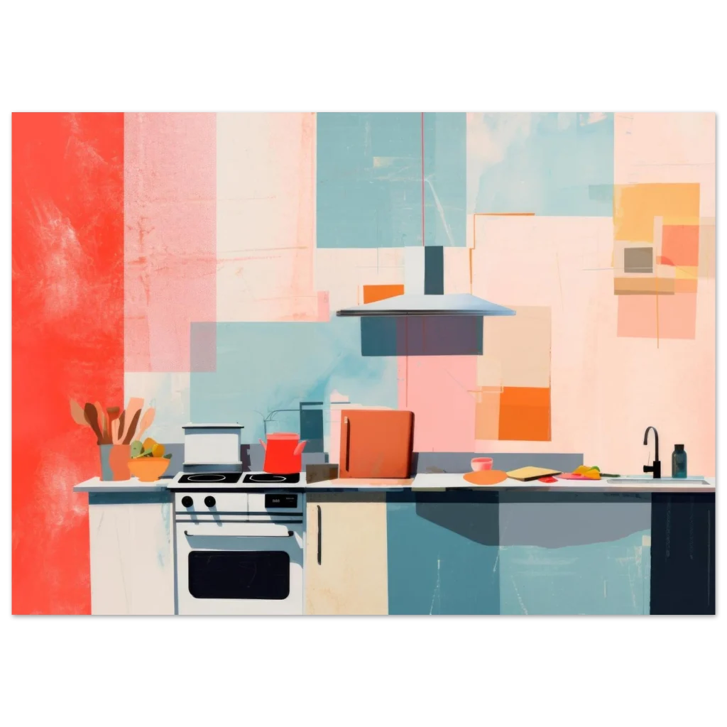 Bring a splash of retro charm and modern artistry into your home with this captivating Abstract Mid-Century Kitchen poster. The vibrant color palette, featuring warm corals, playful teals, and soft blush tones, creates a dynamic yet inviting atmosphere, perfect for enlivening any living space, dining area, or actual kitchen. This piece, with its clean lines and geometric forms, embodies a contemporary aesthetic with a nostalgic twist.