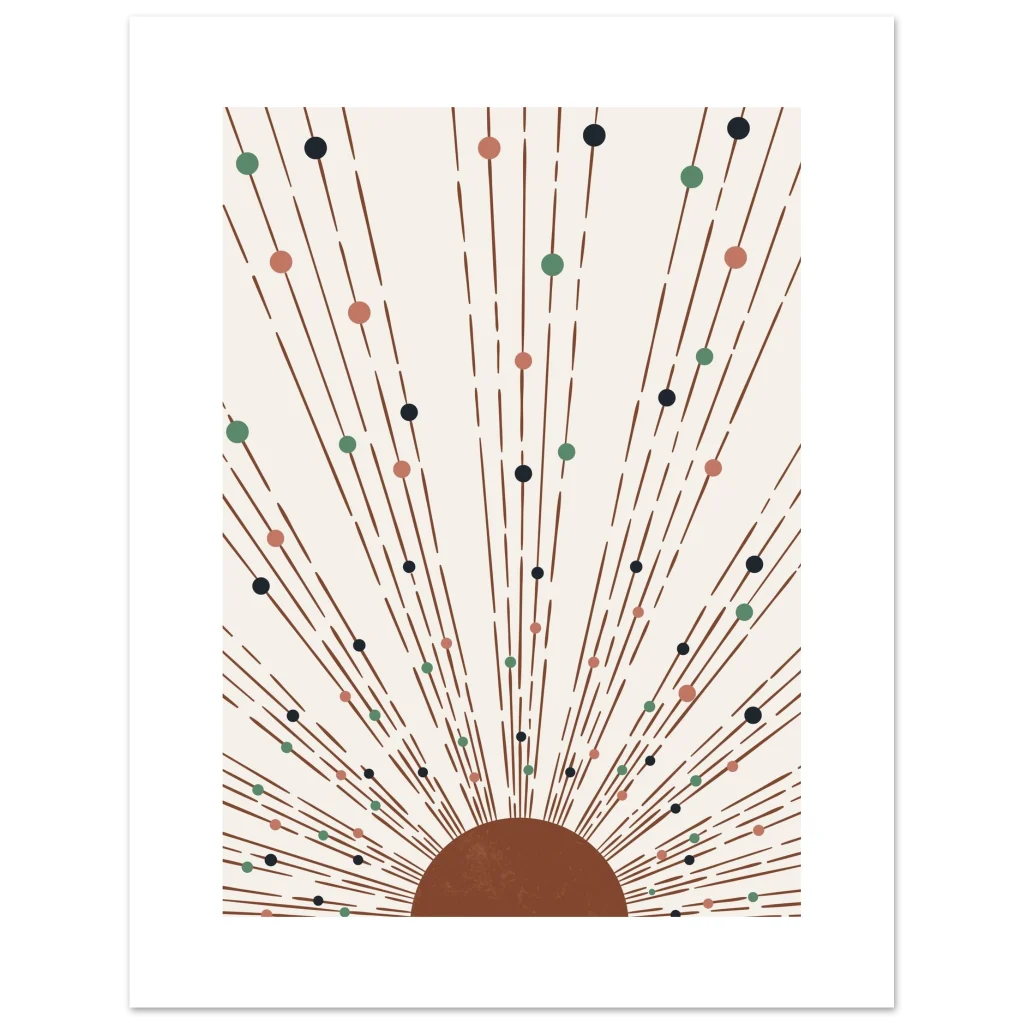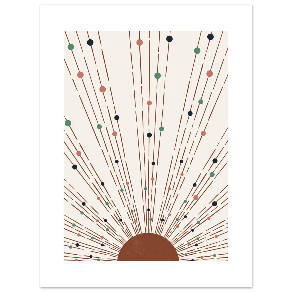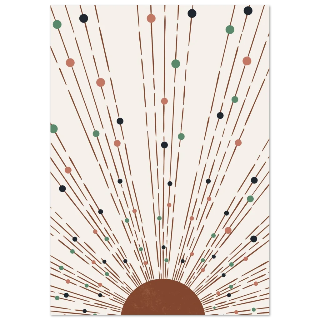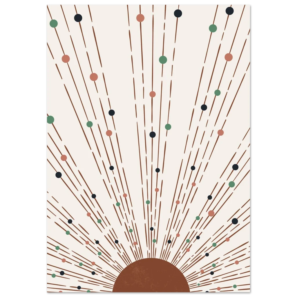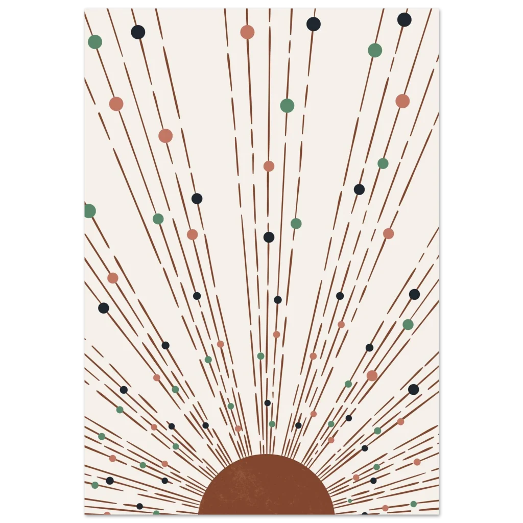 Invite the serene warmth of a minimalist sunrise into your living space with our captivating Abstract Mid-Century Sunrise Poster. Featuring a rich palette of earthy tones—from warm terracotta to deep forest green and charcoal black—this design evokes a tranquil, optimistic mood. The clean lines and scattered dots create a sense of upward movement and gentle expansion, perfect for bringing a touch of refined calm and modern elegance to any room. It’s an ideal statement piece for those who appreciate understated beauty and sophisticated design.