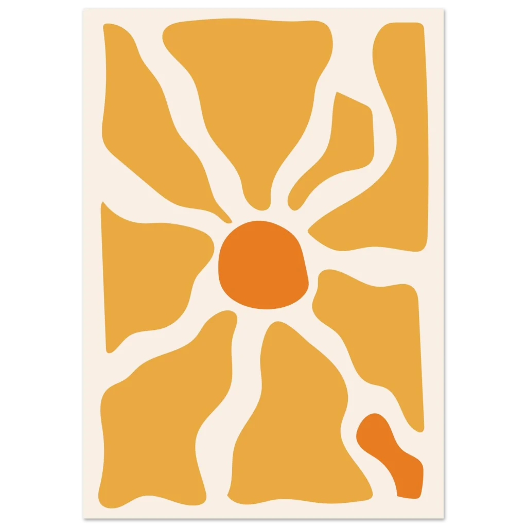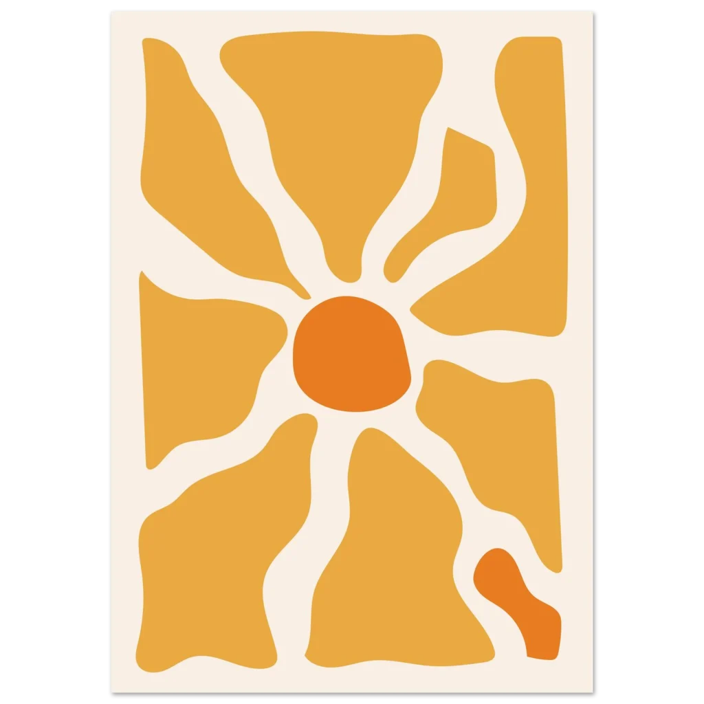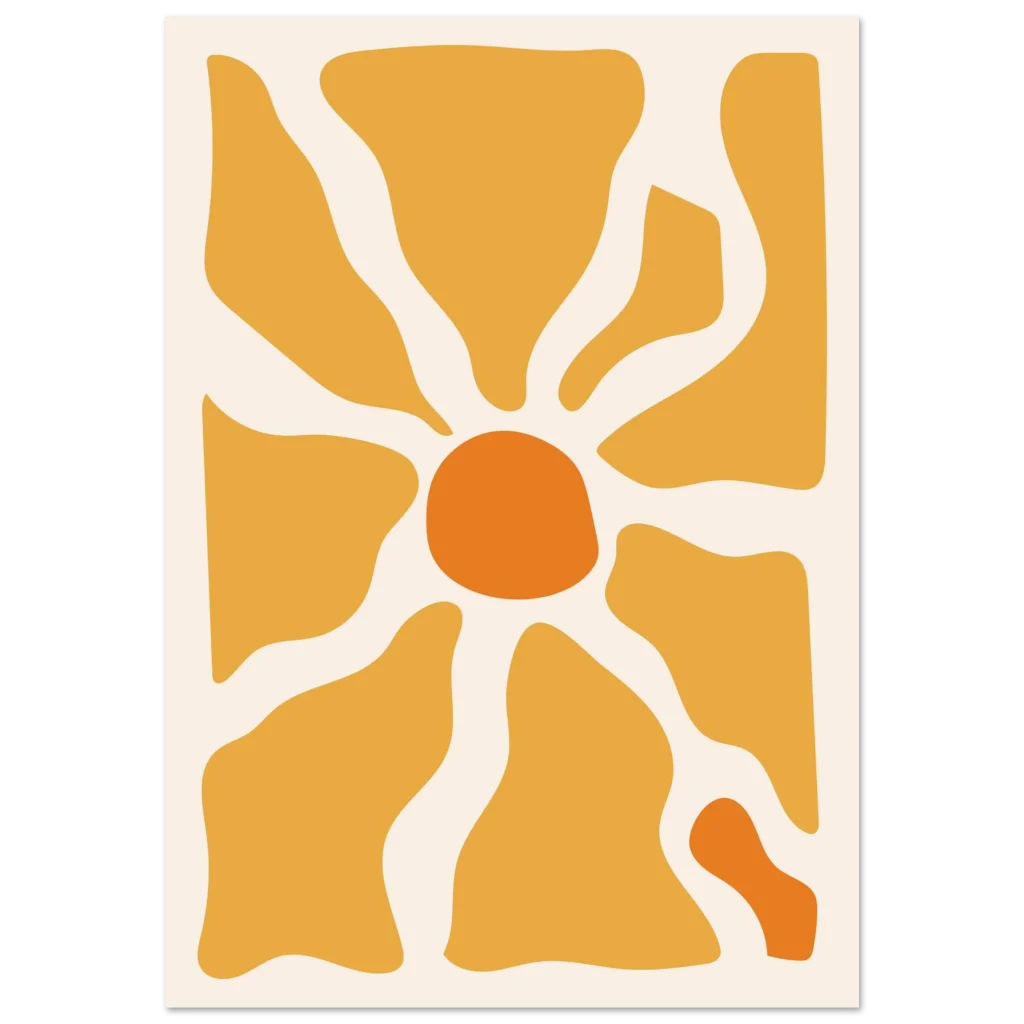 Bring a touch of modern warmth and sunny optimism into your space with our captivating Abstract Sunburst Poster. This vibrant piece, featuring a harmonious blend of golden yellow and bright orange hues against a soft cream background, evokes a feeling of energy and contemporary style. Its organic shapes and sun-like design make it a perfect statement for any room seeking a splash of cheerful sophistication.