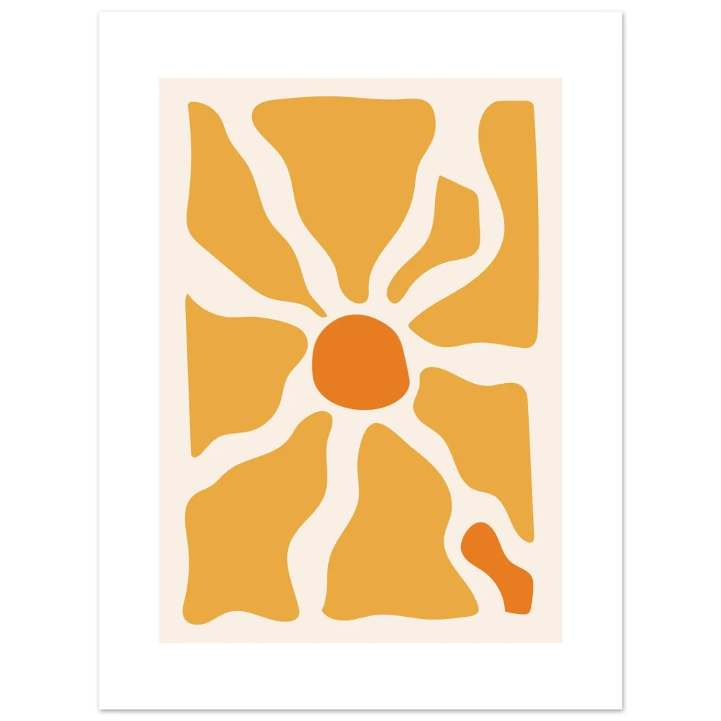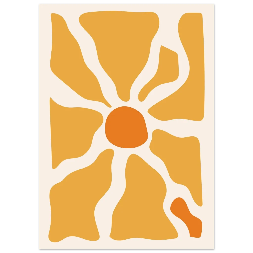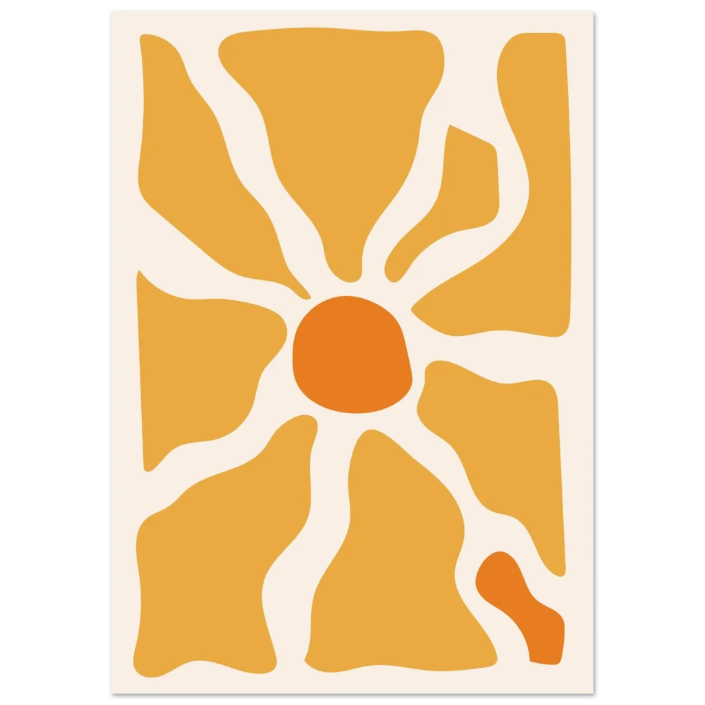 Bring a touch of modern warmth and sunny optimism into your space with our captivating Abstract Sunburst Poster. This vibrant piece, featuring a harmonious blend of golden yellow and bright orange hues against a soft cream background, evokes a feeling of energy and contemporary style. Its organic shapes and sun-like design make it a perfect statement for any room seeking a splash of cheerful sophistication.