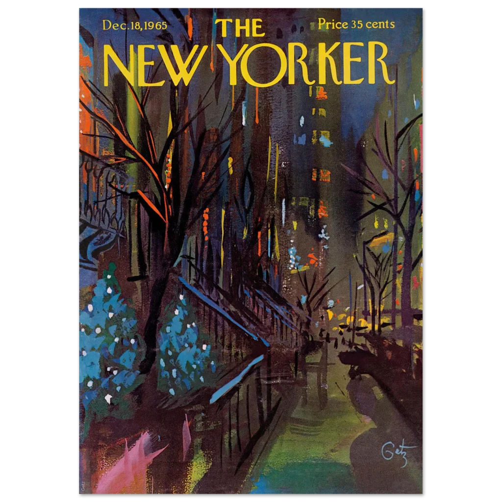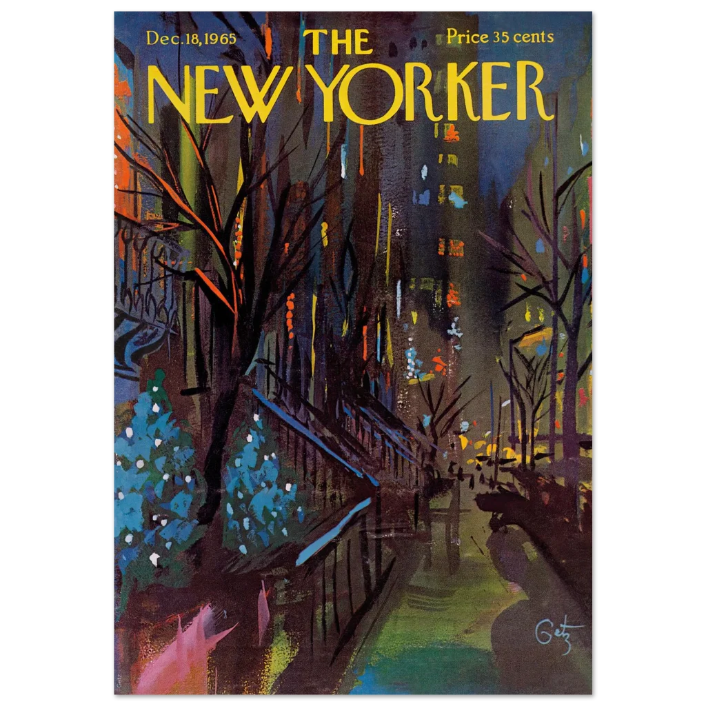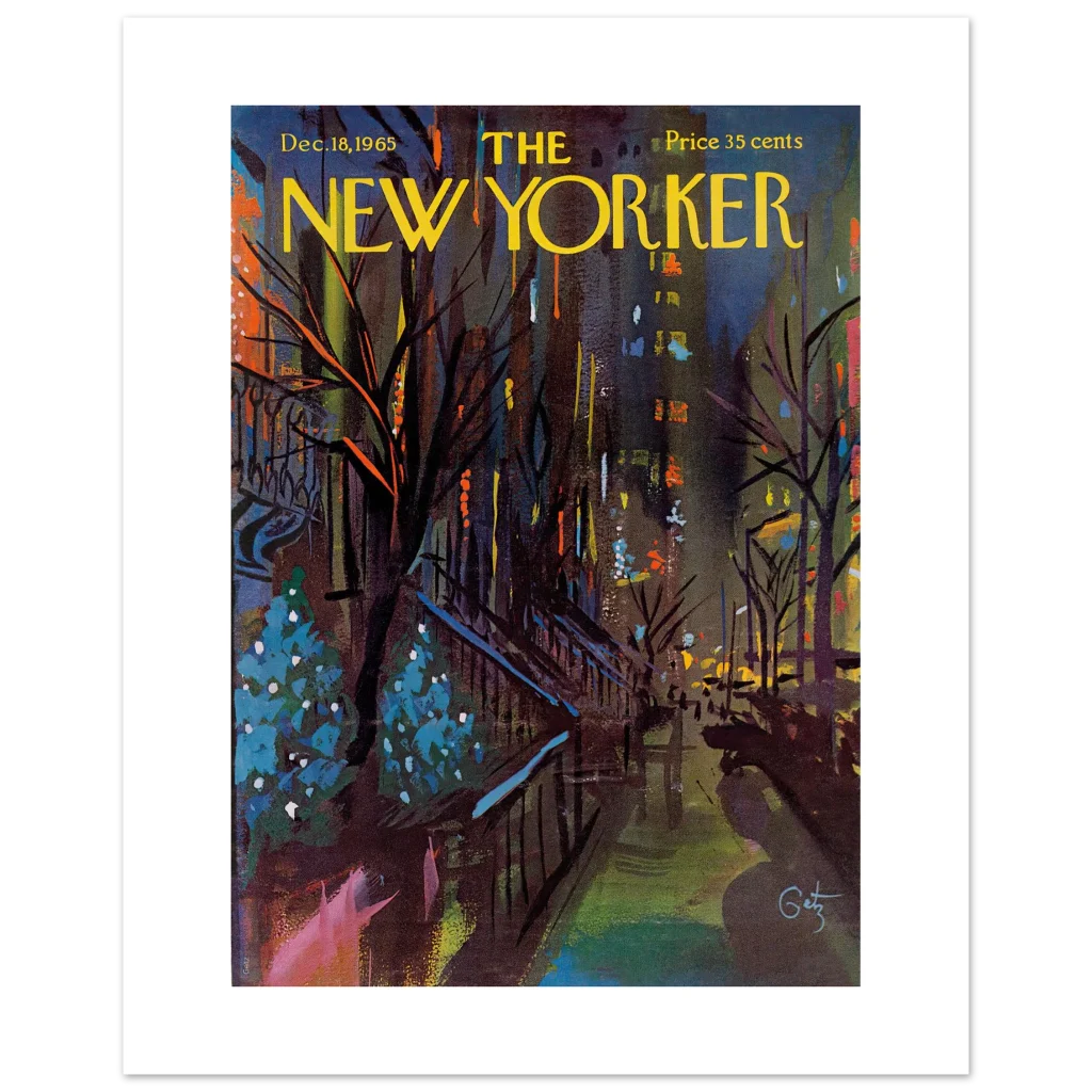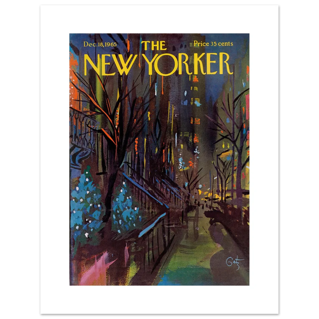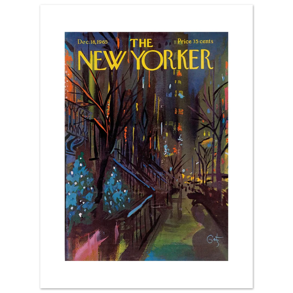 Bring the vibrant, moody charm of a mid-century winter cityscape into your home with this exquisite print of the iconic New Yorker cover from December 18, 1965. Capturing the spirit of a bustling city evening with a rich palette of deep blues, fiery oranges, and festive teal highlights, this artwork by Julian Allen transforms any space into a gallery of timeless elegance and urban sophistication. It’s a celebration of classic art and enduring style, perfect for art lovers and nostalgic enthusiasts alike.