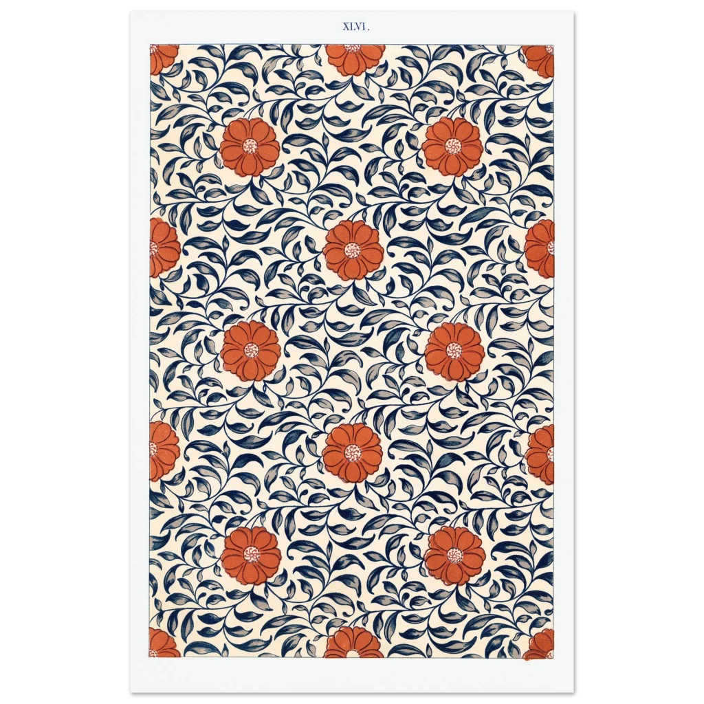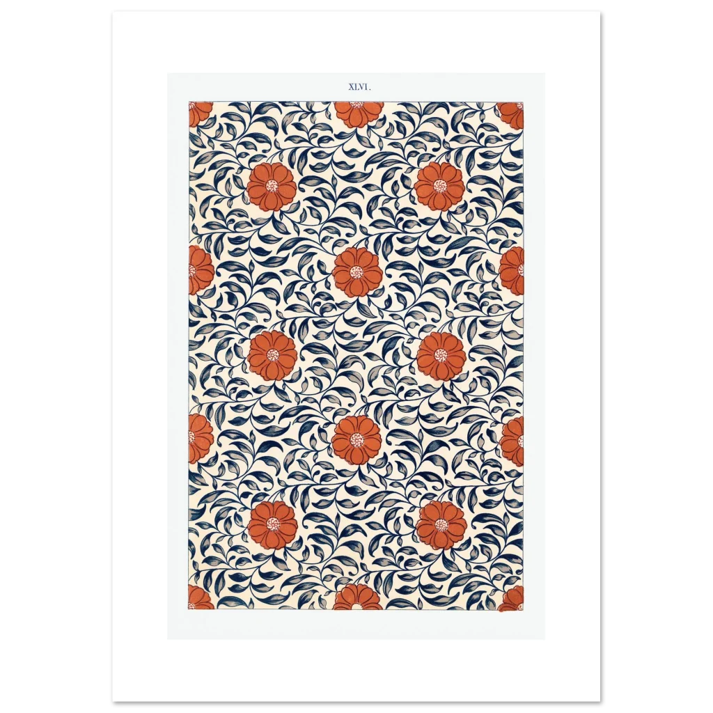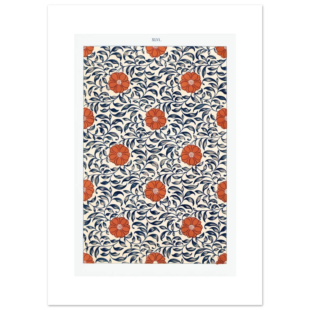Bring the timeless elegance of Art Nouveau into your space with this stunning floral and vine pattern poster. Featuring bold, vibrant orange blooms intertwined with rich navy and slate blue foliage against a warm, creamy background, this design captures a sense of natural beauty and classic charm. It’s an exquisite piece for anyone looking to add a touch of sophisticated artistry and warmth to their home or office decor.