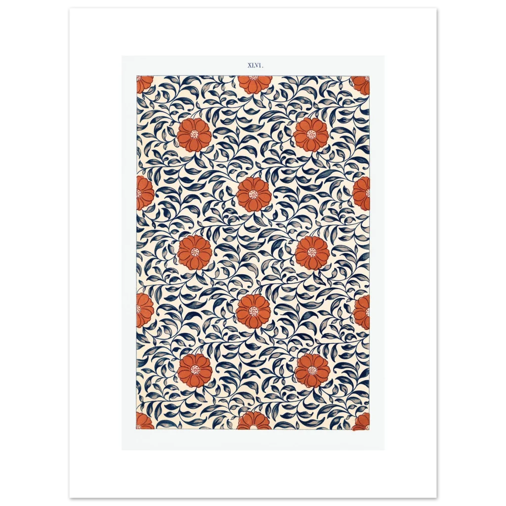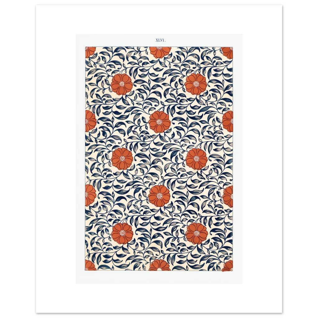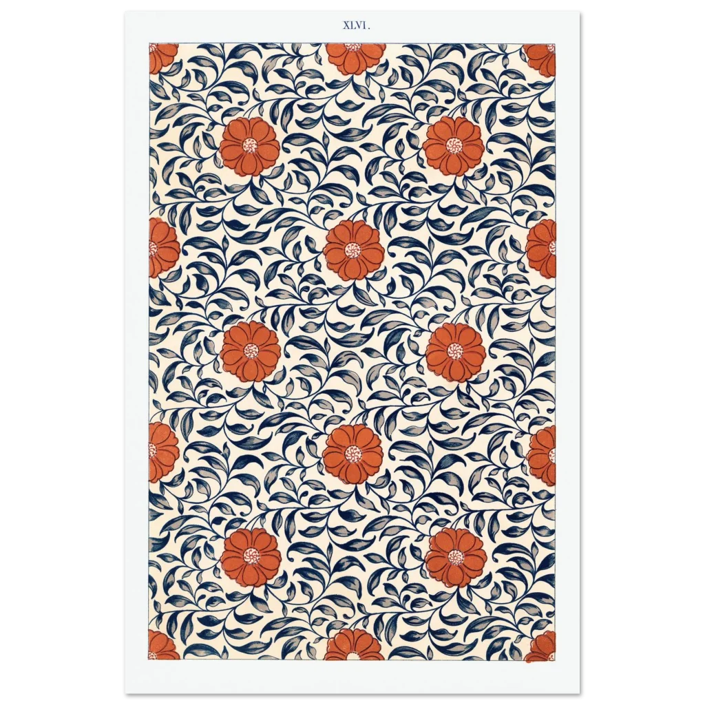 Bring the timeless elegance of Art Nouveau into your space with this stunning floral and vine pattern poster. Featuring bold, vibrant orange blooms intertwined with rich navy and slate blue foliage against a warm, creamy background, this design captures a sense of natural beauty and classic charm. It’s an exquisite piece for anyone looking to add a touch of sophisticated artistry and warmth to their home or office decor.