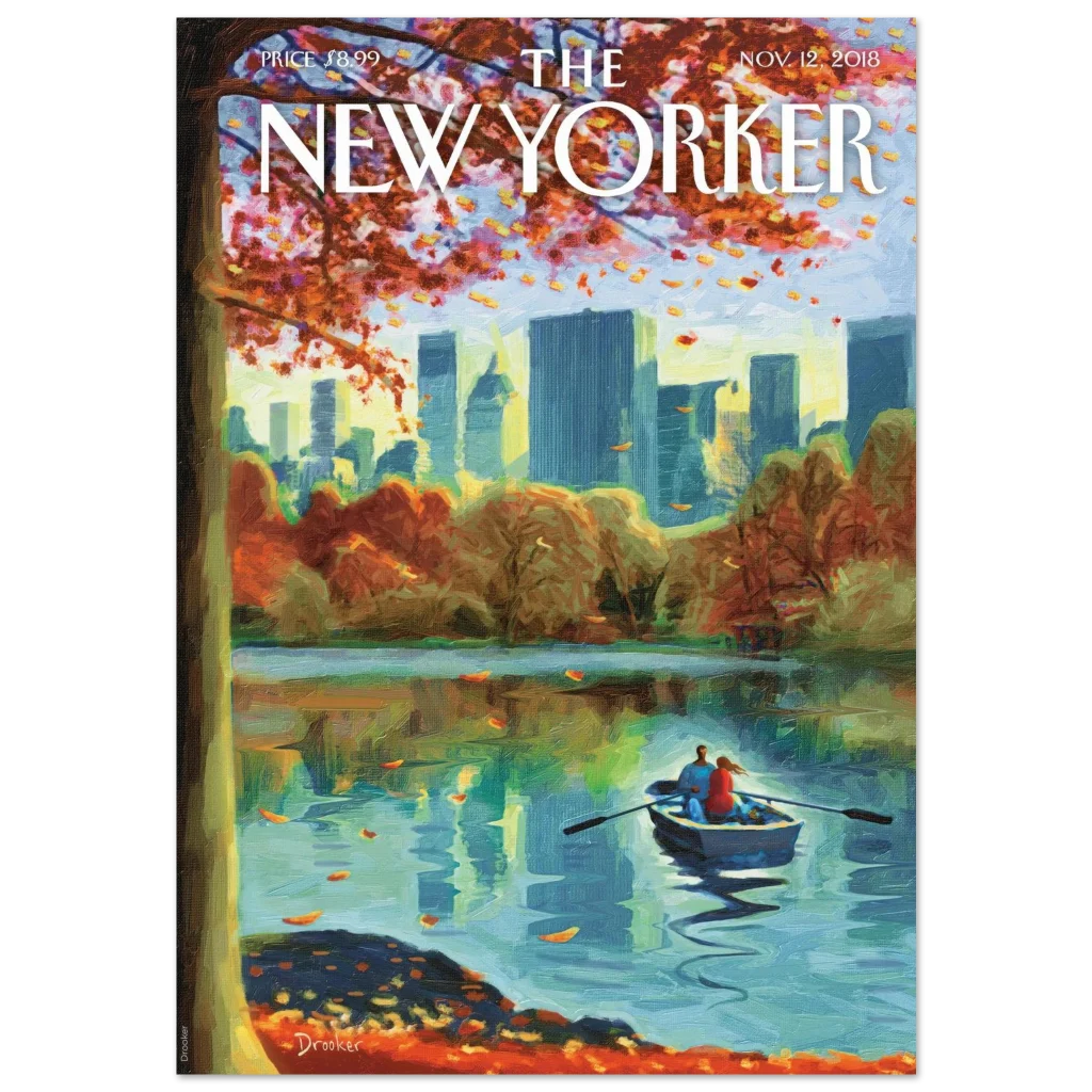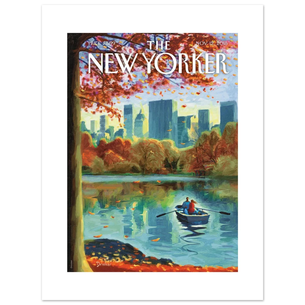 Capture the serene beauty of autumn in Central Park with this evocative poster, originally a New Yorker cover. The rich, warm tones of falling leaves perfectly complement the tranquil blues of the lake and the distant city skyline, creating a timeless moment of urban escape. It’s an ideal piece to bring a touch of contemplative elegance and vibrant fall color to any room.