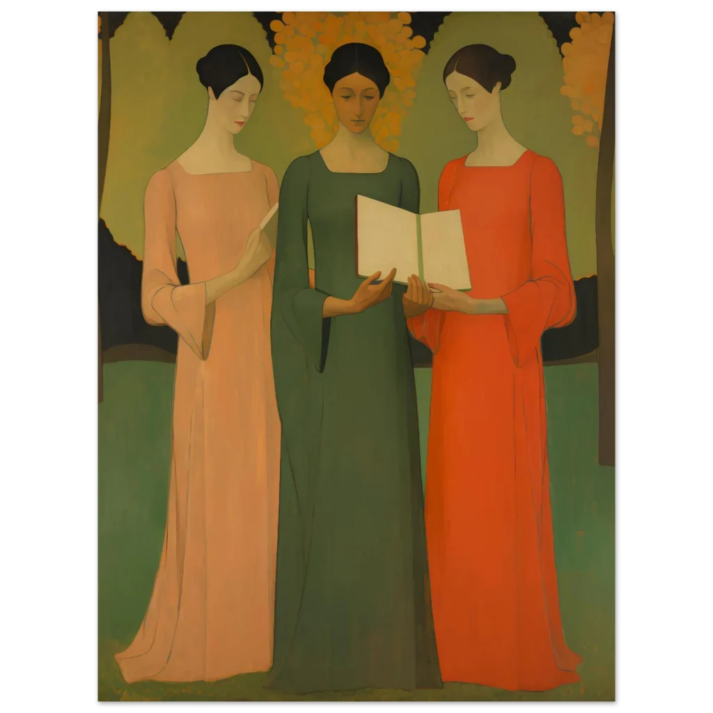 Capture the tranquil beauty and rich, earthy tones of this evocative artwork, reminiscent of an autumn grove, with our premium matte paper poster. Featuring three serene figures in flowing robes of deep forest green, warm coral, and soft peach against a backdrop of golden foliage, this piece brings a sense of contemplative peace and vibrant, natural elegance to any space. It’s an ideal focal point for art lovers seeking a blend of classic charm and modern simplicity.