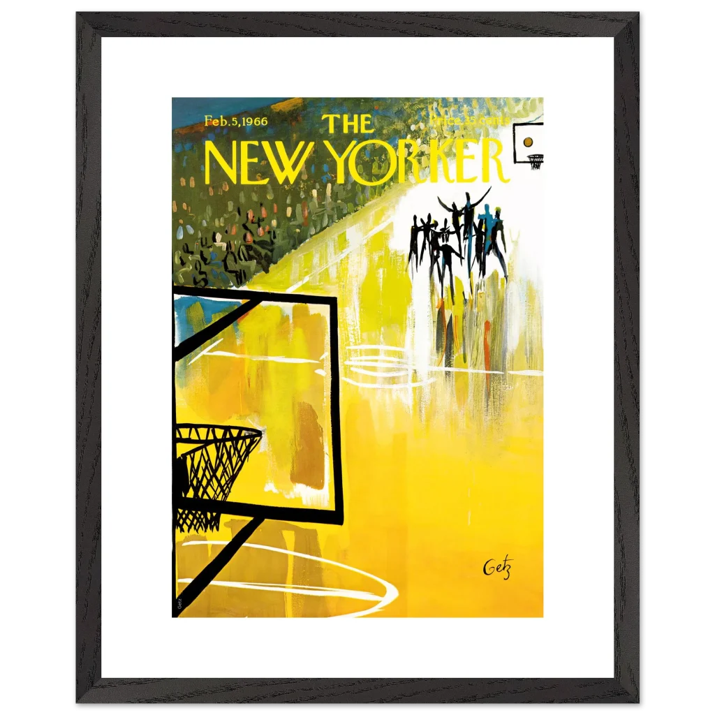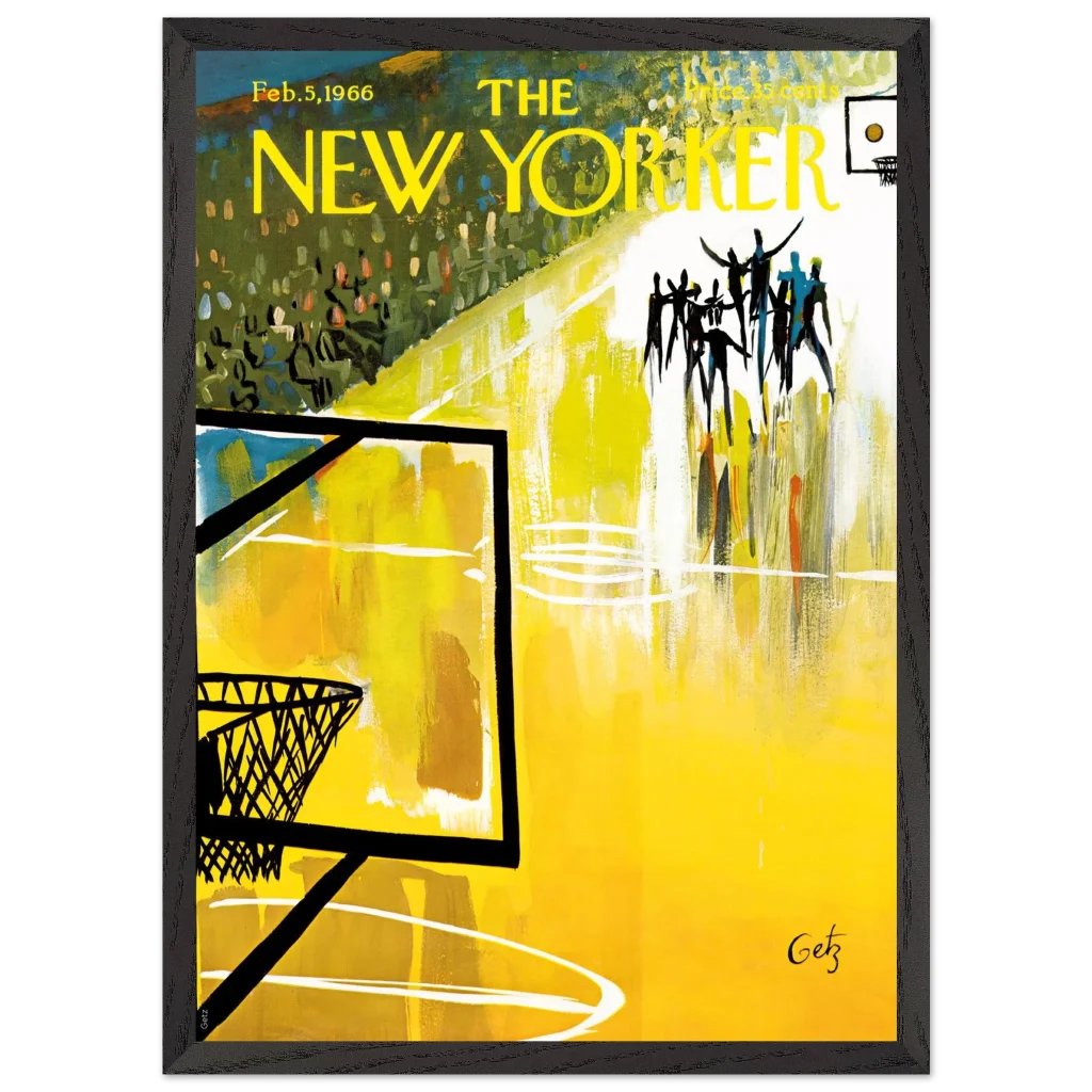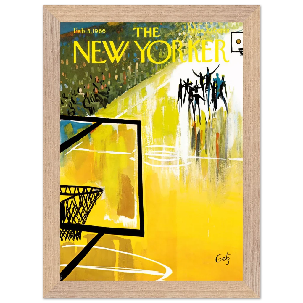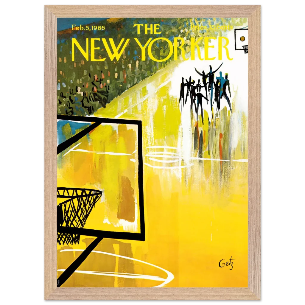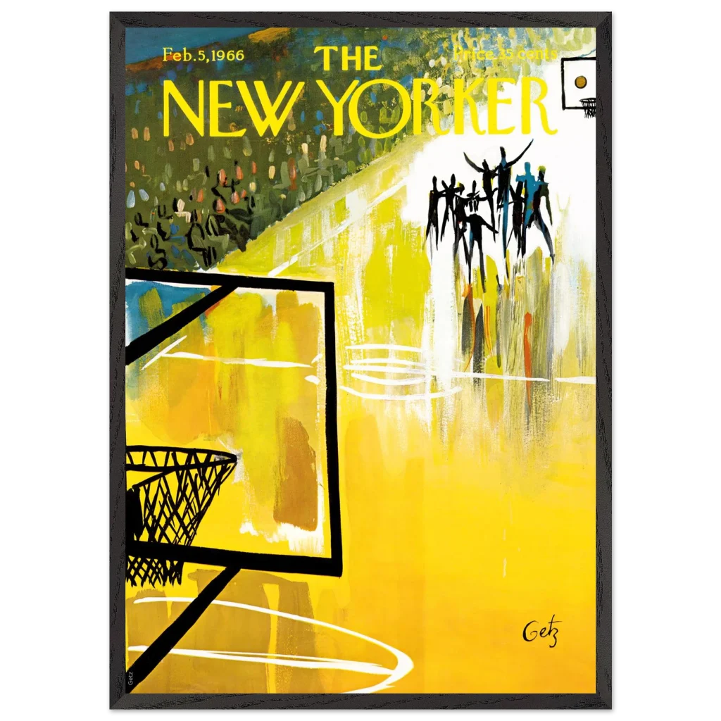 Immerse yourself in the dynamic energy of this vibrant abstract basketball court art, a timeless piece that captures the spirit of the game with bold strokes and a captivating yellow palette. This poster, inspired by the iconic New Yorker cover from Feb. 5, 1966, brings a unique blend of vintage charm and lively abstraction to any space, making it perfect for sports enthusiasts and art lovers alike.