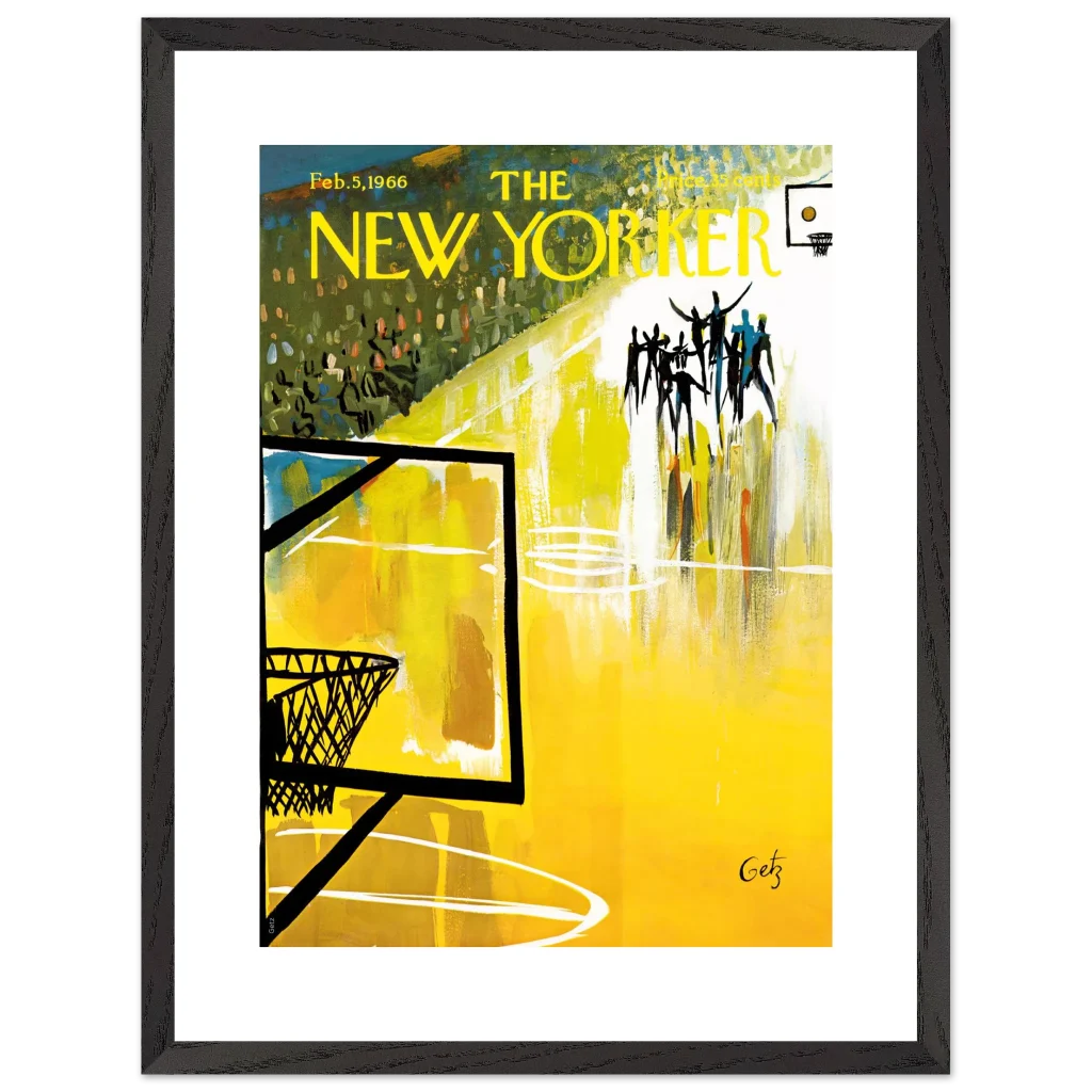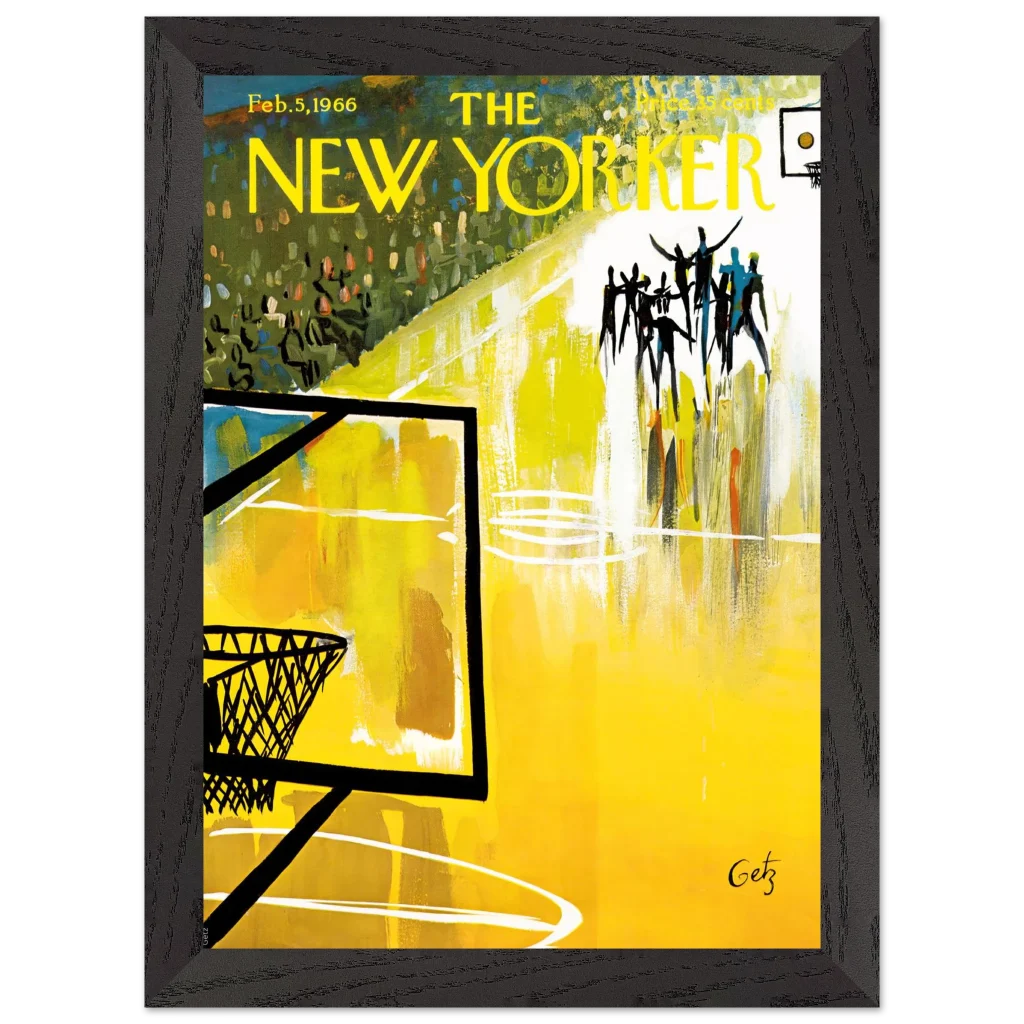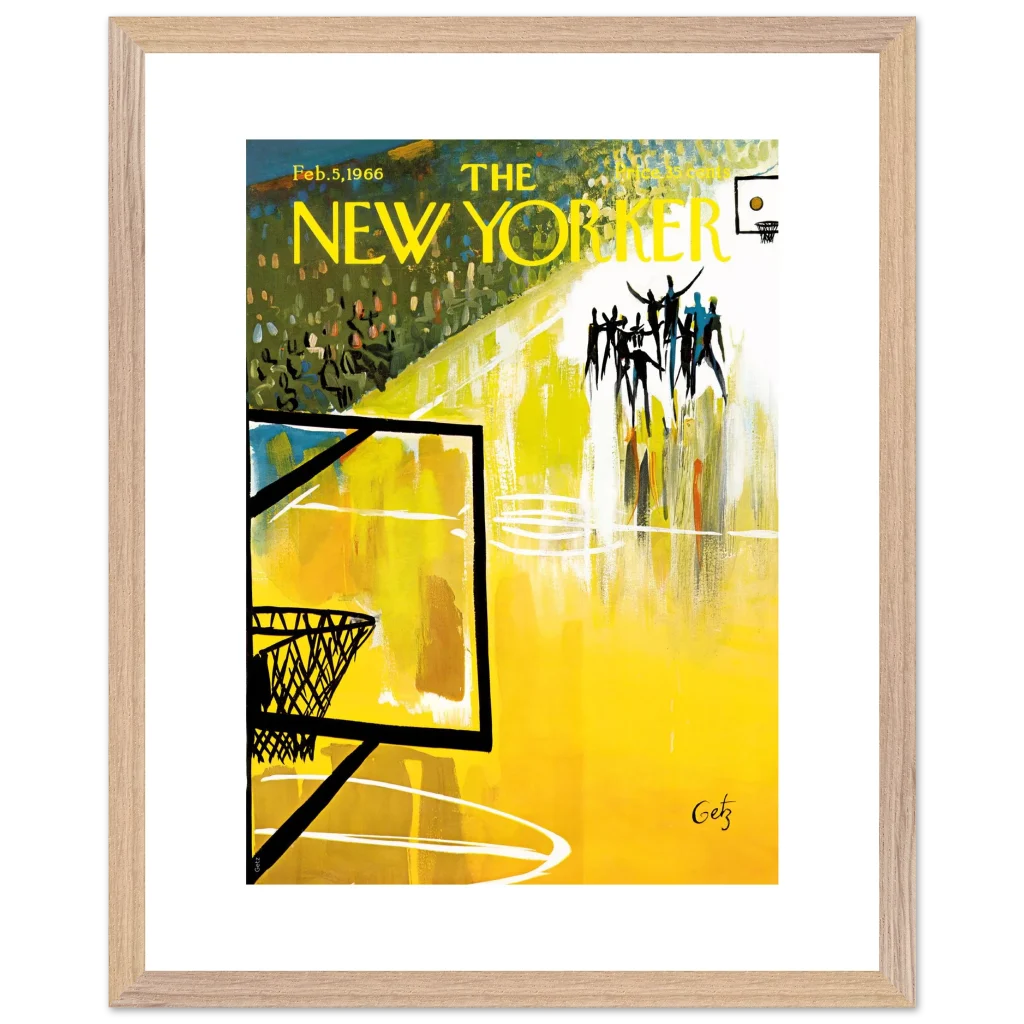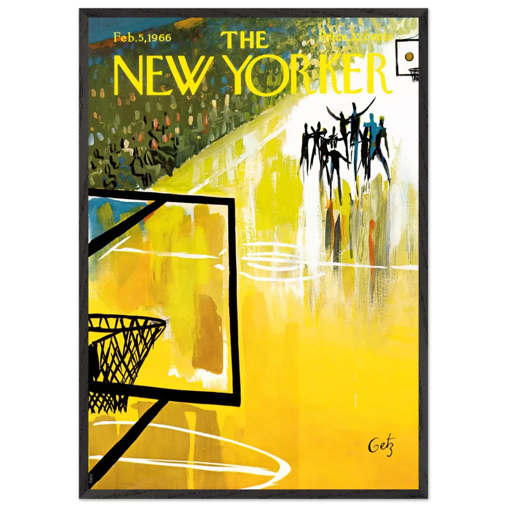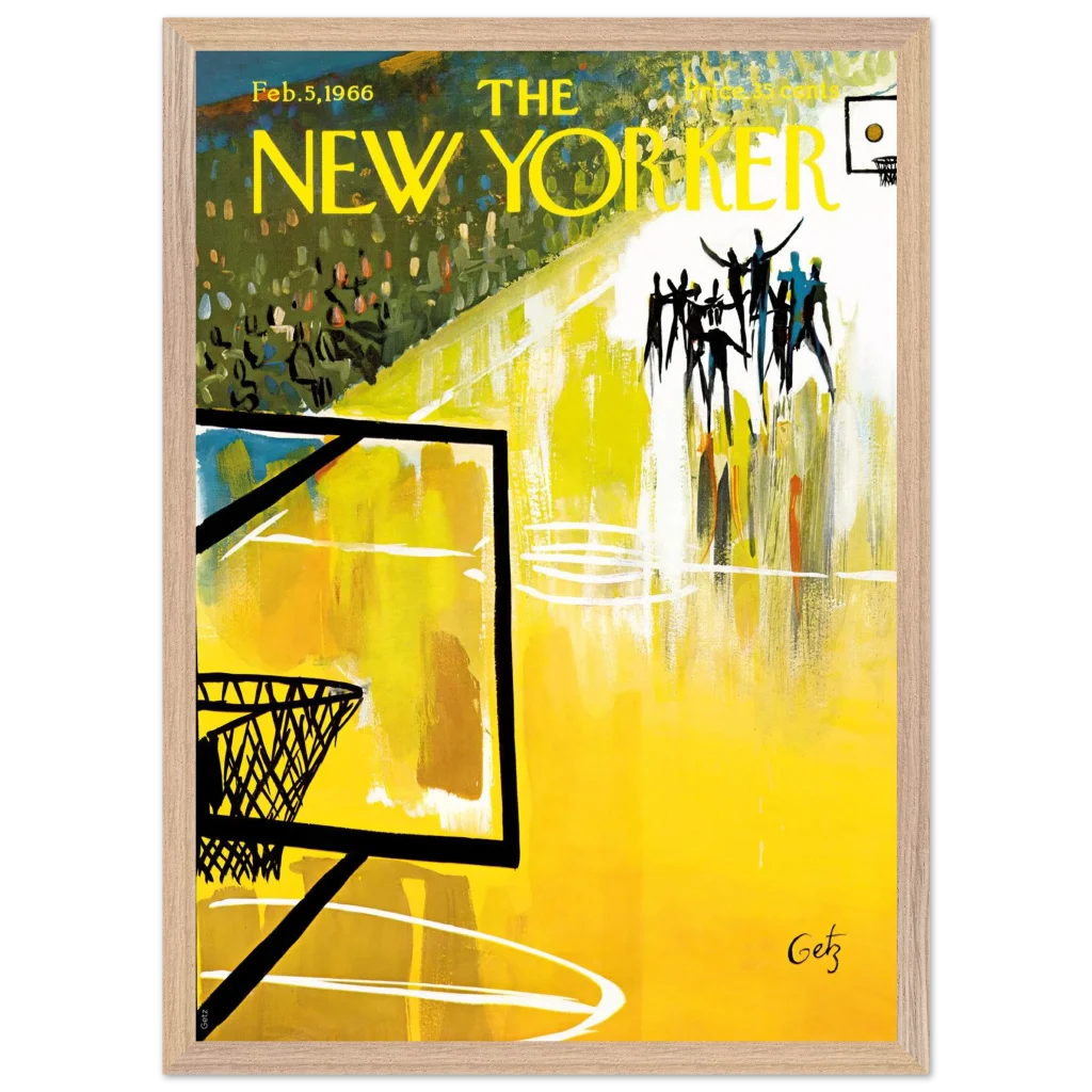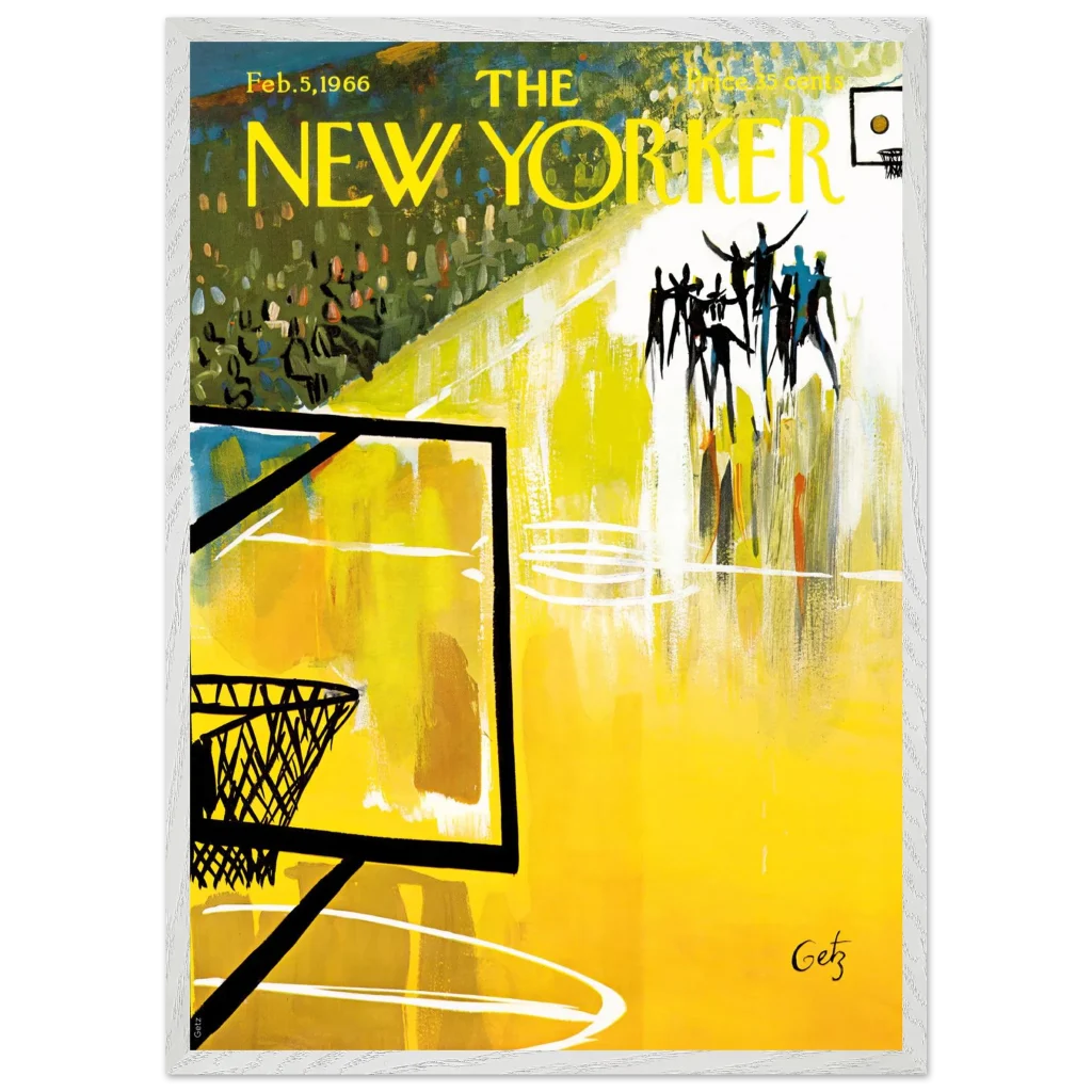 Immerse yourself in the dynamic energy of this vibrant abstract basketball court art, a timeless piece that captures the spirit of the game with bold strokes and a captivating yellow palette. This poster, inspired by the iconic New Yorker cover from Feb. 5, 1966, brings a unique blend of vintage charm and lively abstraction to any space, making it perfect for sports enthusiasts and art lovers alike.