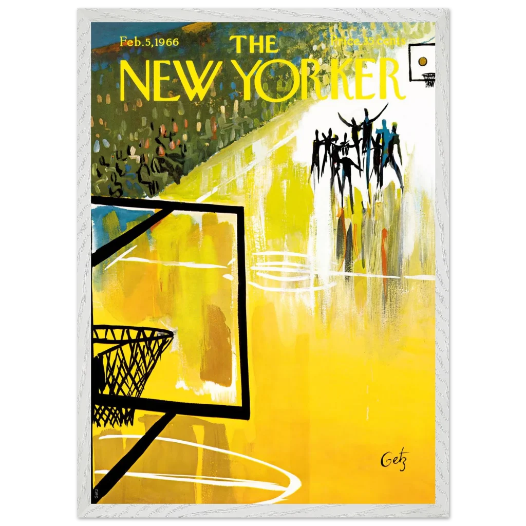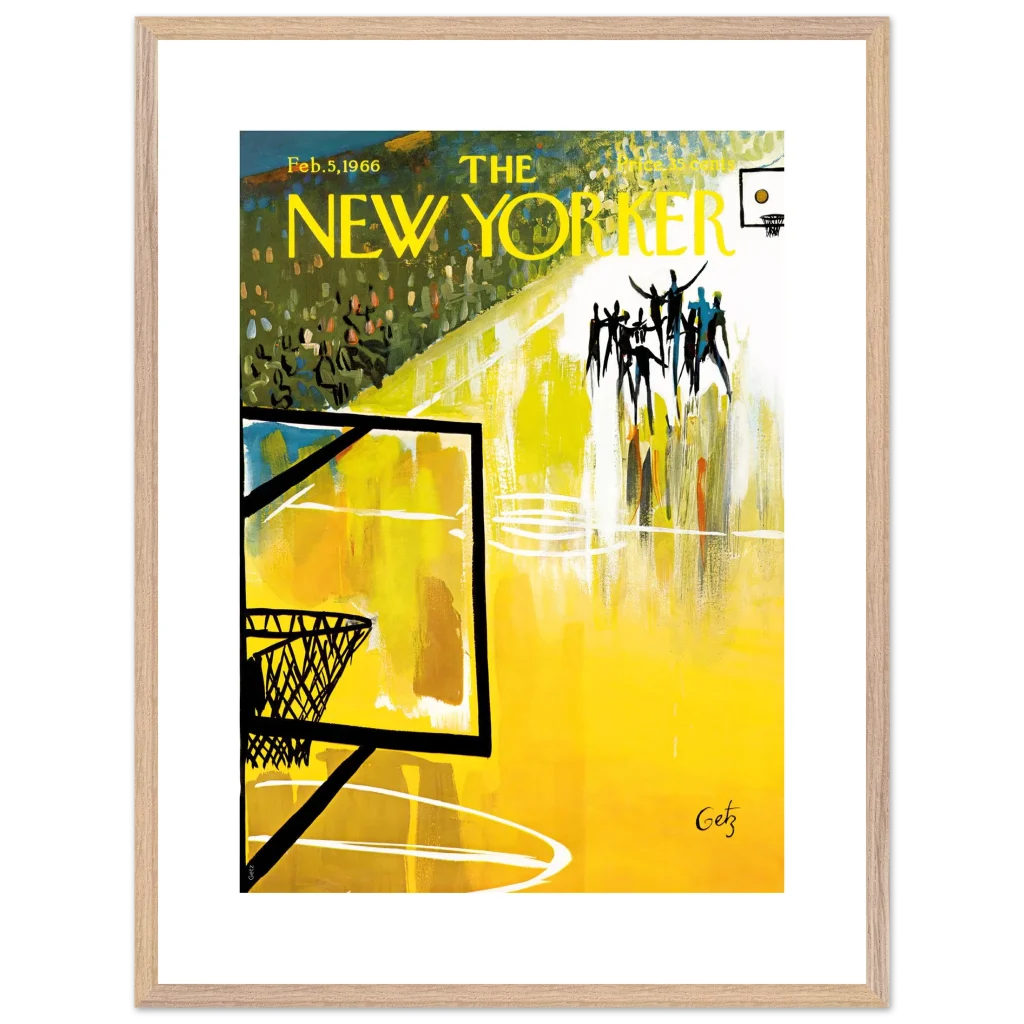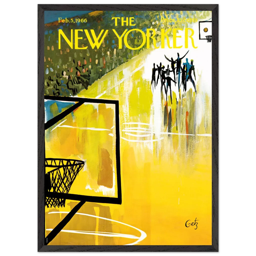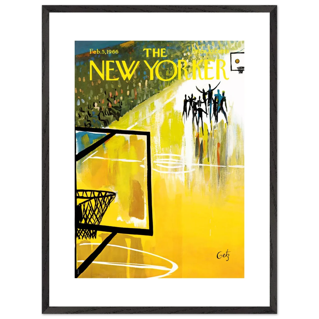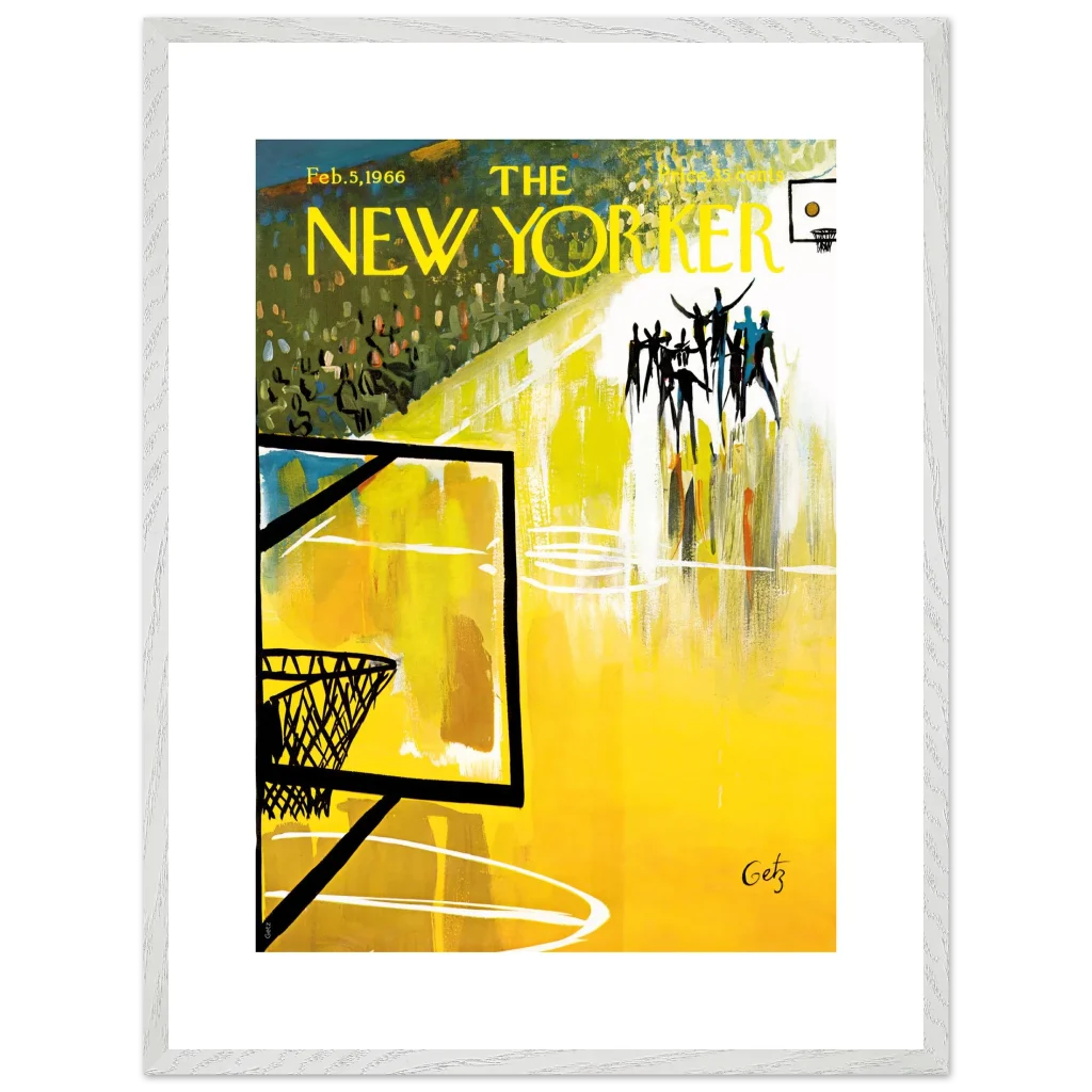Immerse yourself in the dynamic energy of this vibrant abstract basketball court art, a timeless piece that captures the spirit of the game with bold strokes and a captivating yellow palette. This poster, inspired by the iconic New Yorker cover from Feb. 5, 1966, brings a unique blend of vintage charm and lively abstraction to any space, making it perfect for sports enthusiasts and art lovers alike.