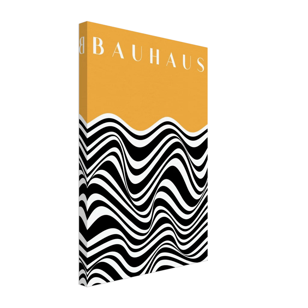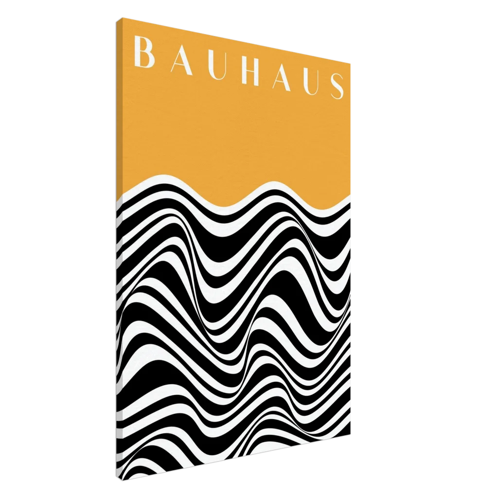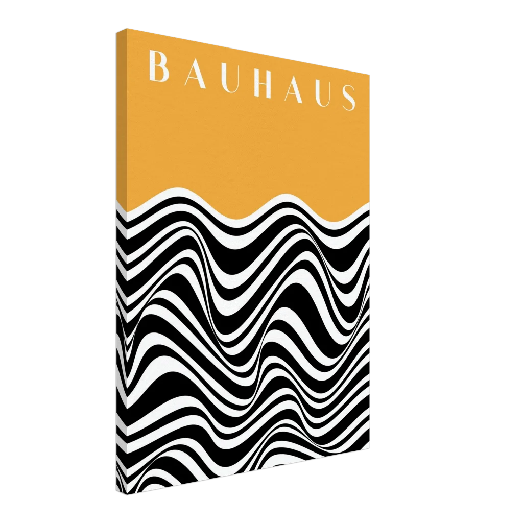 Immerse yourself in the dynamic world of Op Art with our Bauhaus-inspired canvas print. Featuring a mesmerizing pattern of black and white waves set against a sophisticated golden hue, this piece brings a playful yet elegant illusion of movement to any space. The canvas texture enhances the image’s natural look and feel, creating a truly immersive art experience that will captivate onlookers and spark conversation.