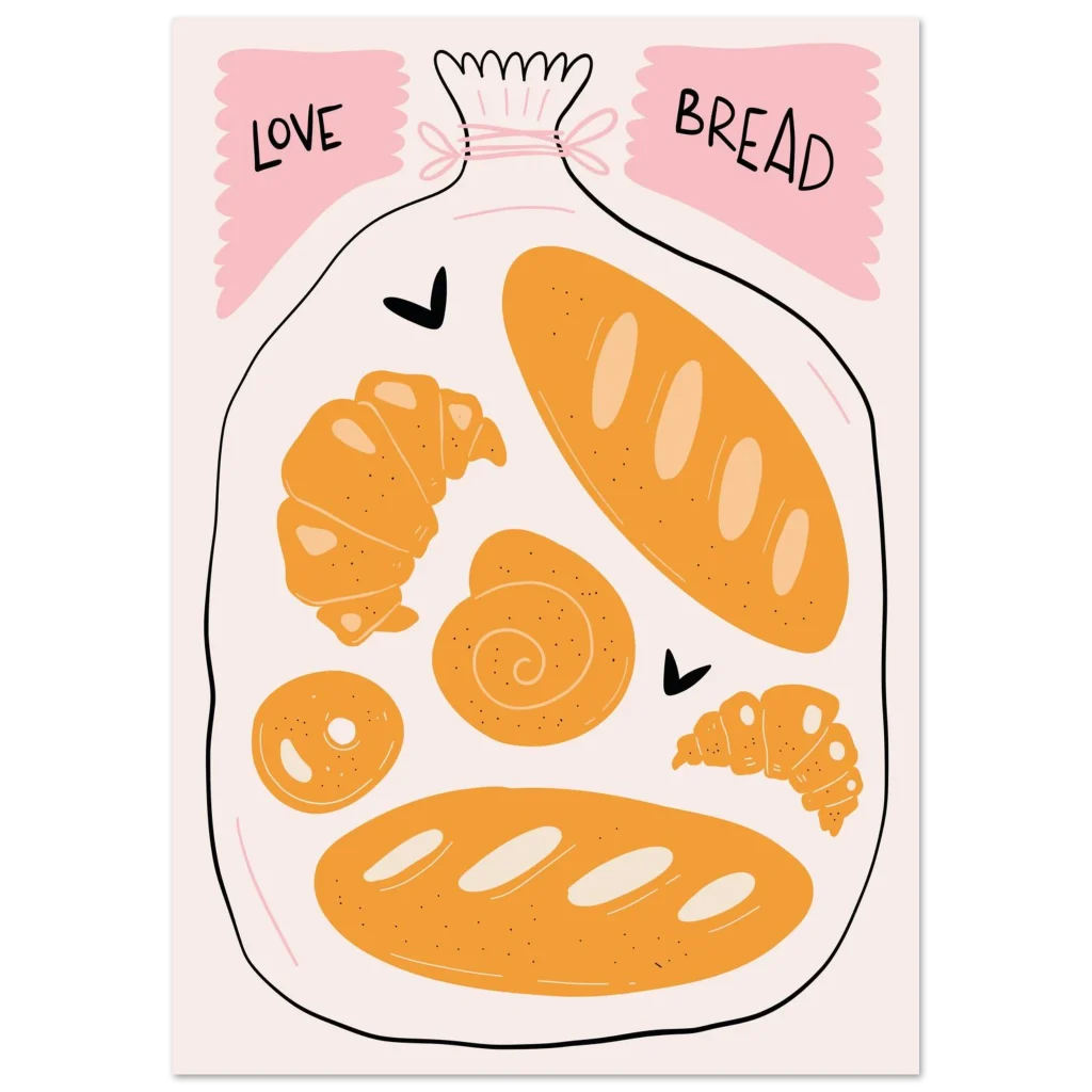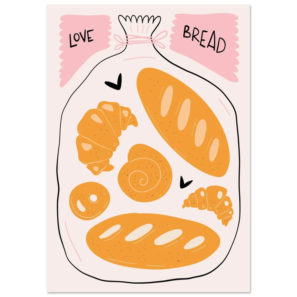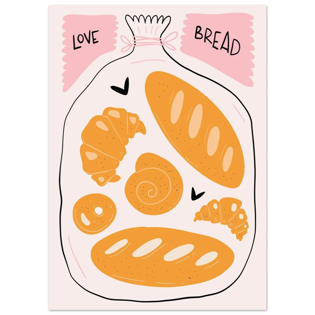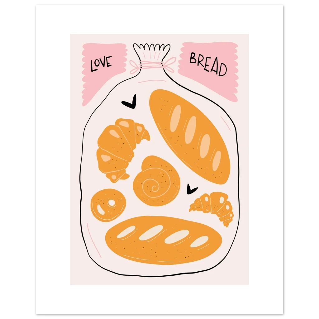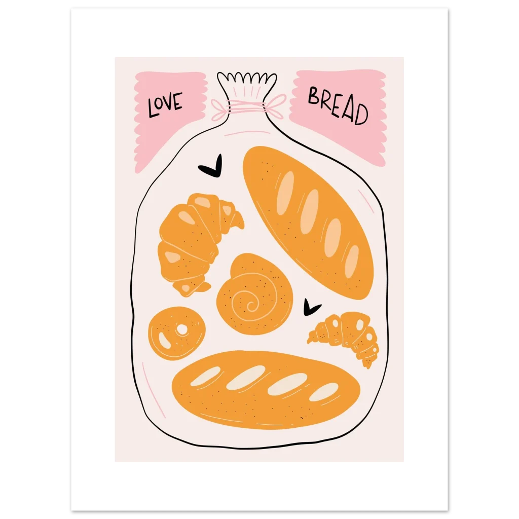 Bring the warmth and delight of a fresh bakery into your home with our ‘Love Bread’ art print. Featuring an adorable, hand-drawn collection of golden pastries and loaves nestled in a bag, this poster is a charming ode to the simple joy of bread. The soft, inviting color palette of warm oranges, creamy whites, and playful pink accents creates a sweet, comforting focal point for any kitchen, dining area, or cozy nook.