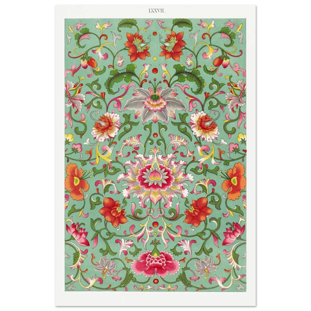 Bring the timeless charm of Chinoiserie into your home with this exquisite floral art print. Adorned with a rich tapestry of vibrant reds, soft pinks, and lush greens against a serene teal background, this poster captures the intricate beauty and delicate balance of traditional Asian botanical motifs. It’s an artistic statement that adds a touch of sophisticated tranquility and historical elegance to any space, perfect for art lovers and those who appreciate cultural richness.