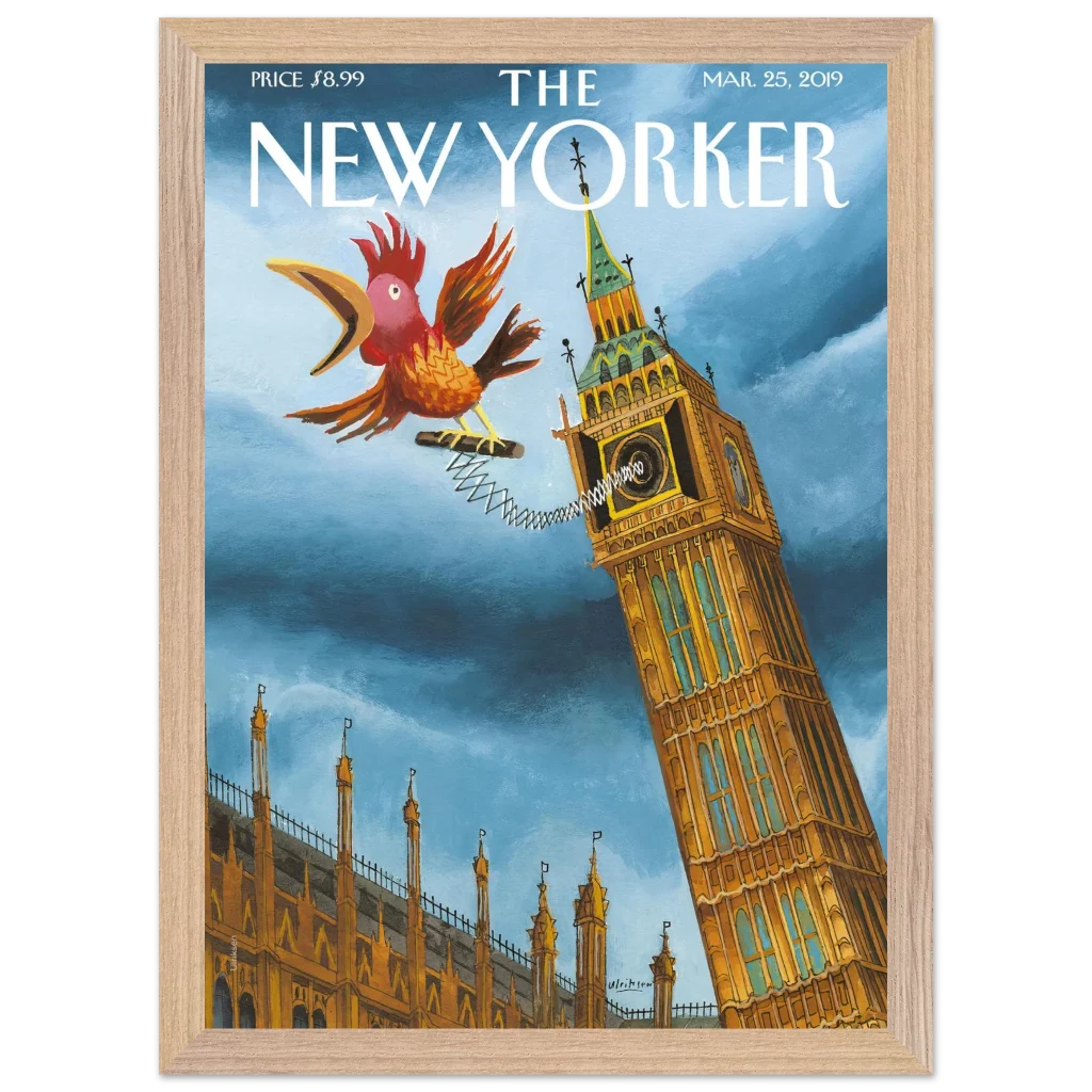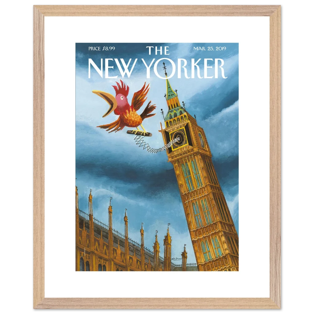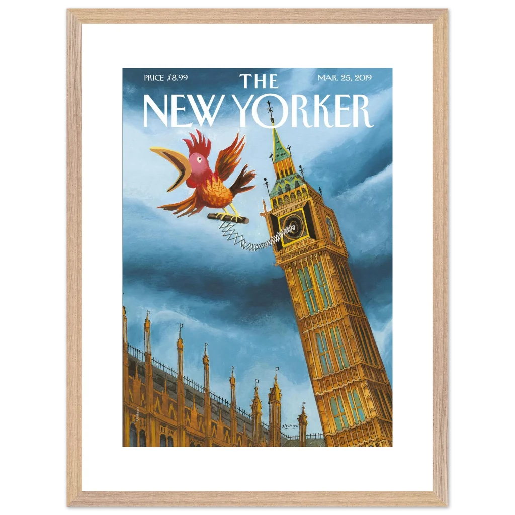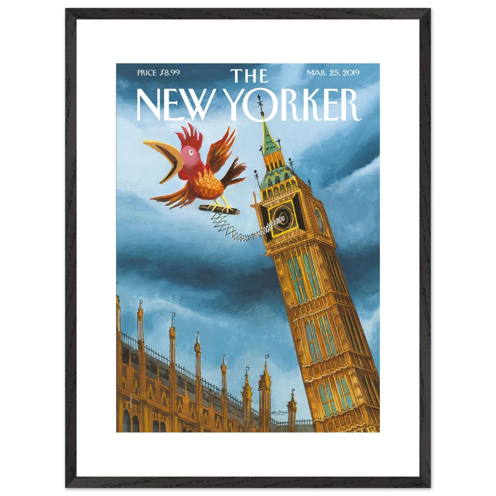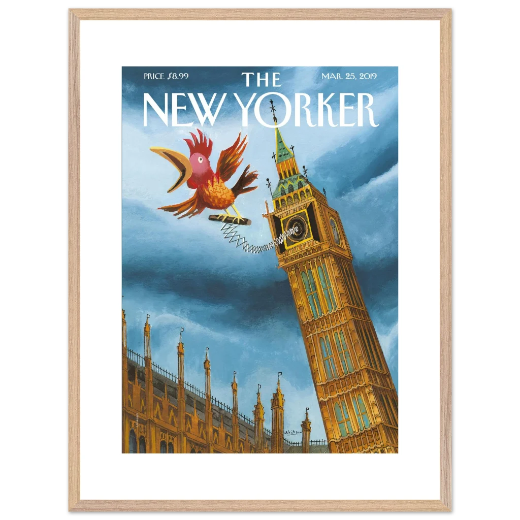 Infuse your space with a touch of British whimsy! This unique art print, originally a New Yorker cover, captures Big Ben in a playful moment, serenaded by a spirited, spring-loaded rooster. The vibrant blues and rich ochres of this illustration bring a charming, unexpected twist to a classic London landmark, perfect for adding character and a smile to any room.
