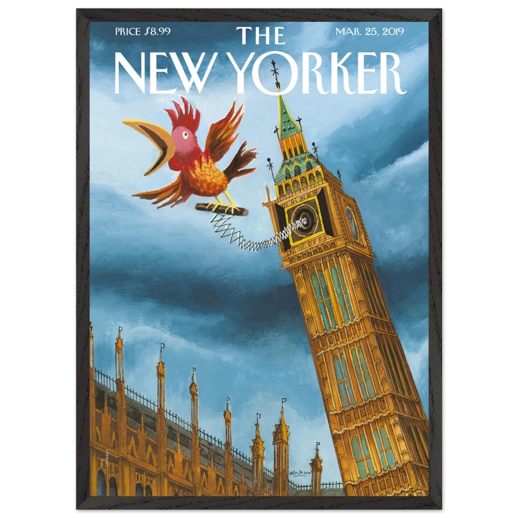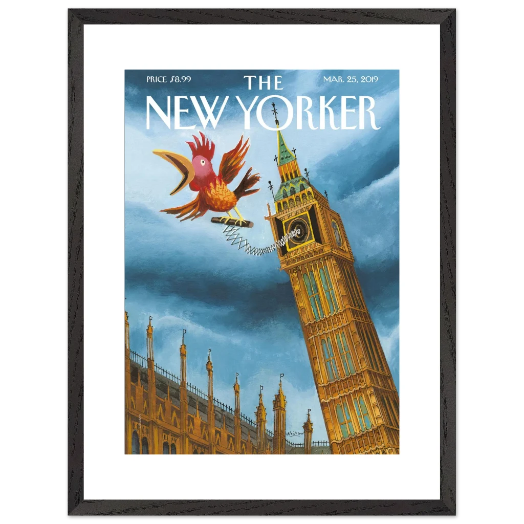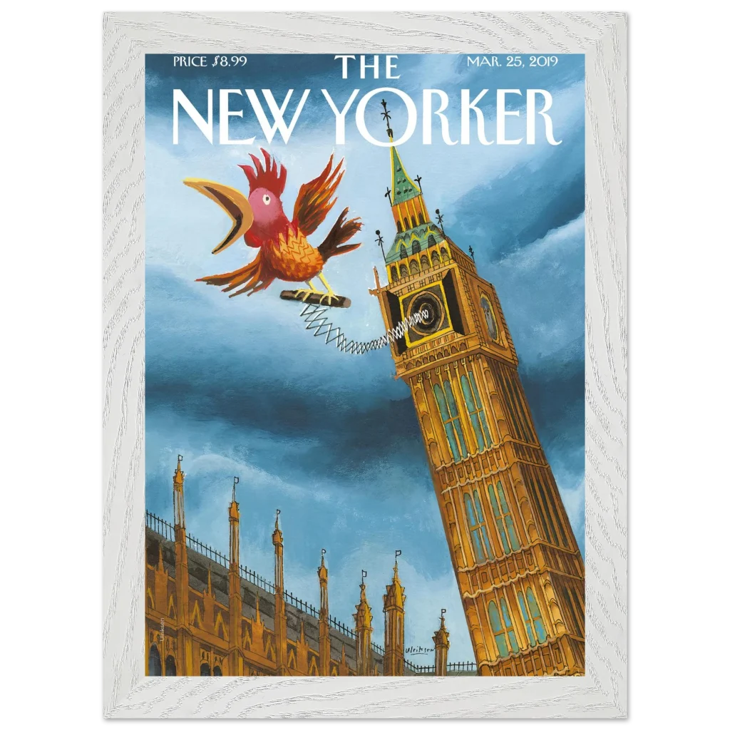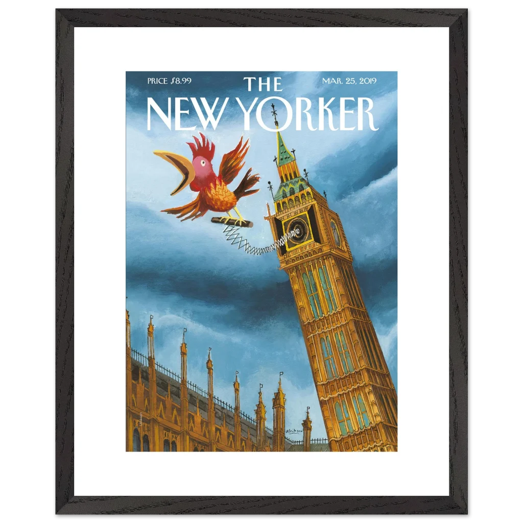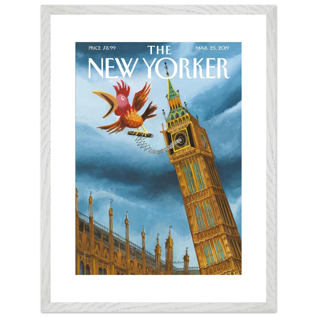Infuse your space with a touch of British whimsy! This unique art print, originally a New Yorker cover, captures Big Ben in a playful moment, serenaded by a spirited, spring-loaded rooster. The vibrant blues and rich ochres of this illustration bring a charming, unexpected twist to a classic London landmark, perfect for adding character and a smile to any room.