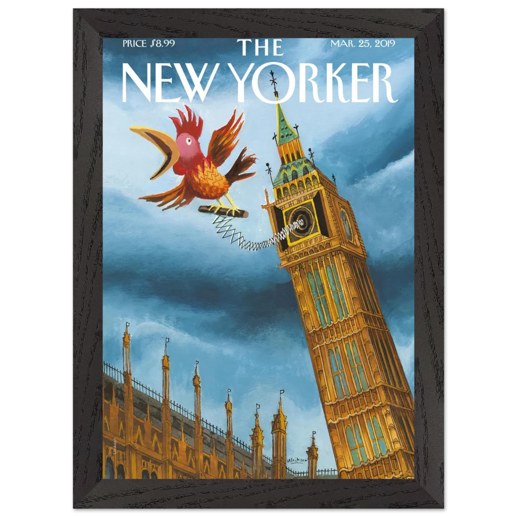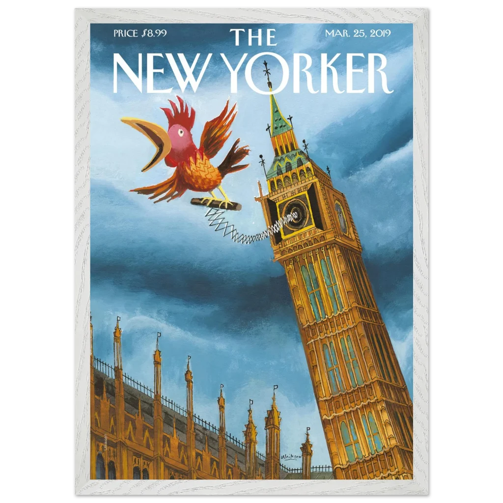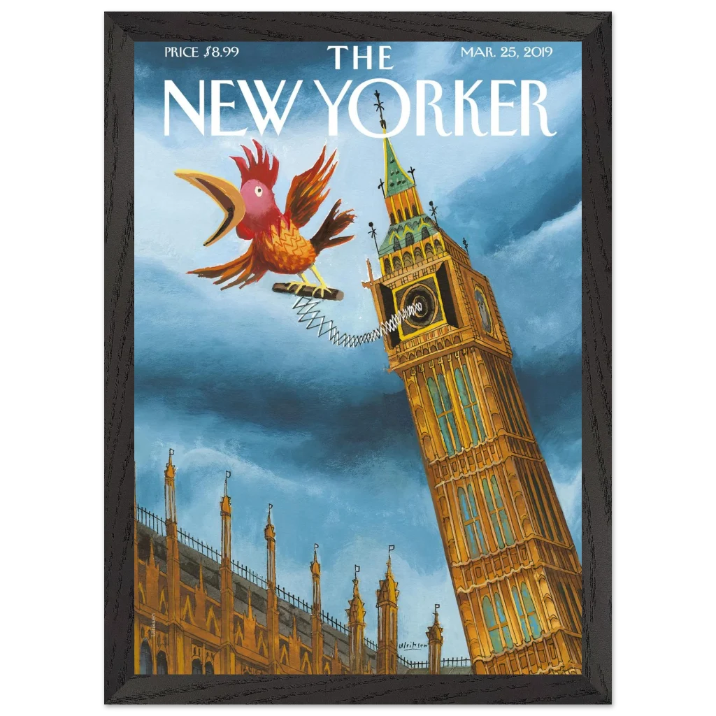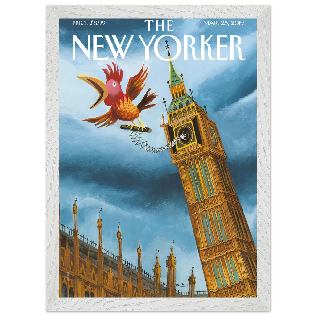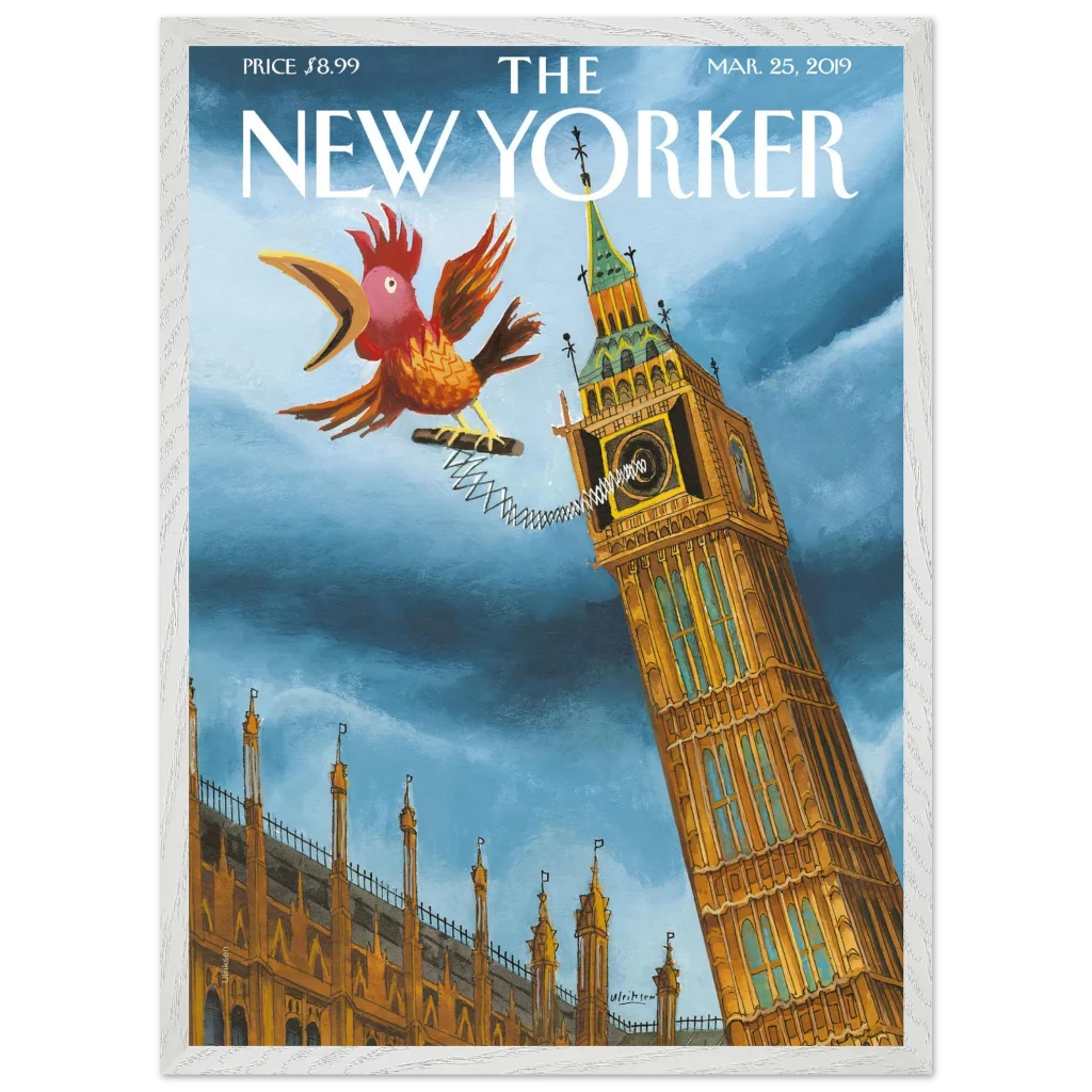Infuse your space with a touch of British whimsy! This unique art print, originally a New Yorker cover, captures Big Ben in a playful moment, serenaded by a spirited, spring-loaded rooster. The vibrant blues and rich ochres of this illustration bring a charming, unexpected twist to a classic London landmark, perfect for adding character and a smile to any room.