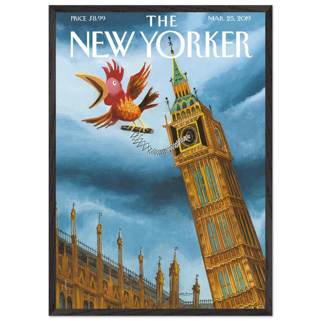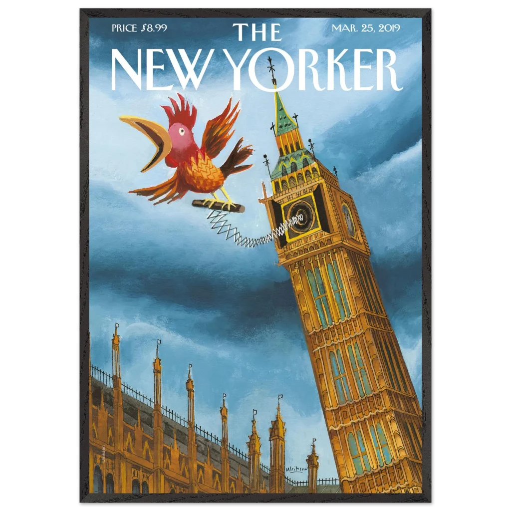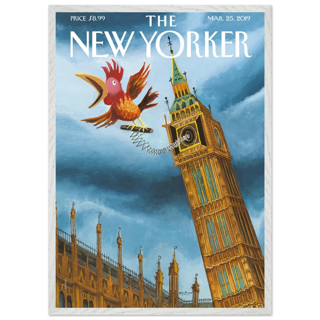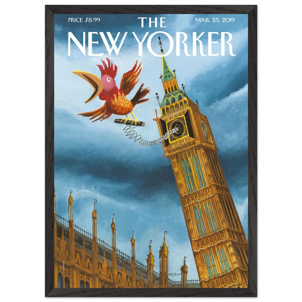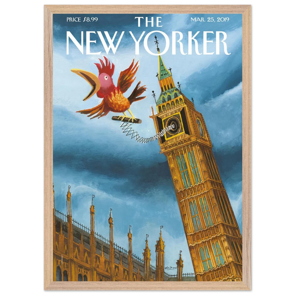 Infuse your space with a touch of British whimsy! This unique art print, originally a New Yorker cover, captures Big Ben in a playful moment, serenaded by a spirited, spring-loaded rooster. The vibrant blues and rich ochres of this illustration bring a charming, unexpected twist to a classic London landmark, perfect for adding character and a smile to any room.
