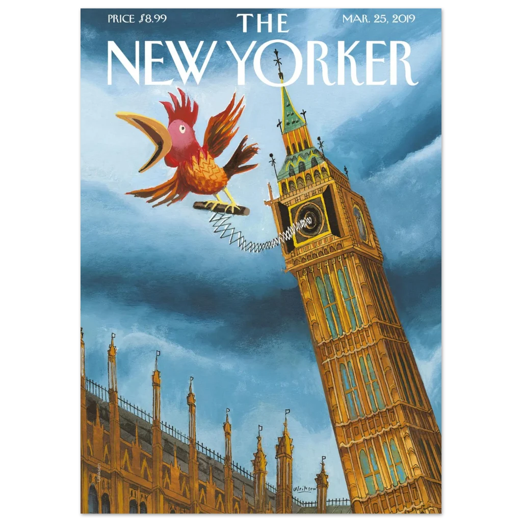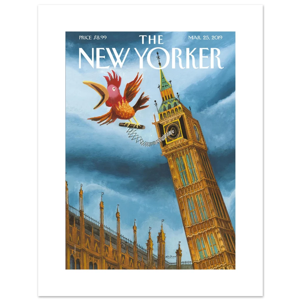 Bring a touch of playful charm and historic grandeur to your space with our ‘Chirpy Westminster’ poster. This captivating artwork, reminiscent of classic New Yorker covers, features a whimsical rooster playfully interacting with the iconic Big Ben against a moody, textured blue sky. It’s a delightful blend of British charm and unexpected humor, perfect for adding character to any room.