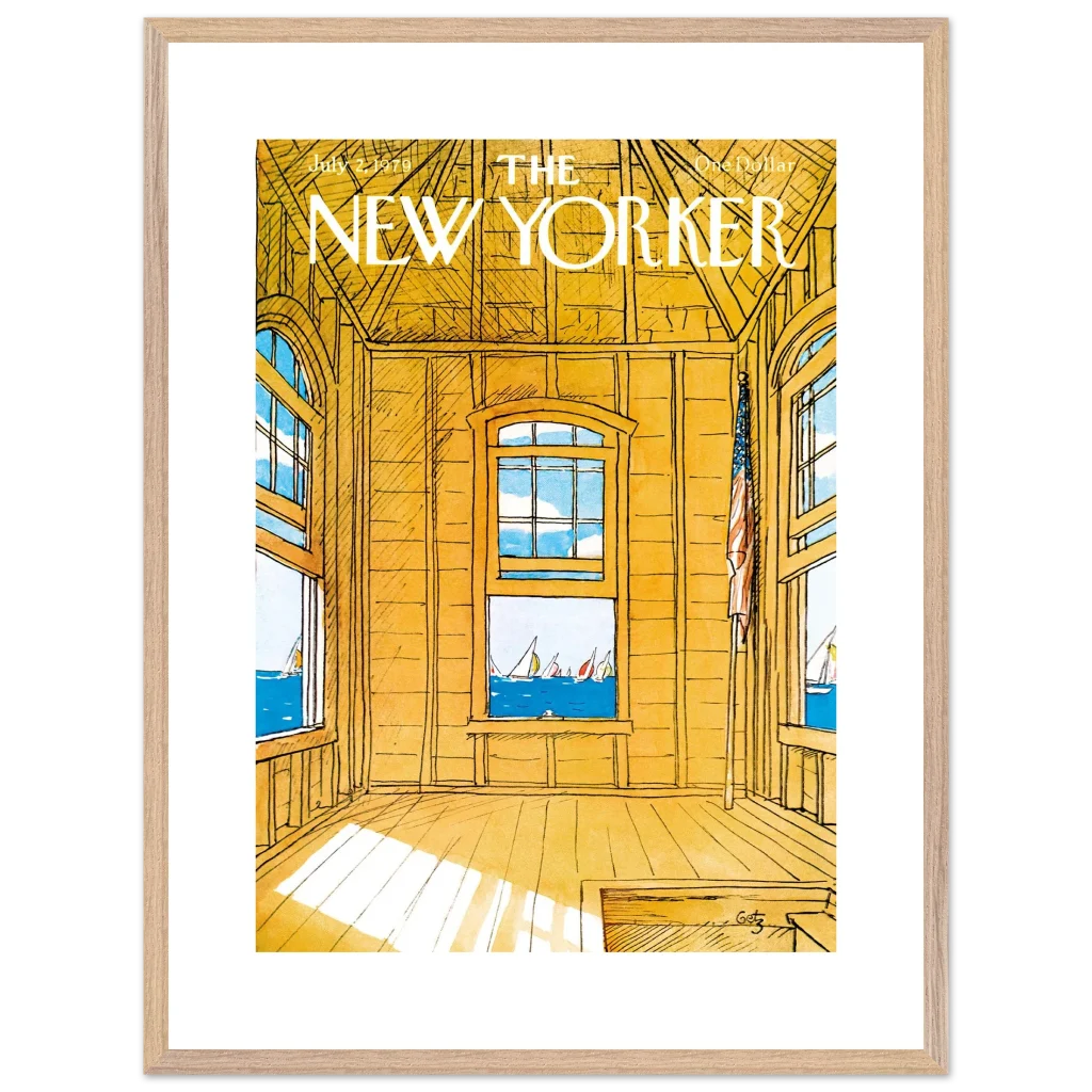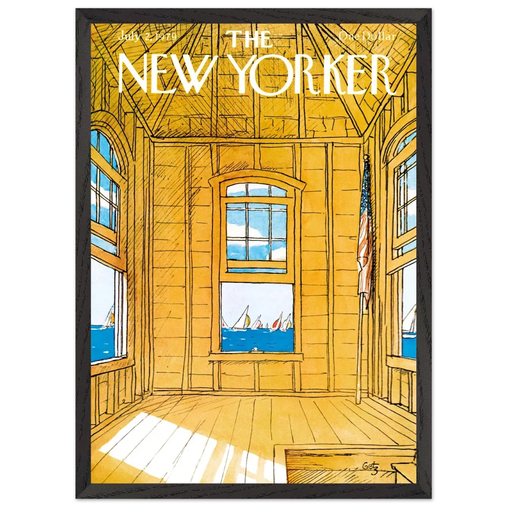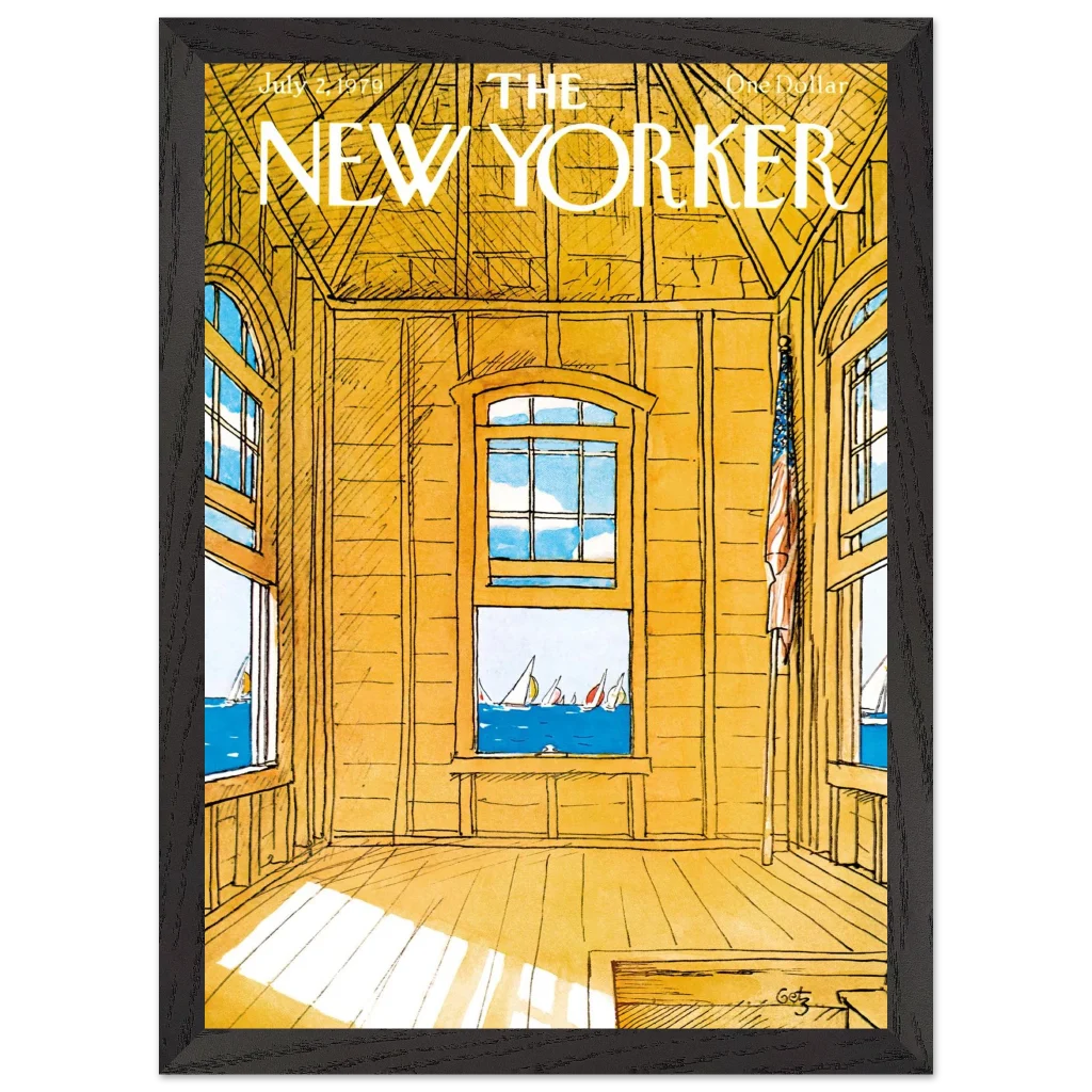 Evoke the serene luxury of a coastal getaway with this exquisite framed poster featuring the iconic July 2, 1979, New Yorker Magazine cover. Gaze upon a tranquil sailing regatta from the sun-drenched interior of a charming wooden boathouse. This artwork captures the leisurely elegance of summer, bringing a touch of vintage sophistication and seaside calm to any room. Perfect for art lovers, sailing enthusiasts, or anyone who appreciates classic illustration and timeless style.