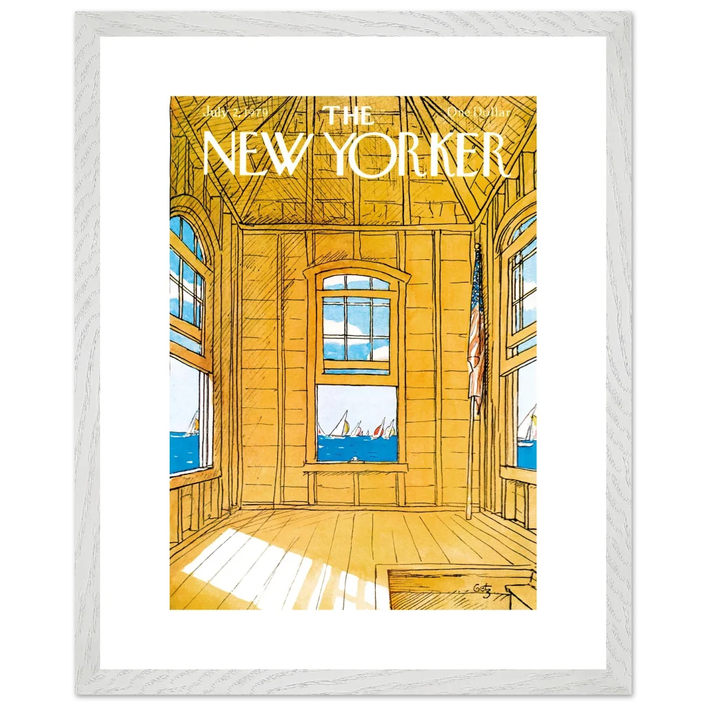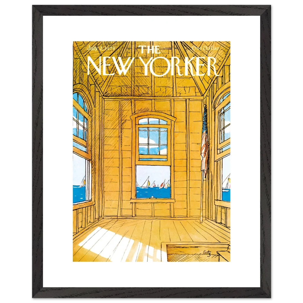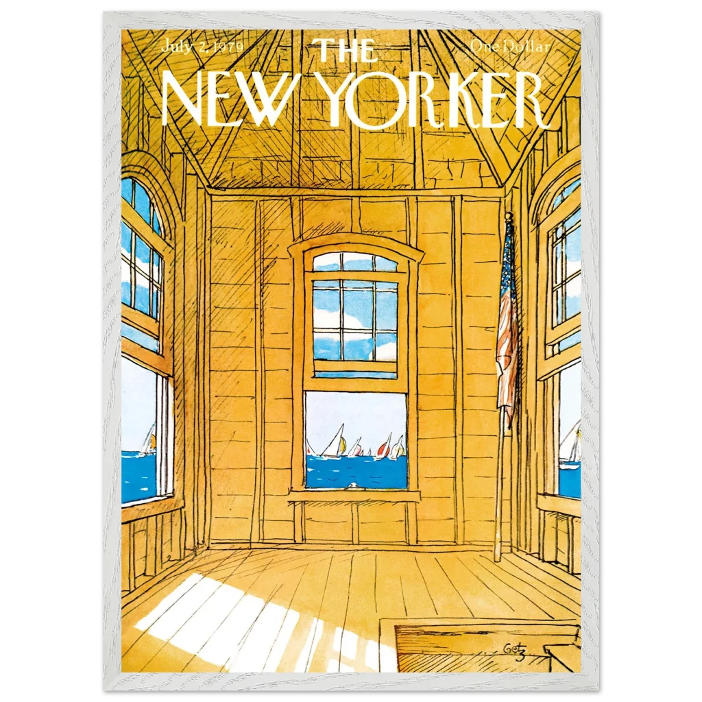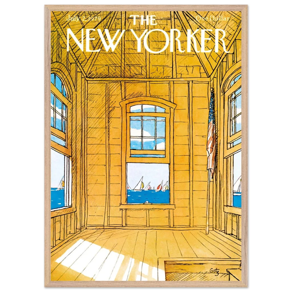 Evoke the serene luxury of a coastal getaway with this exquisite framed poster featuring the iconic July 2, 1979, New Yorker Magazine cover. Gaze upon a tranquil sailing regatta from the sun-drenched interior of a charming wooden boathouse. This artwork captures the leisurely elegance of summer, bringing a touch of vintage sophistication and seaside calm to any room. Perfect for art lovers, sailing enthusiasts, or anyone who appreciates classic illustration and timeless style.
