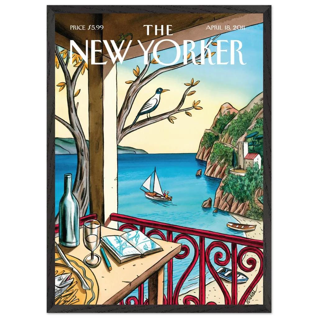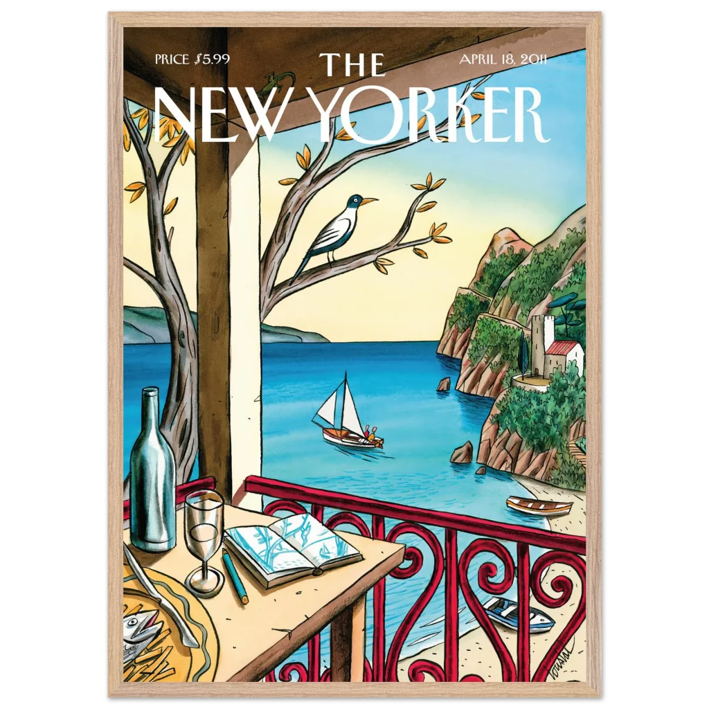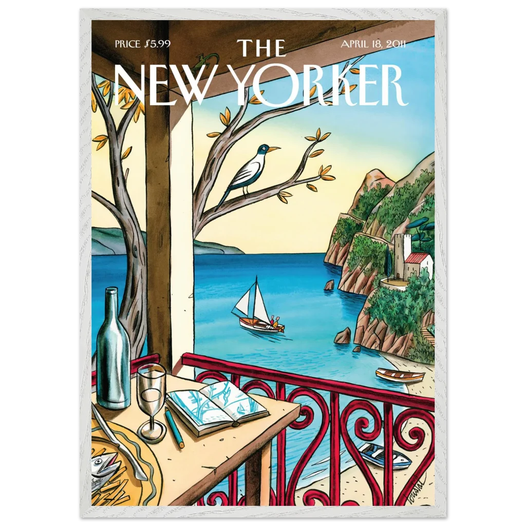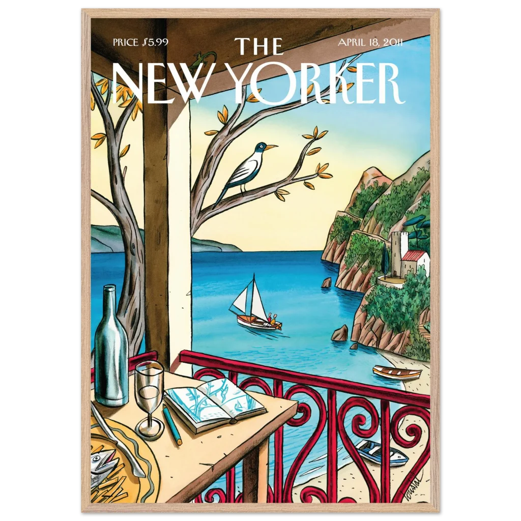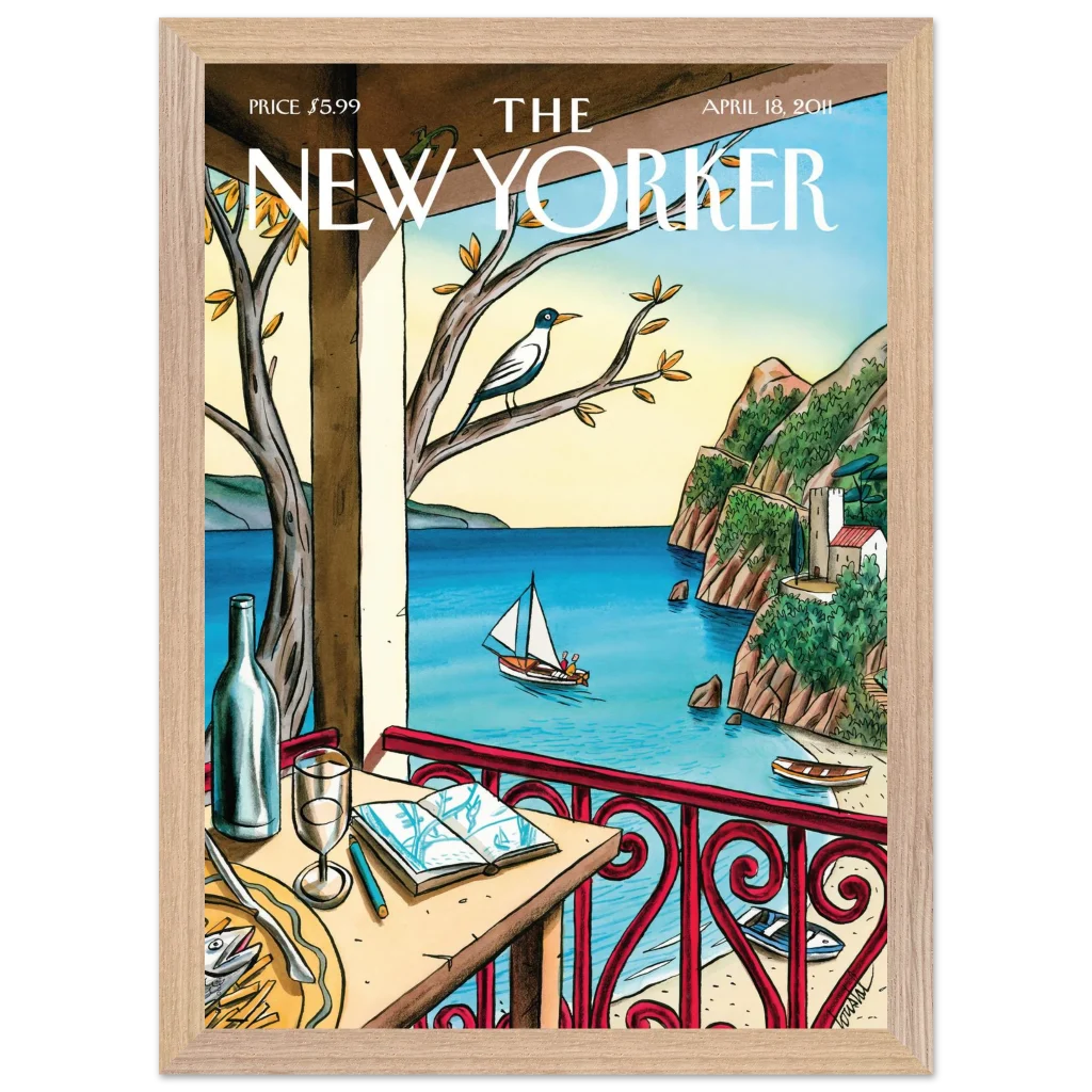 Transport yourself to a serene coastal escape with this charming New Yorker cover illustration. Featuring a tranquil balcony dining scene overlooking a sparkling blue sea, complete with a sailboat, quaint village, and a contented bird, this artwork captures the essence of a perfect European holiday. It’s the ideal piece to infuse your home with a sense of relaxation and refined style.