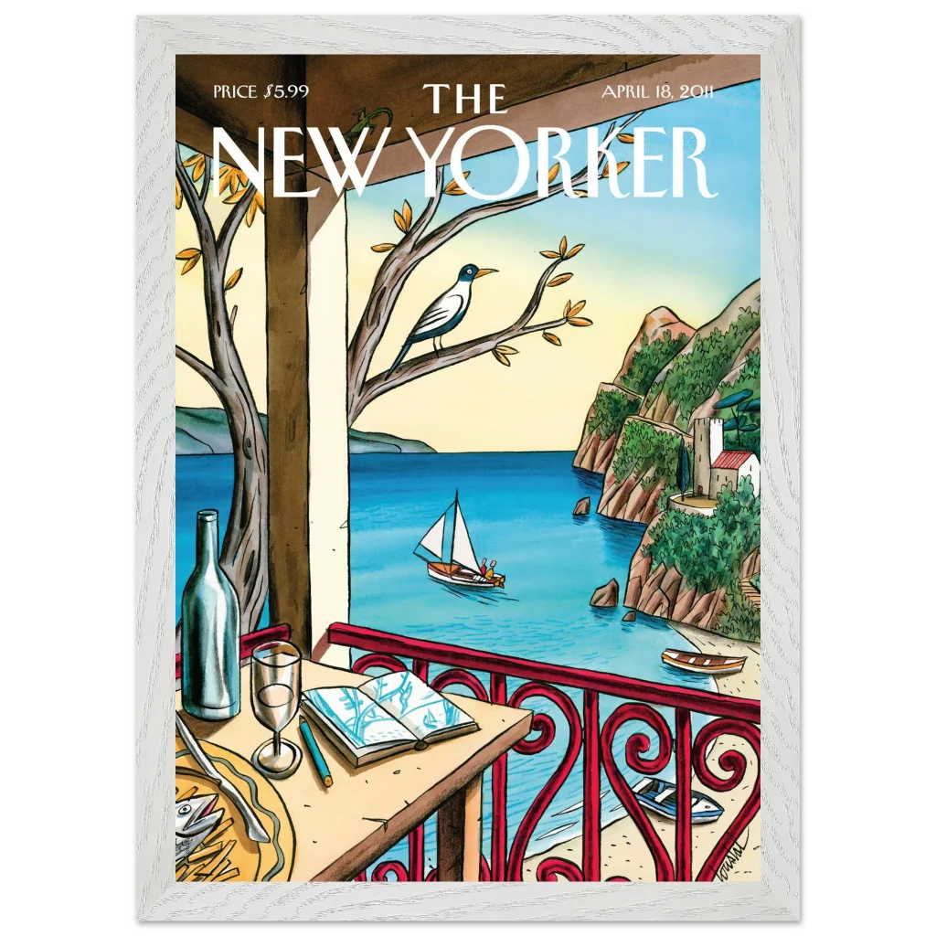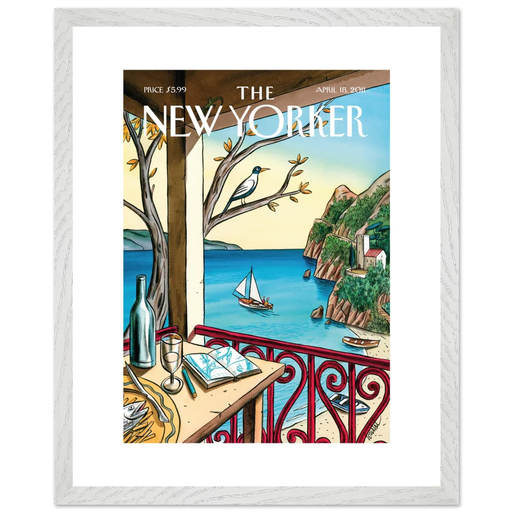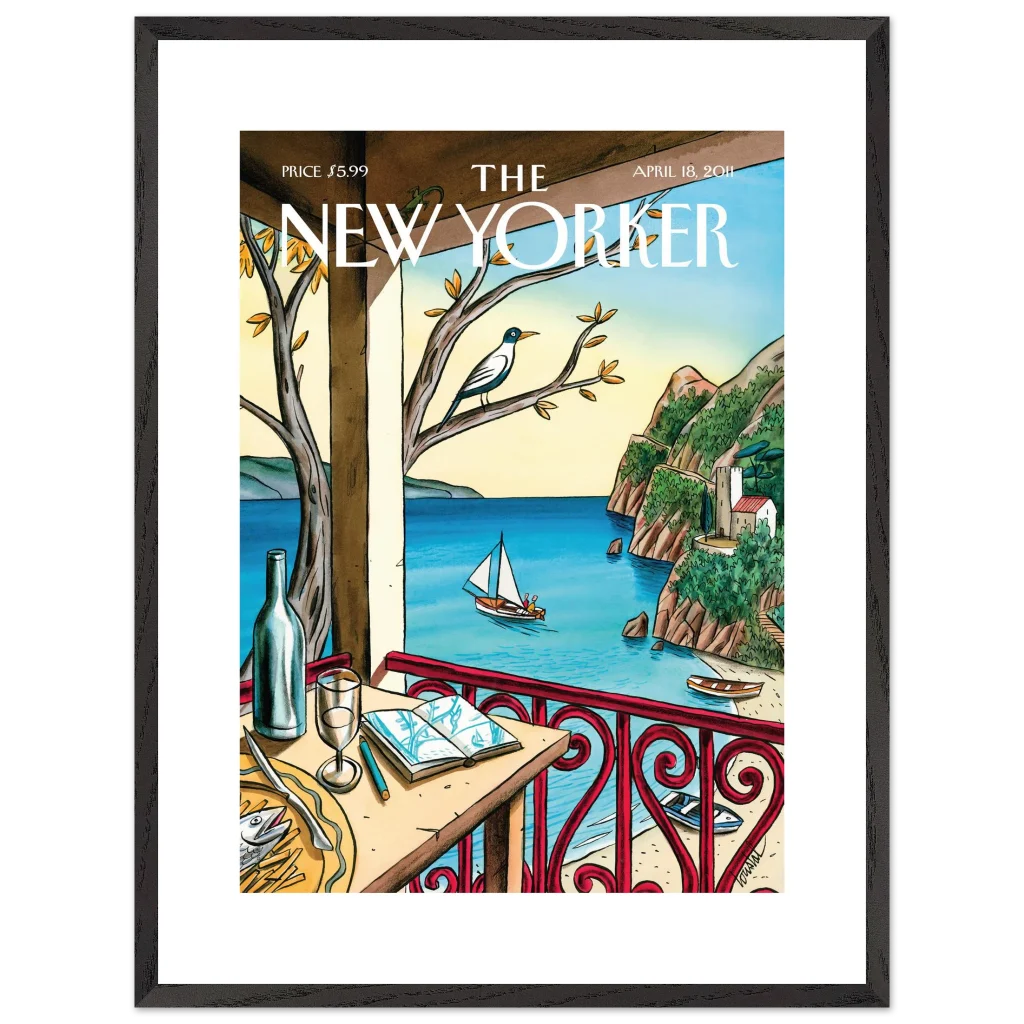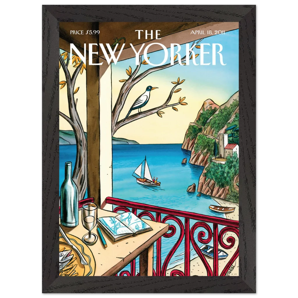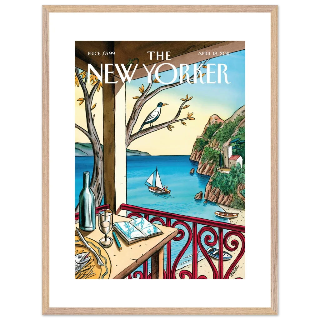 Transport yourself to a serene coastal escape with this charming New Yorker cover illustration. Featuring a tranquil balcony dining scene overlooking a sparkling blue sea, complete with a sailboat, quaint village, and a contented bird, this artwork captures the essence of a perfect European holiday. It’s the ideal piece to infuse your home with a sense of relaxation and refined style.