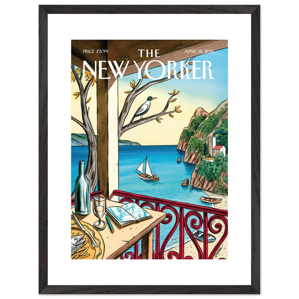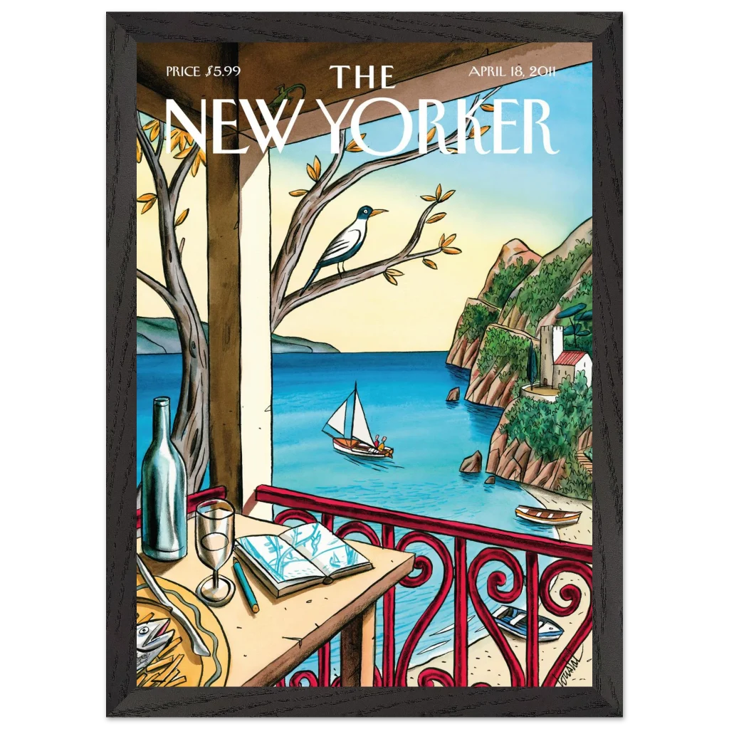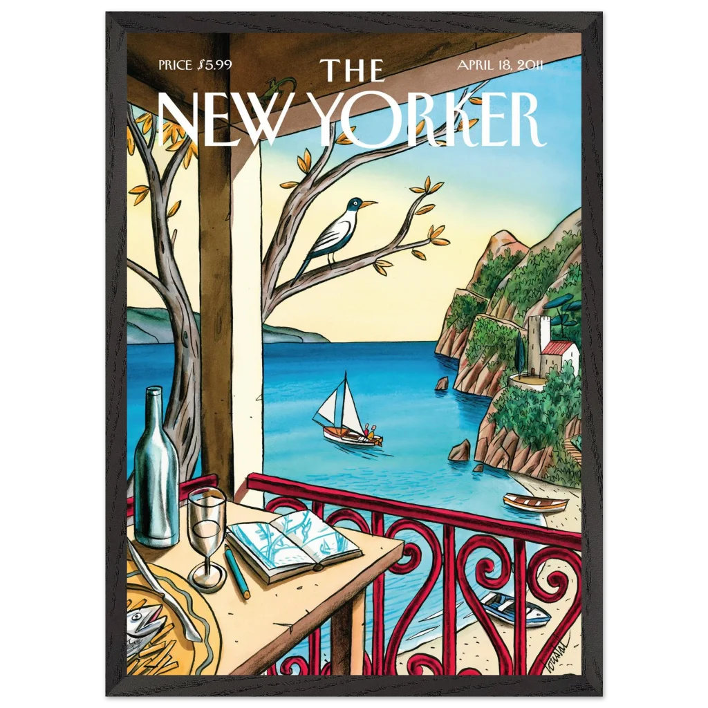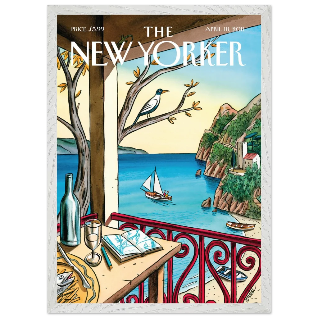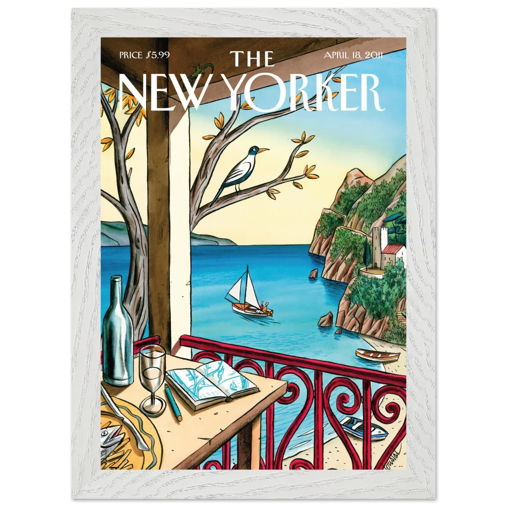Transport yourself to a serene coastal escape with this charming New Yorker cover illustration. Featuring a tranquil balcony dining scene overlooking a sparkling blue sea, complete with a sailboat, quaint village, and a contented bird, this artwork captures the essence of a perfect European holiday. It’s the ideal piece to infuse your home with a sense of relaxation and refined style.