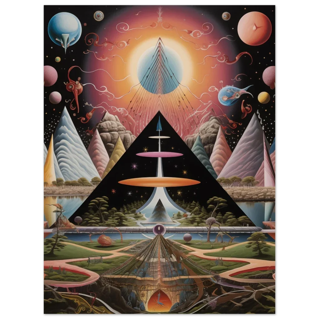 Step into a realm of cosmic wonder and introspection with our ‘Cosmic Enlightenment’ art print. This abstract psychedelic masterpiece, rich with vibrant celestial hues and intricate dreamscapes, invites you to explore new dimensions of thought and imagination. It’s more than just a poster; it’s a window to an otherworldly experience, designed to inspire awe and spark conversation in any space.