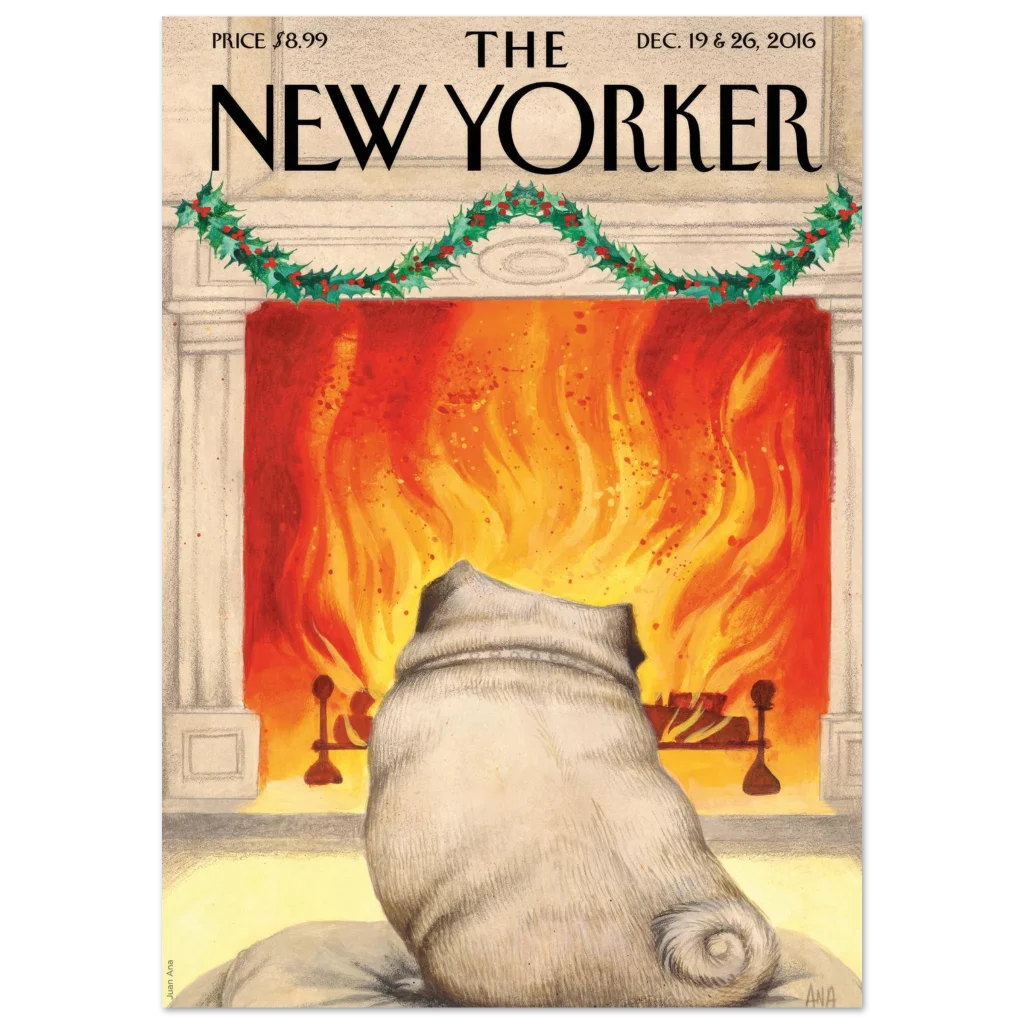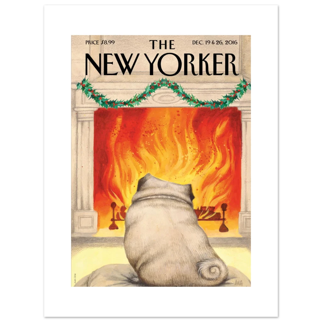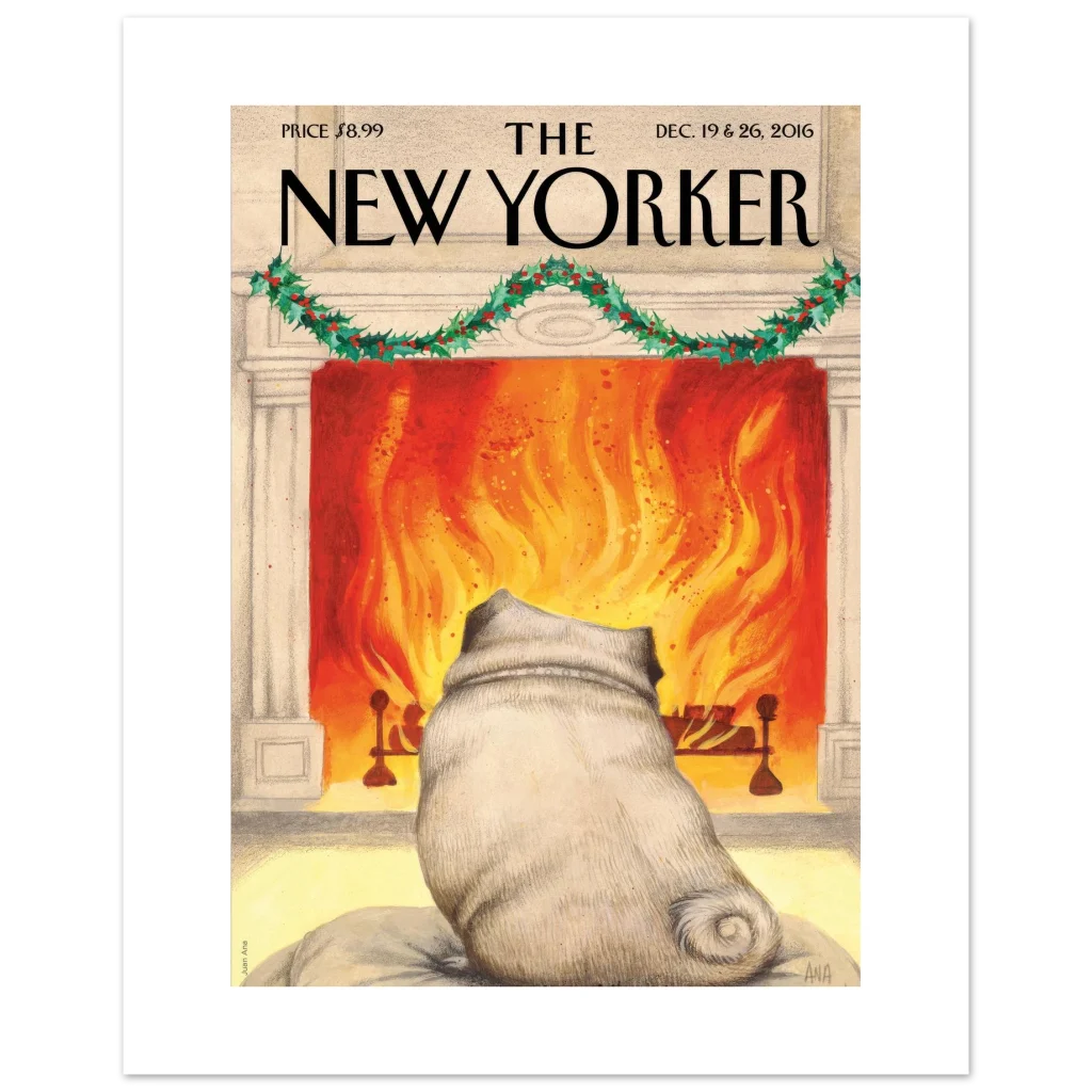 Bring warmth and a touch of whimsical charm to your space with this delightful Fireside Pug poster. Capturing the iconic New Yorker cover art, this piece evokes a cozy holiday mood, perfect for dog lovers and those who appreciate sophisticated yet playful illustrations. The rich, warm hues of the roaring fire and the endearing posture of the pug create an inviting focal point for any room.