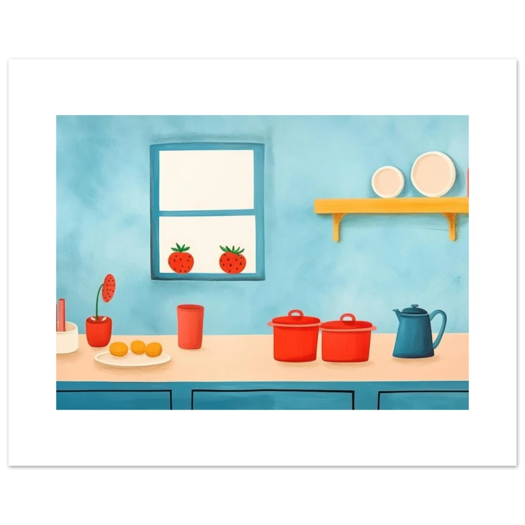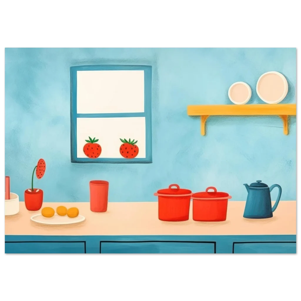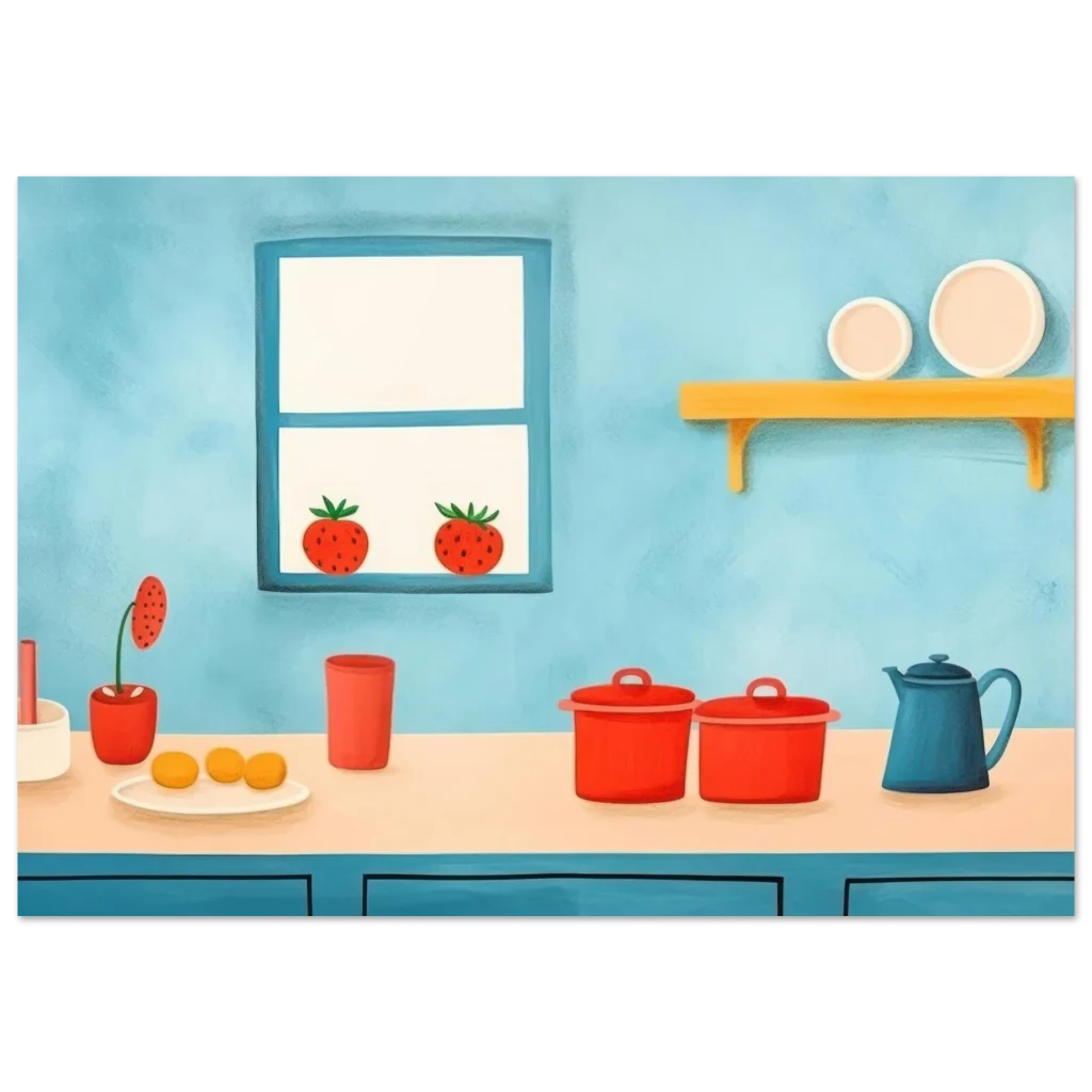 Infuse your living space with the heartwarming charm of a quaint kitchen scene. This art print captures a soothing teal backdrop, vibrant red accents, and playful strawberries, creating an inviting and serene atmosphere. Perfect for adding a touch of cozy elegance and personality to your kitchen, dining area, or any room needing a splash of color and joy.