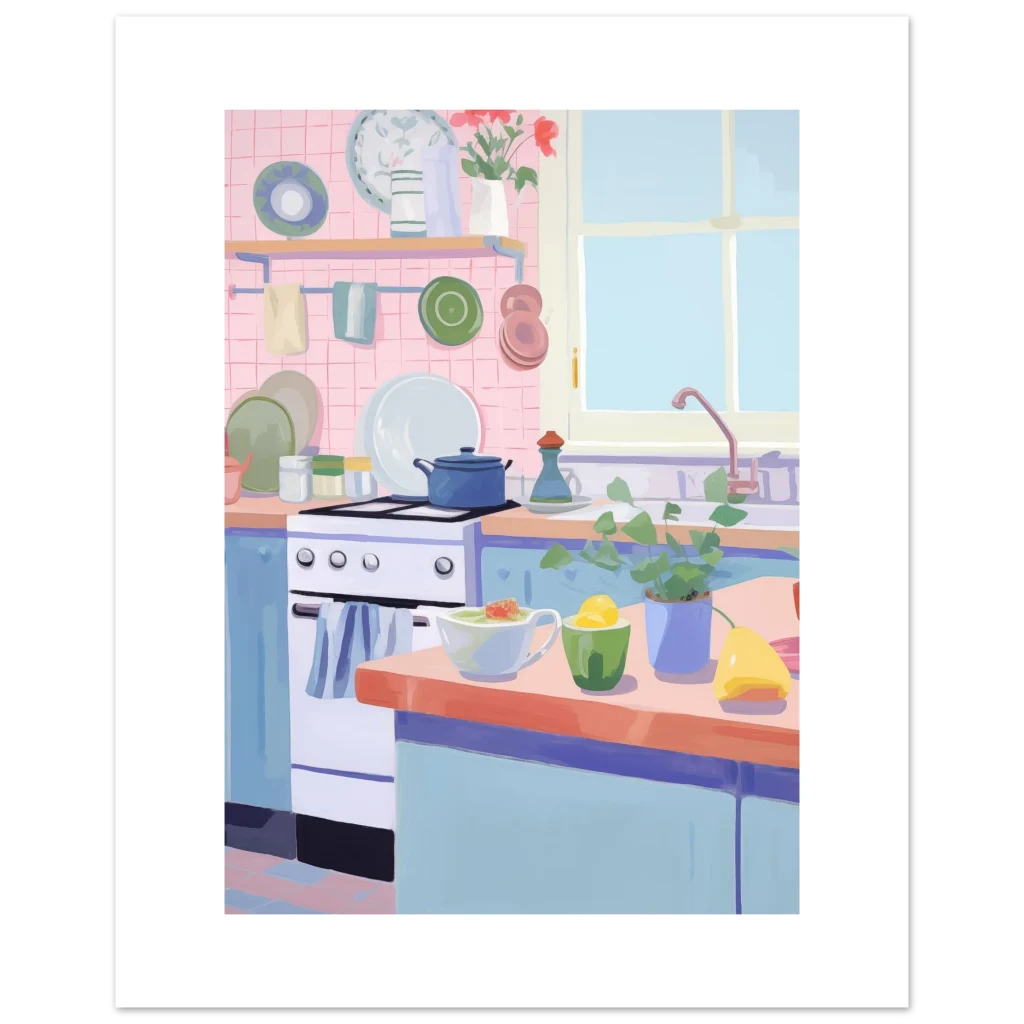 Bring the warmth and charm of a sun-drenched, pastel kitchen into your living space with this delightful poster. Featuring a soothing palette of soft pinks, gentle blues, and lively greens, this artwork captures a serene domestic scene, perfect for adding a touch of cozy elegance to any room. It’s more than just a poster; it’s a window to a peaceful moment, inviting tranquility and a sense of home.