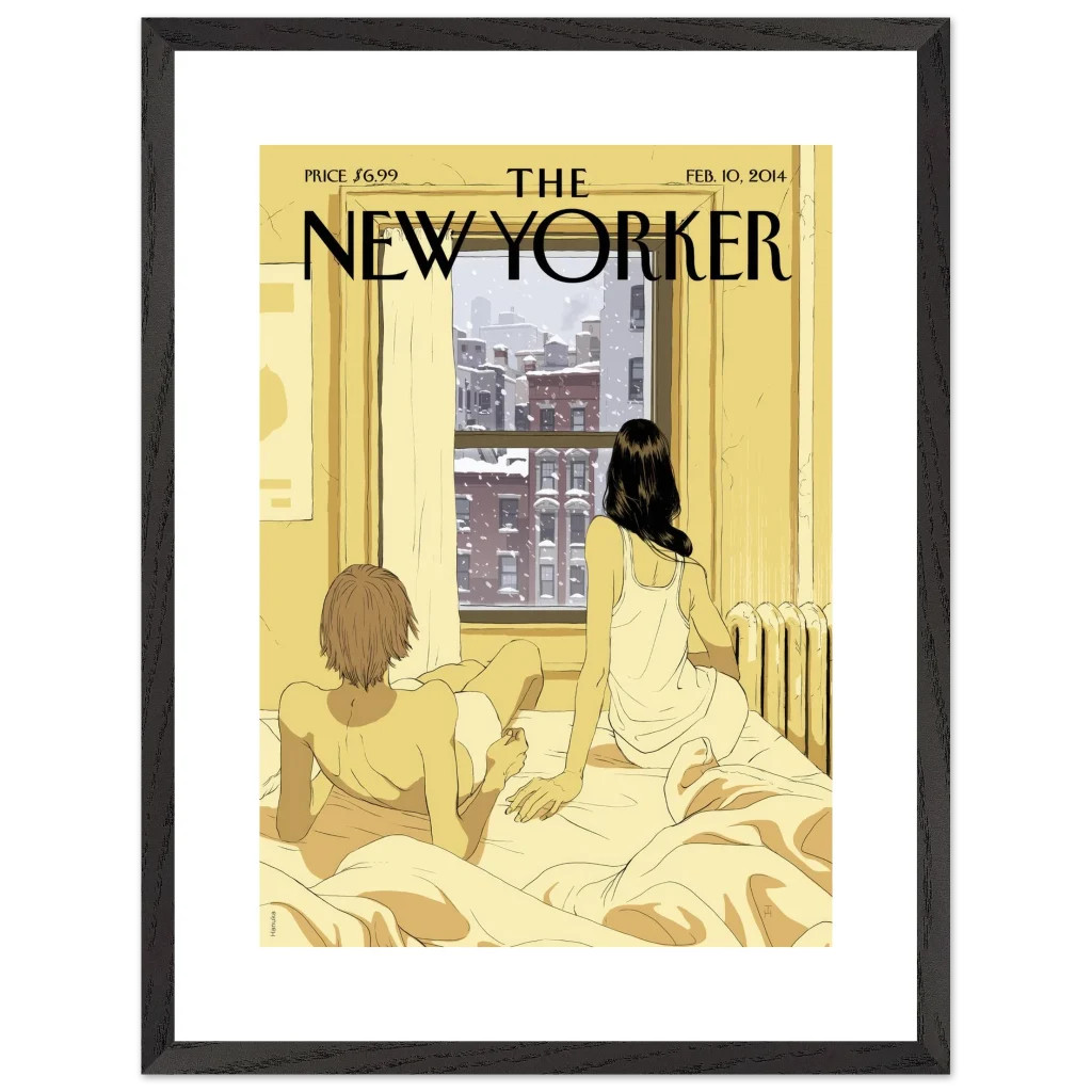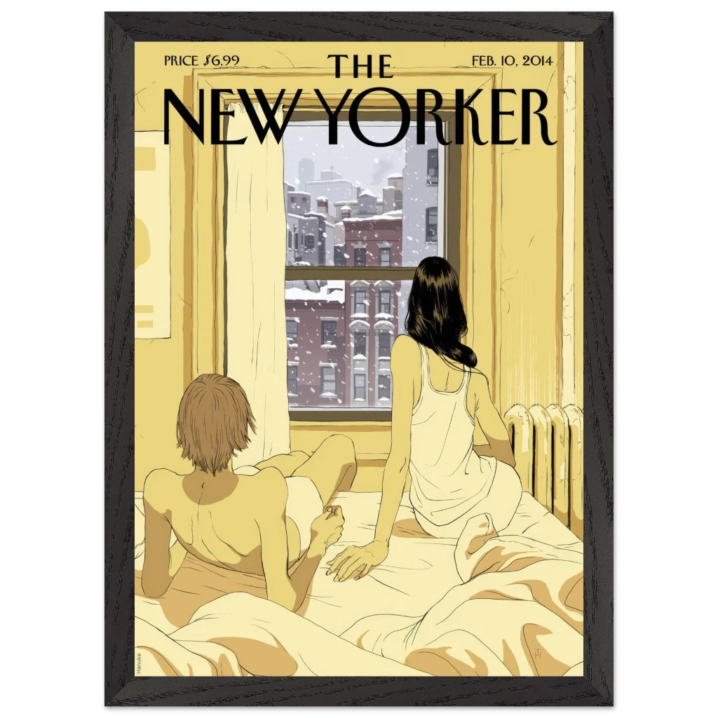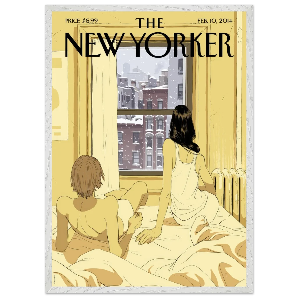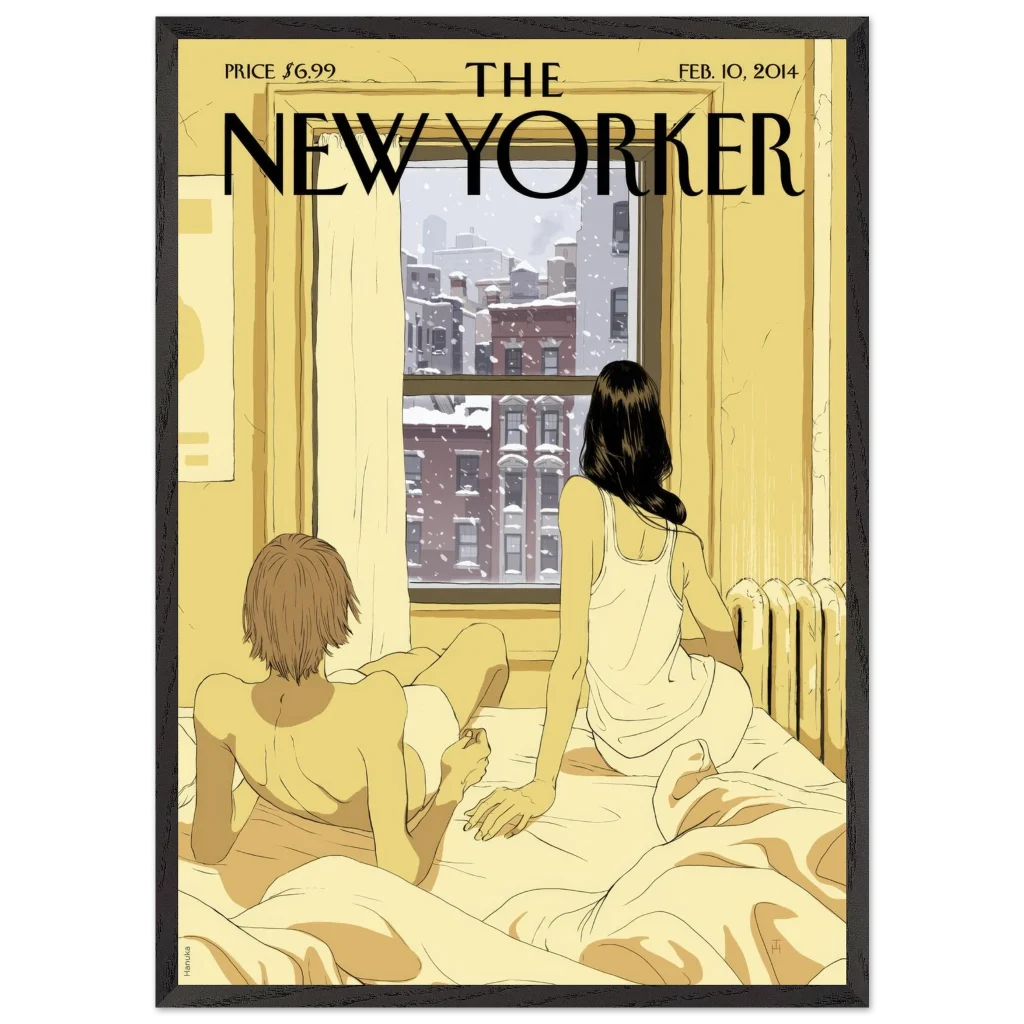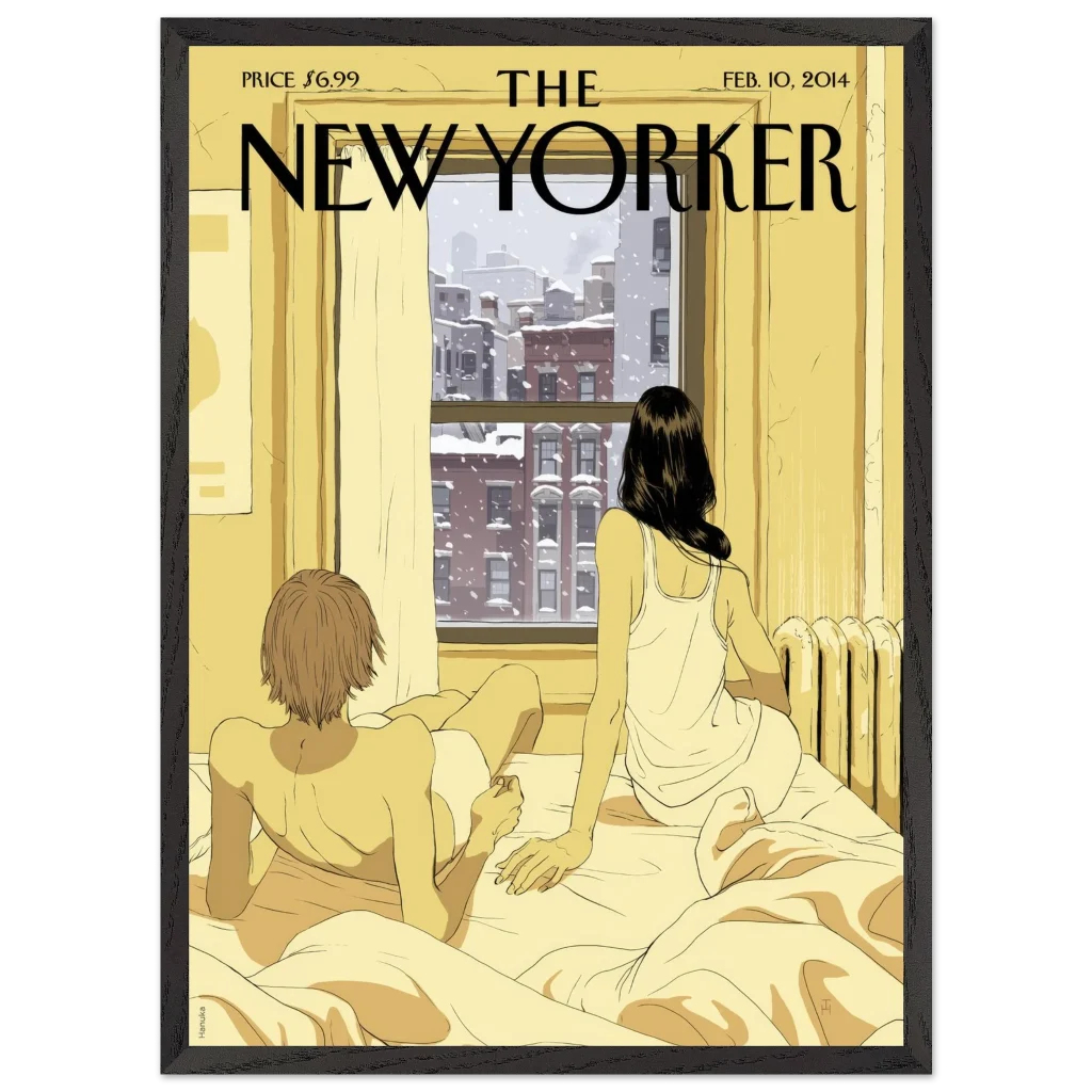 Immerse yourself in the tranquil beauty of a snowy New York morning with this evocative framed poster. Inspired by classic New Yorker cover art, this piece captures the quiet intimacy of two figures gazing out at a snow-covered cityscape. The warm, inviting color palette creates a sense of peaceful contemplation, perfect for bringing a touch of sophisticated calm to your living space, bedroom, or cozy reading nook. It’s more than just a poster; it’s a moment of reflection, beautifully preserved.