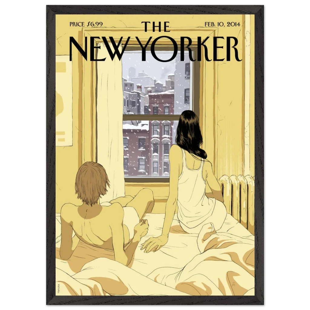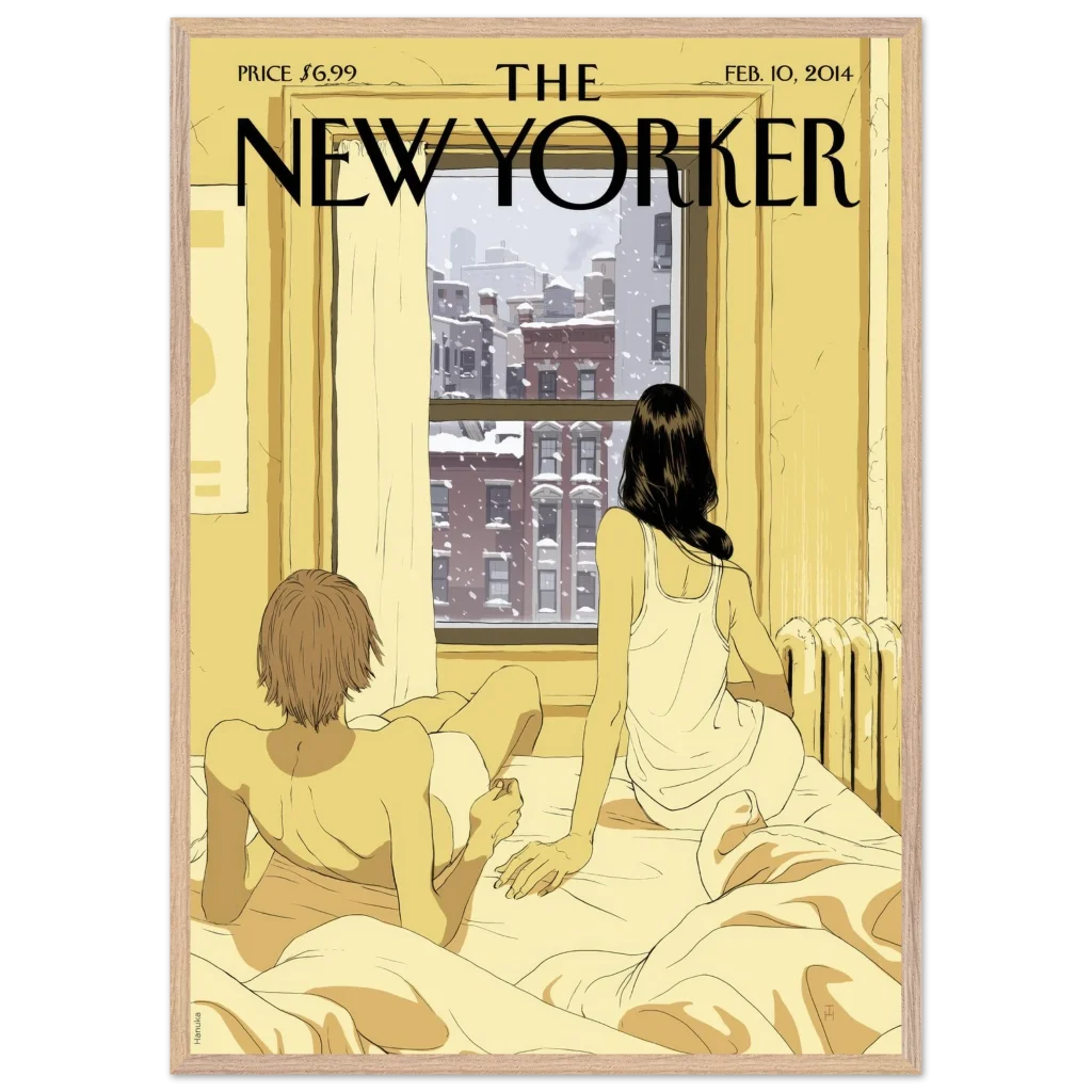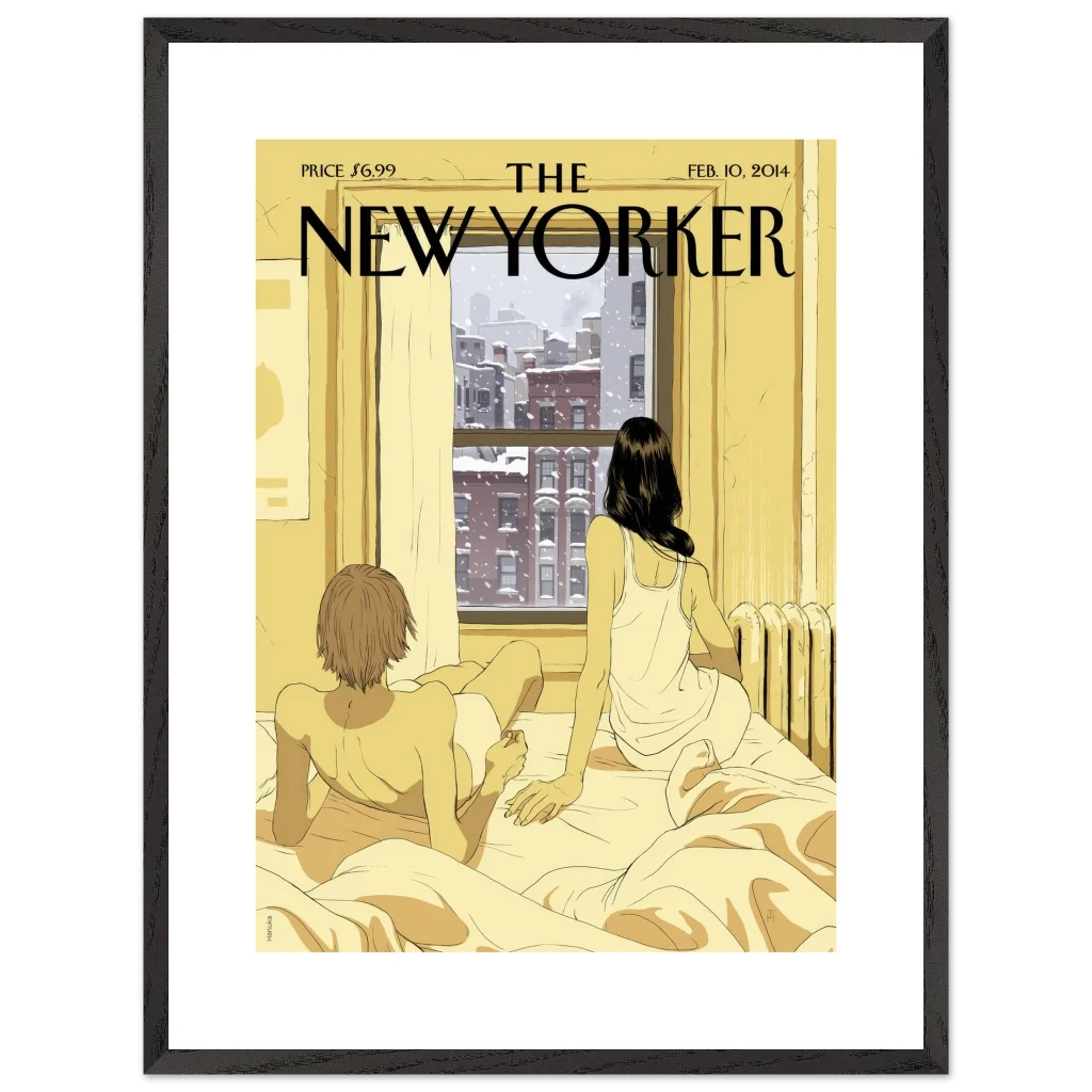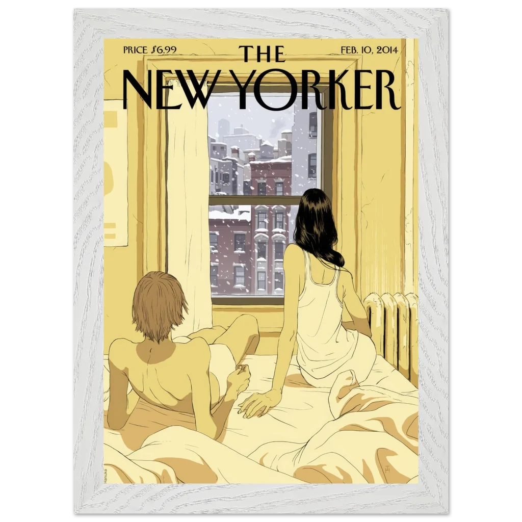 Immerse yourself in the tranquil beauty of a snowy New York morning with this evocative framed poster. Inspired by classic New Yorker cover art, this piece captures the quiet intimacy of two figures gazing out at a snow-covered cityscape. The warm, inviting color palette creates a sense of peaceful contemplation, perfect for bringing a touch of sophisticated calm to your living space, bedroom, or cozy reading nook. It’s more than just a poster; it’s a moment of reflection, beautifully preserved.
