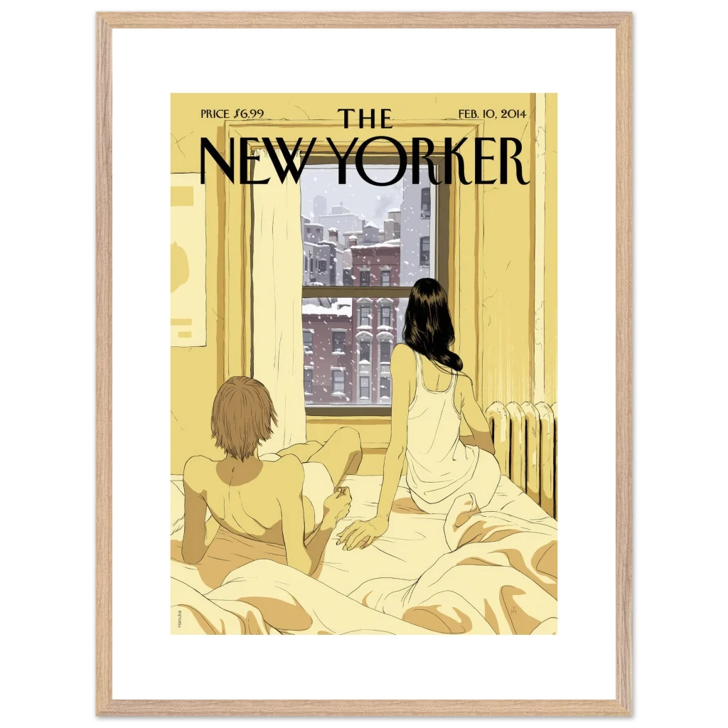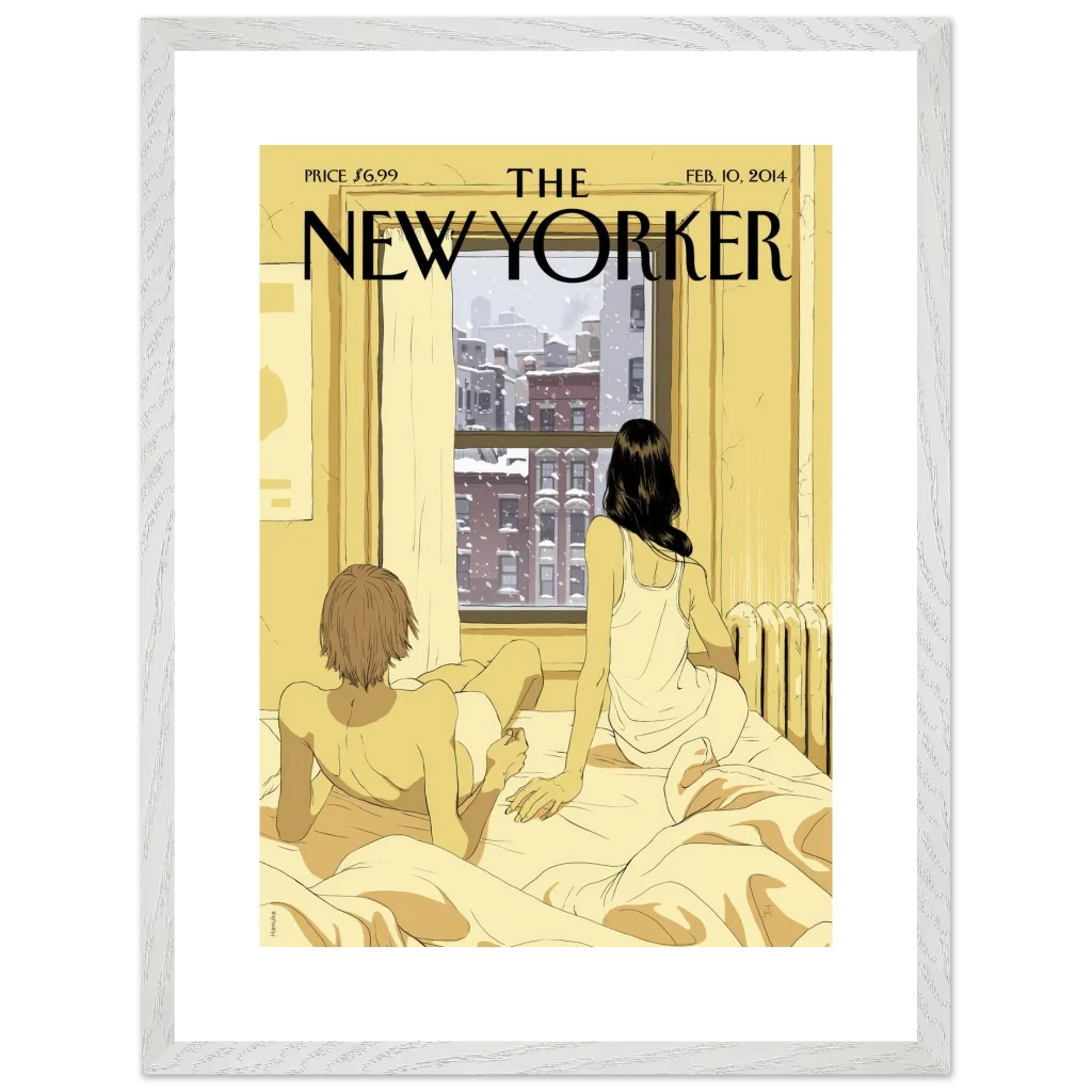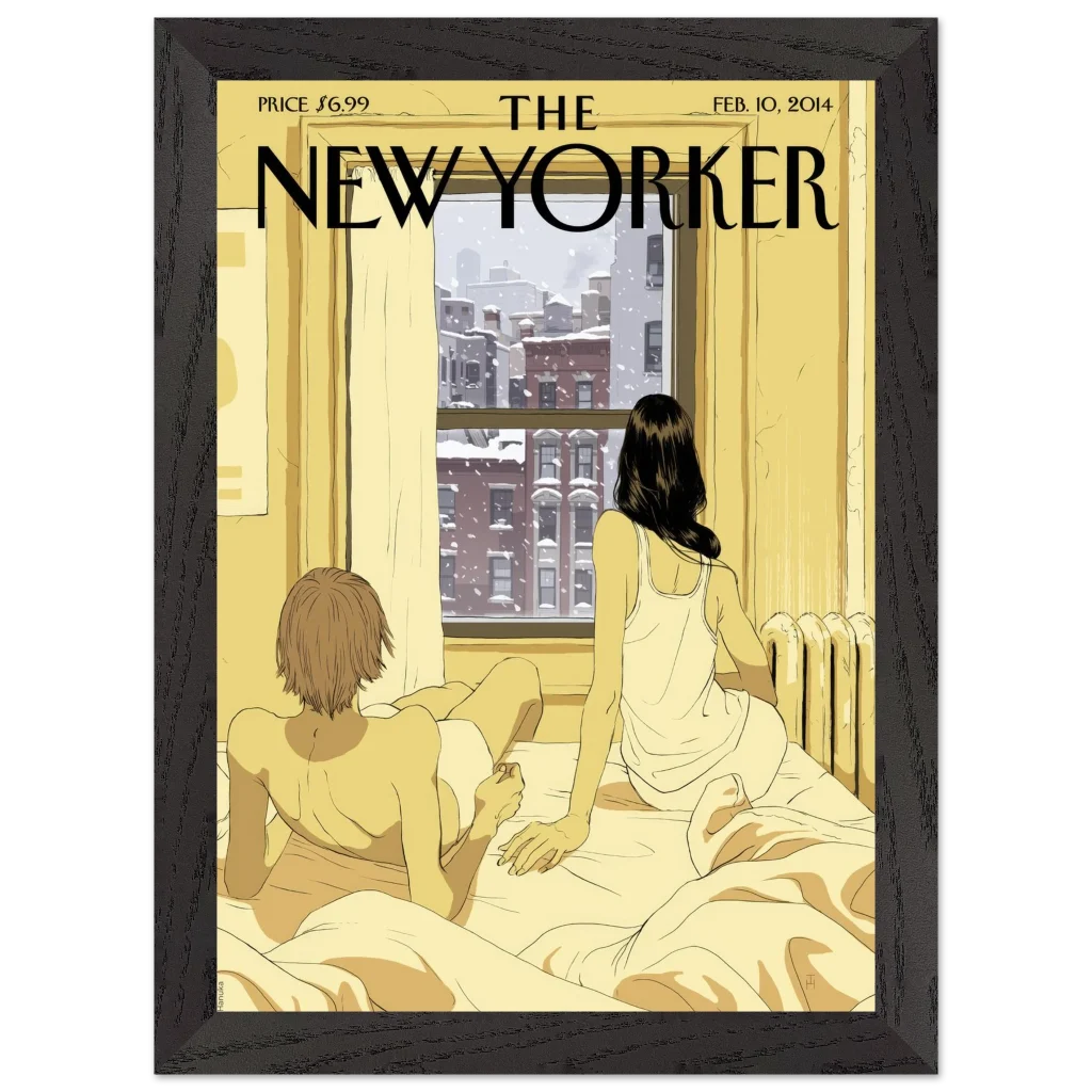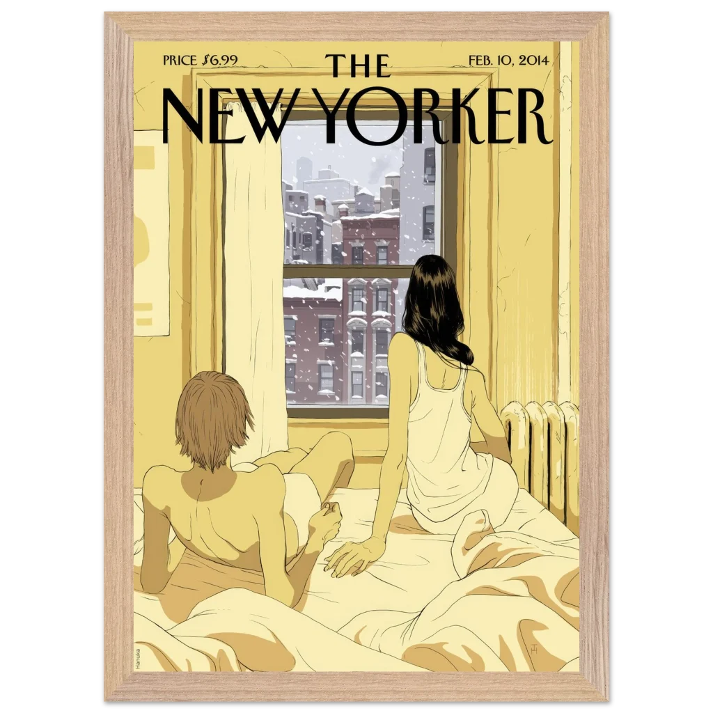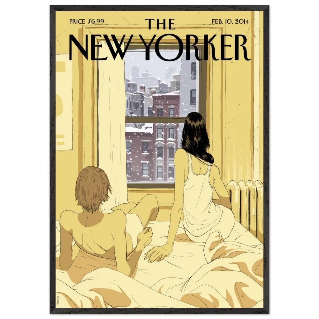 Immerse yourself in the tranquil beauty of a snowy New York morning with this evocative framed poster. Inspired by classic New Yorker cover art, this piece captures the quiet intimacy of two figures gazing out at a snow-covered cityscape. The warm, inviting color palette creates a sense of peaceful contemplation, perfect for bringing a touch of sophisticated calm to your living space, bedroom, or cozy reading nook. It’s more than just a poster; it’s a moment of reflection, beautifully preserved.