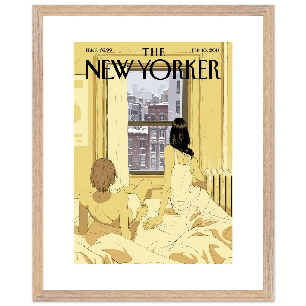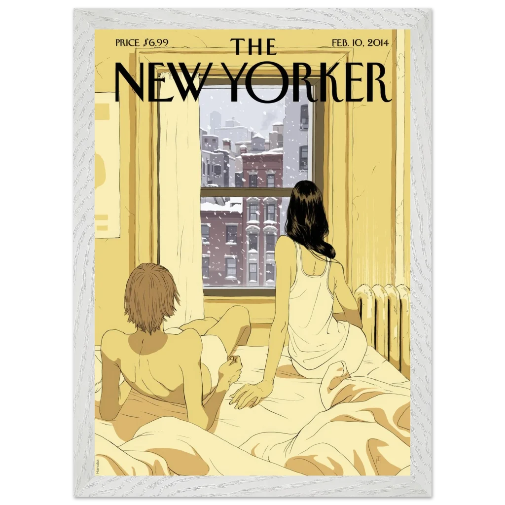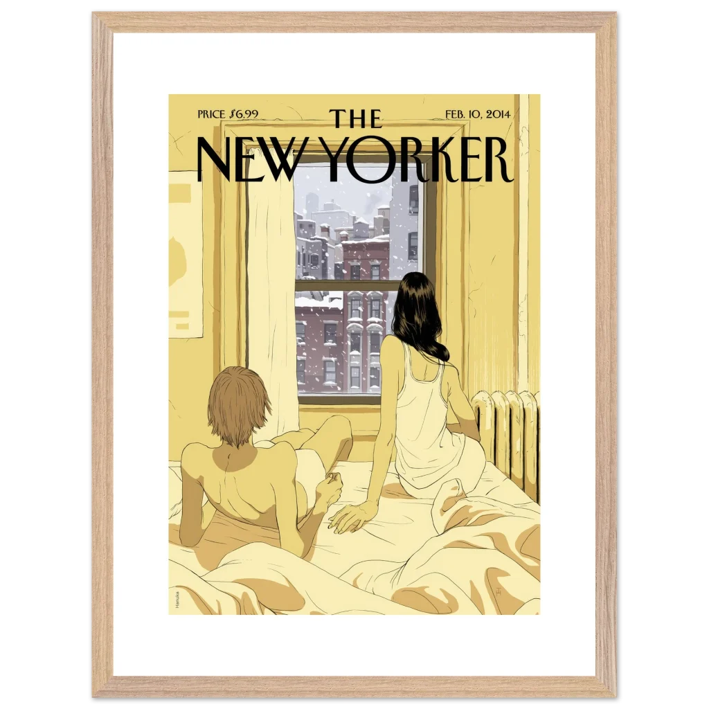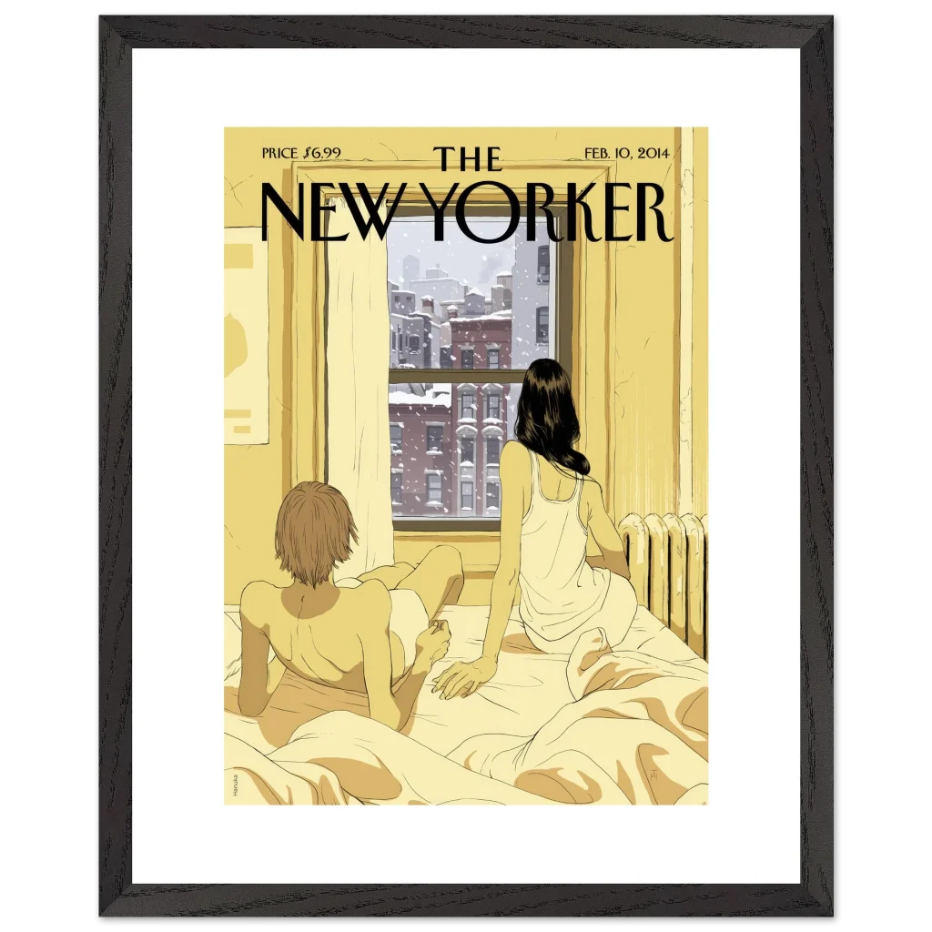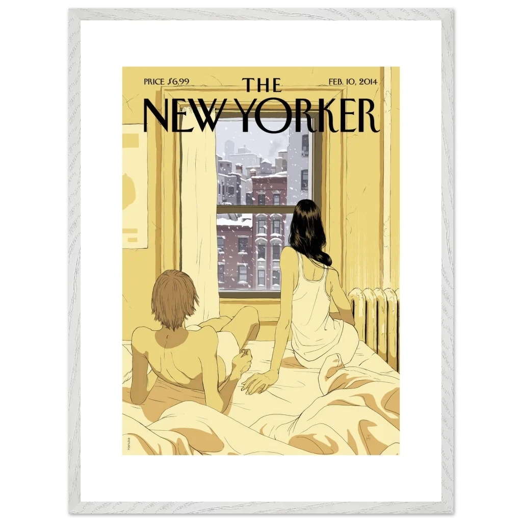 Immerse yourself in the tranquil beauty of a snowy New York morning with this evocative framed poster. Inspired by classic New Yorker cover art, this piece captures the quiet intimacy of two figures gazing out at a snow-covered cityscape. The warm, inviting color palette creates a sense of peaceful contemplation, perfect for bringing a touch of sophisticated calm to your living space, bedroom, or cozy reading nook. It’s more than just a poster; it’s a moment of reflection, beautifully preserved.