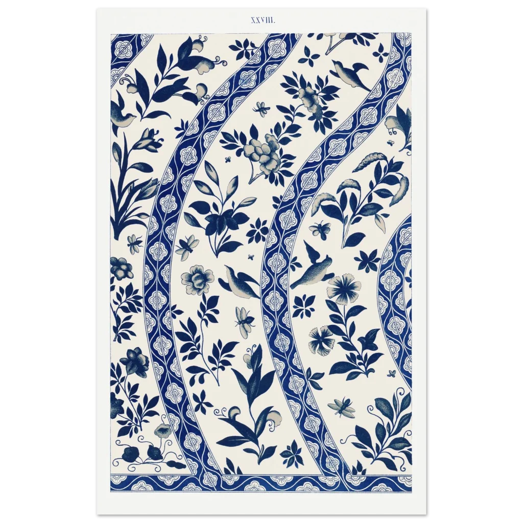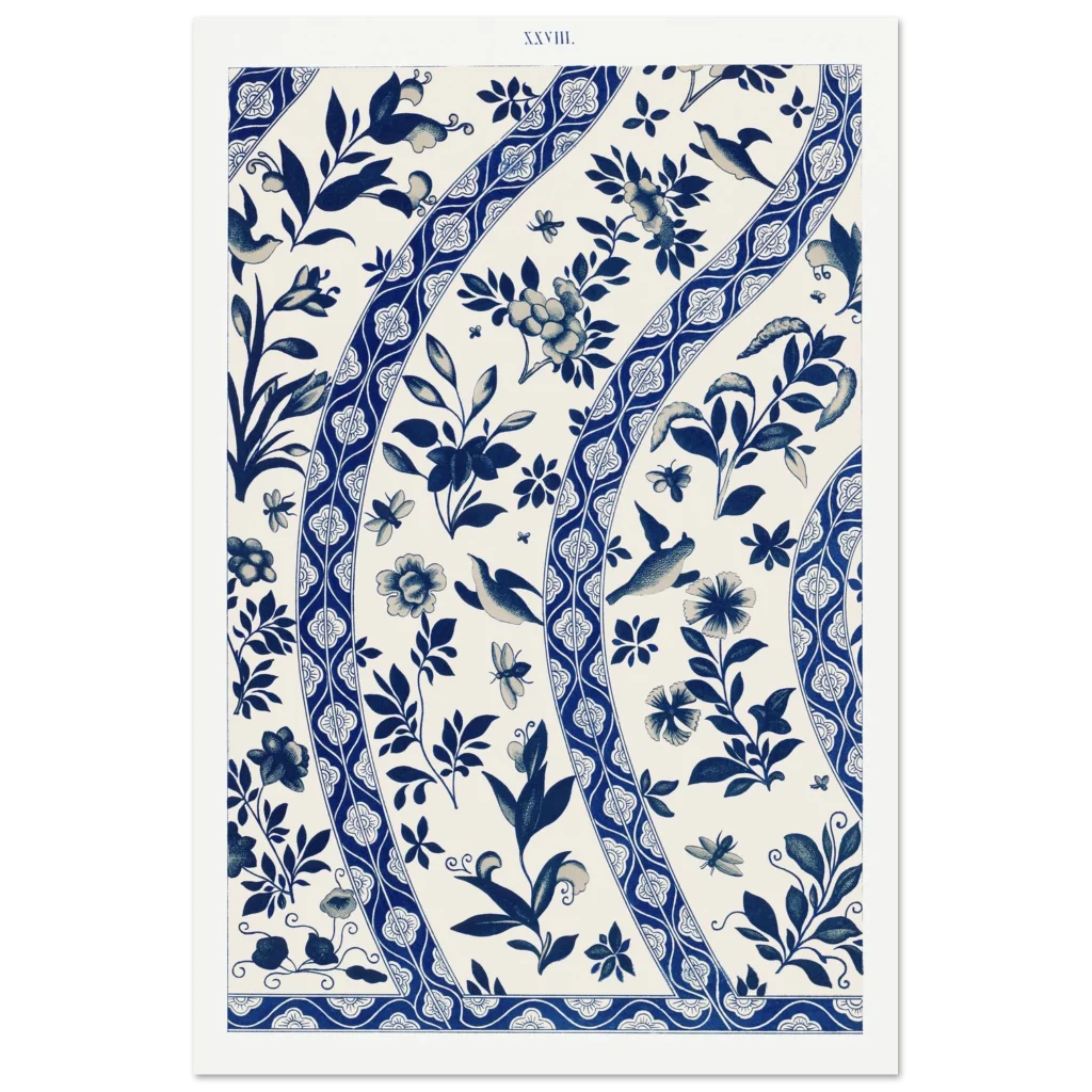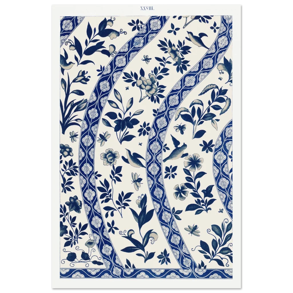 Delft Blue Floral & Avian Botanical Art Print – Premium Matte Paper Poster with Classic Pattern