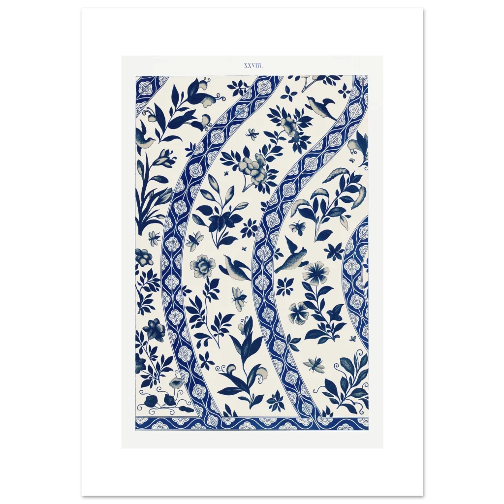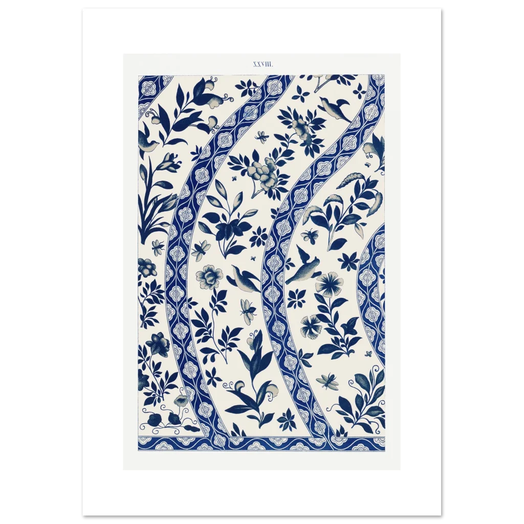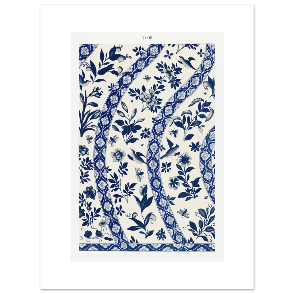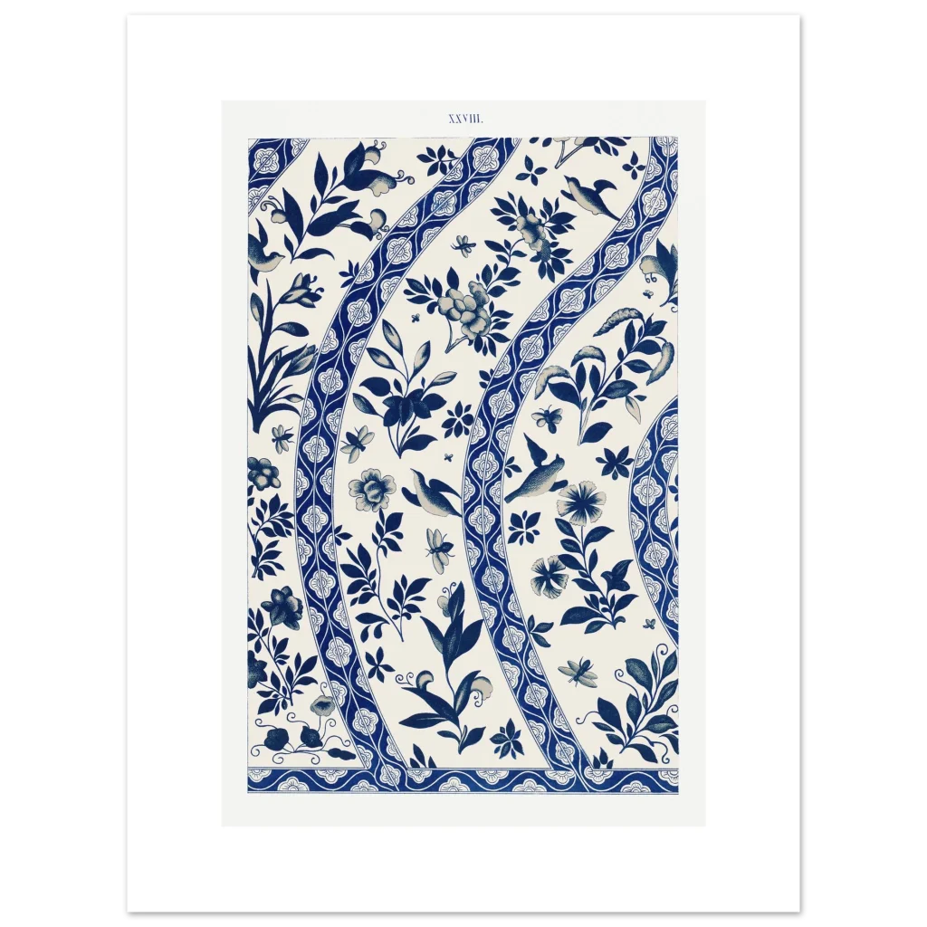 Delft Blue Floral & Avian Botanical Art Print – Premium Matte Paper Poster with Classic Pattern