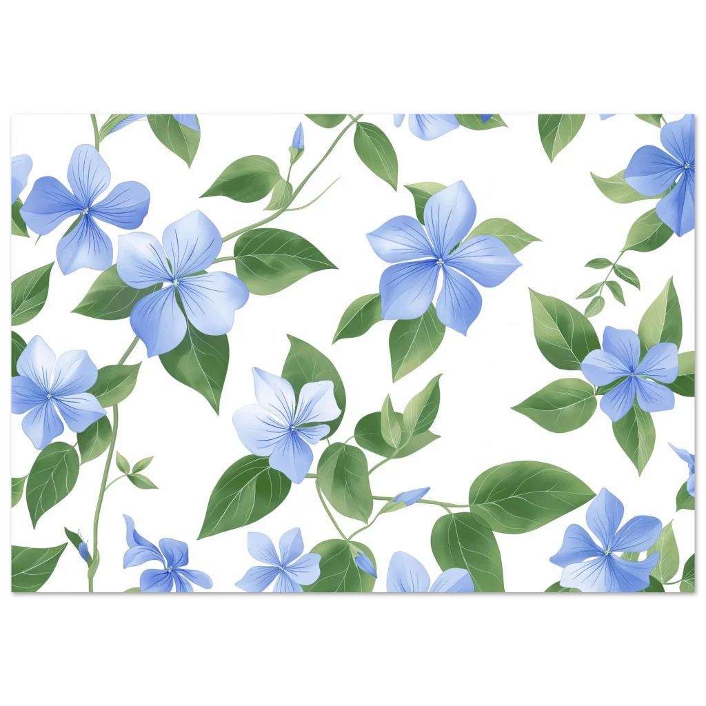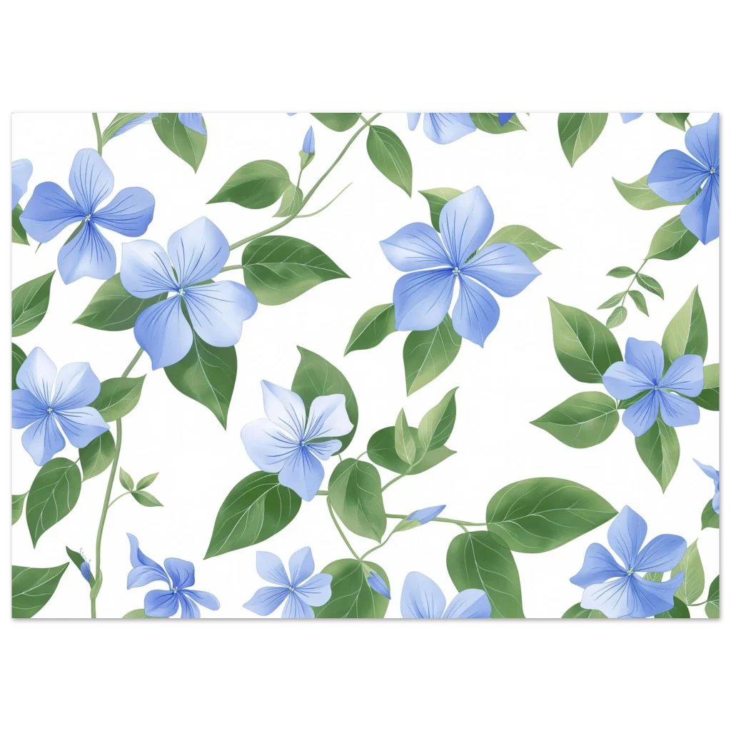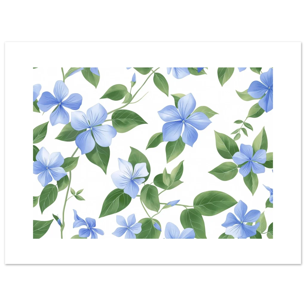 Bring the serene beauty of nature indoors with our exquisite botanical print, featuring delicate blue blooms and lush green foliage. This artwork captures a tranquil, fresh aesthetic, perfect for adding a touch of peaceful elegance to any room. Experience art that feels silky to the touch with our high-quality, lighter-weight, classic semi-glossy paper, designed to make every detail pop.