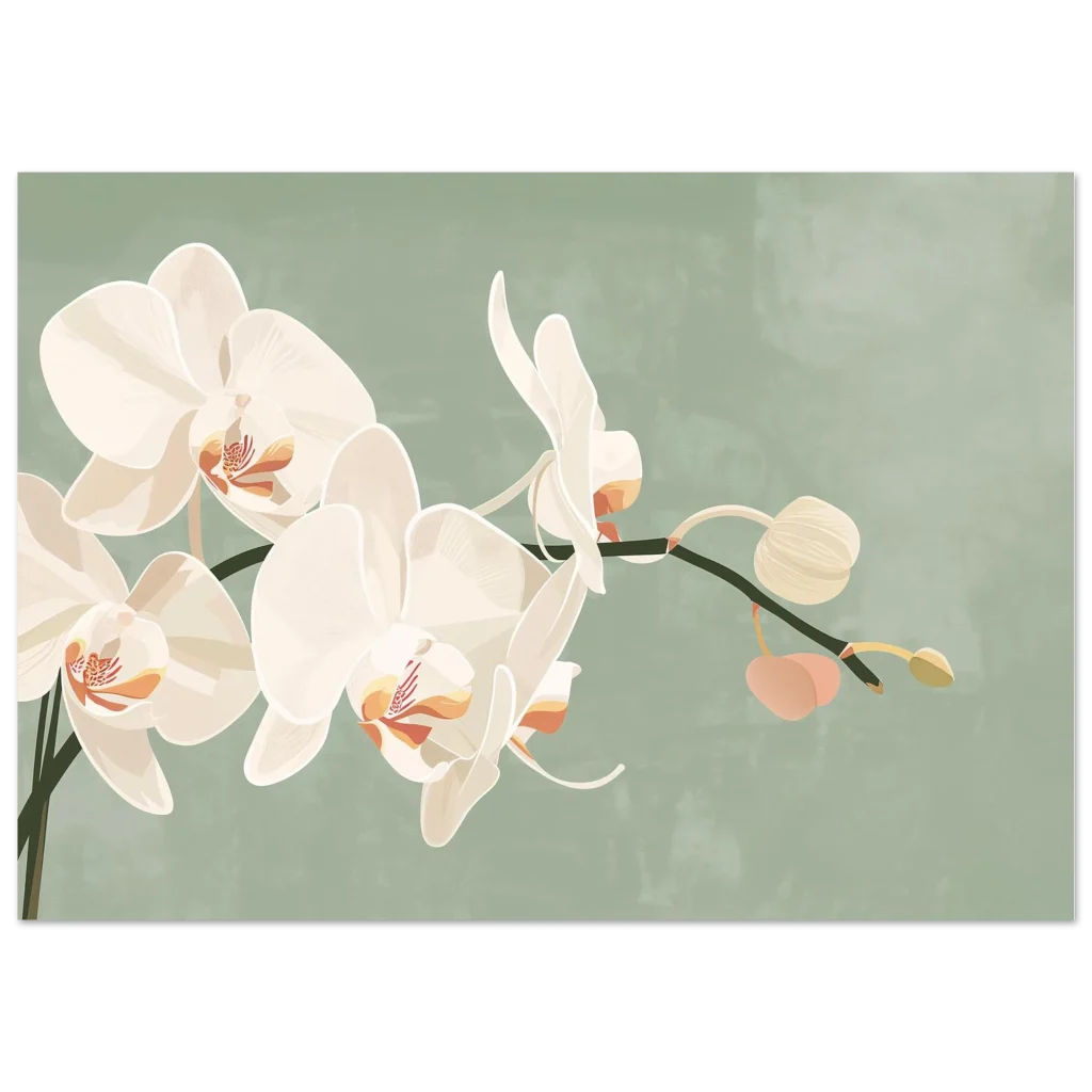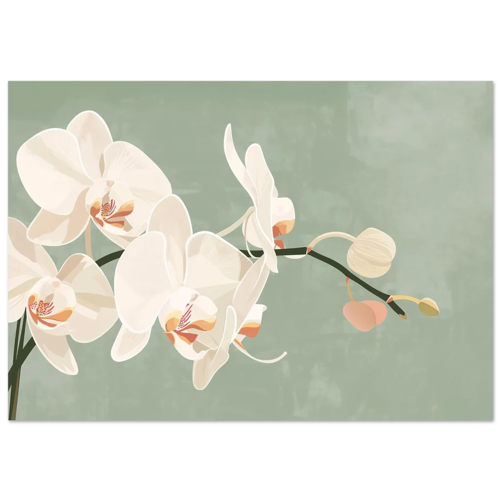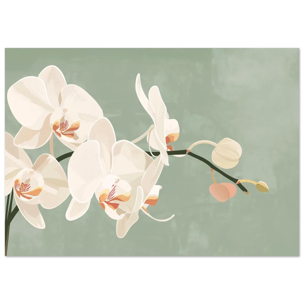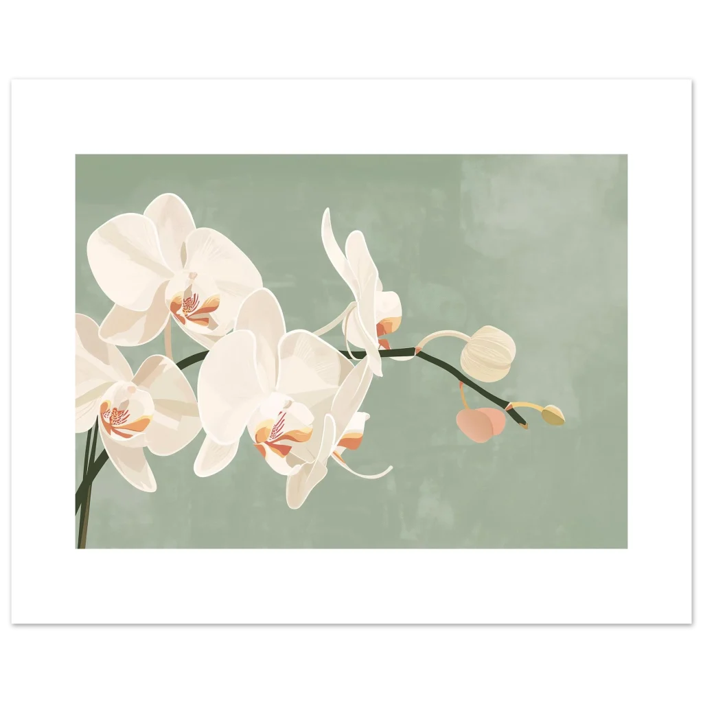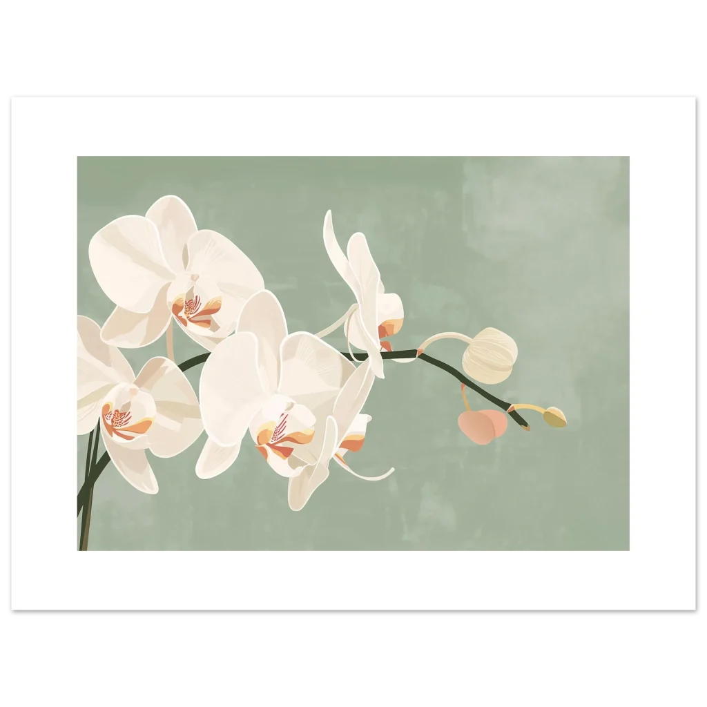 Bring a touch of serene elegance and natural beauty into your home with this exquisite orchid botanical print. The soft, creamy white petals of the orchids, set against a calming sage green backdrop, create a sophisticated and tranquil aesthetic that complements any decor. Each delicate detail is rendered with an artistic touch, inviting a sense of peaceful contemplation and botanical wonder into your space.